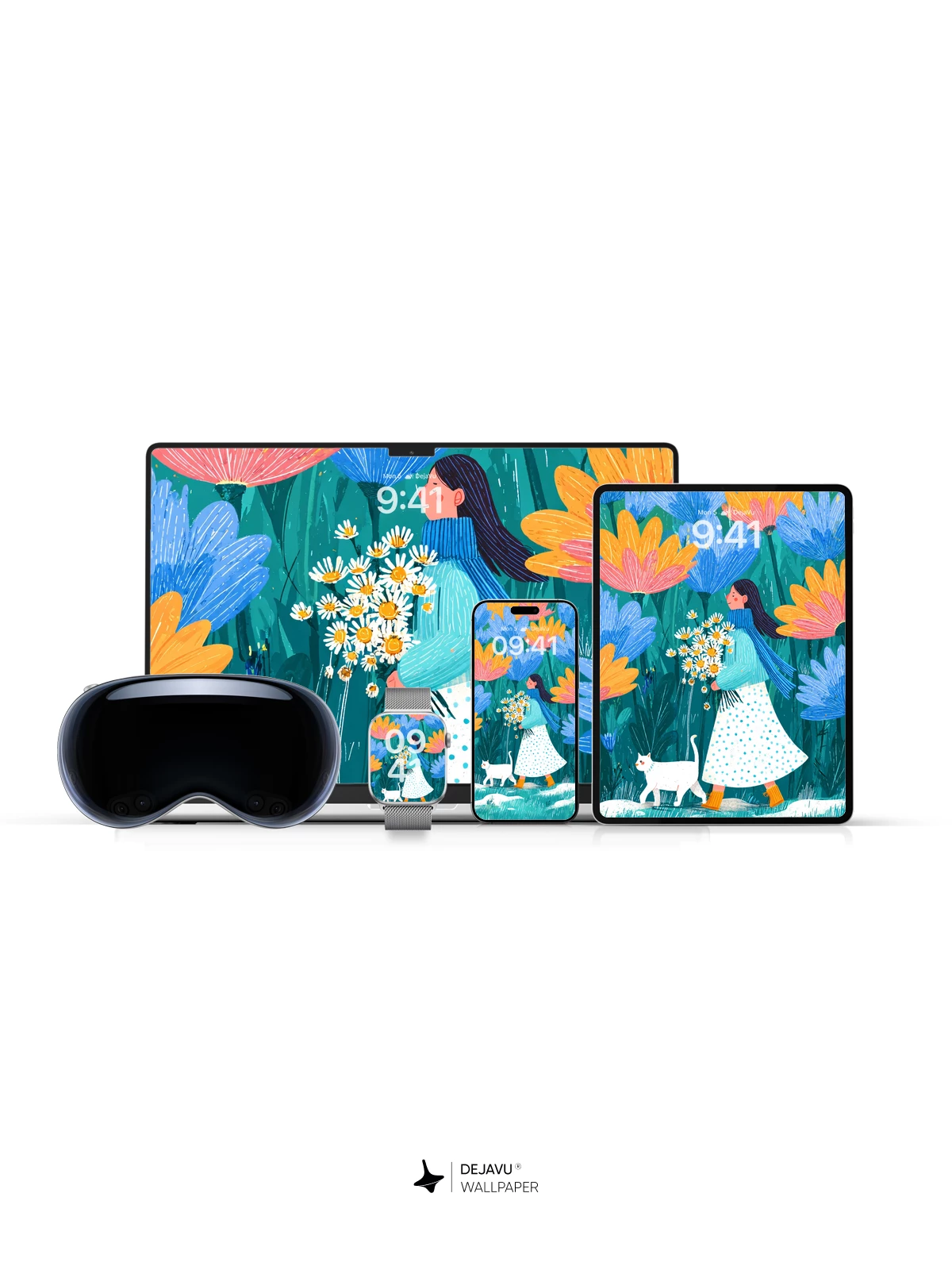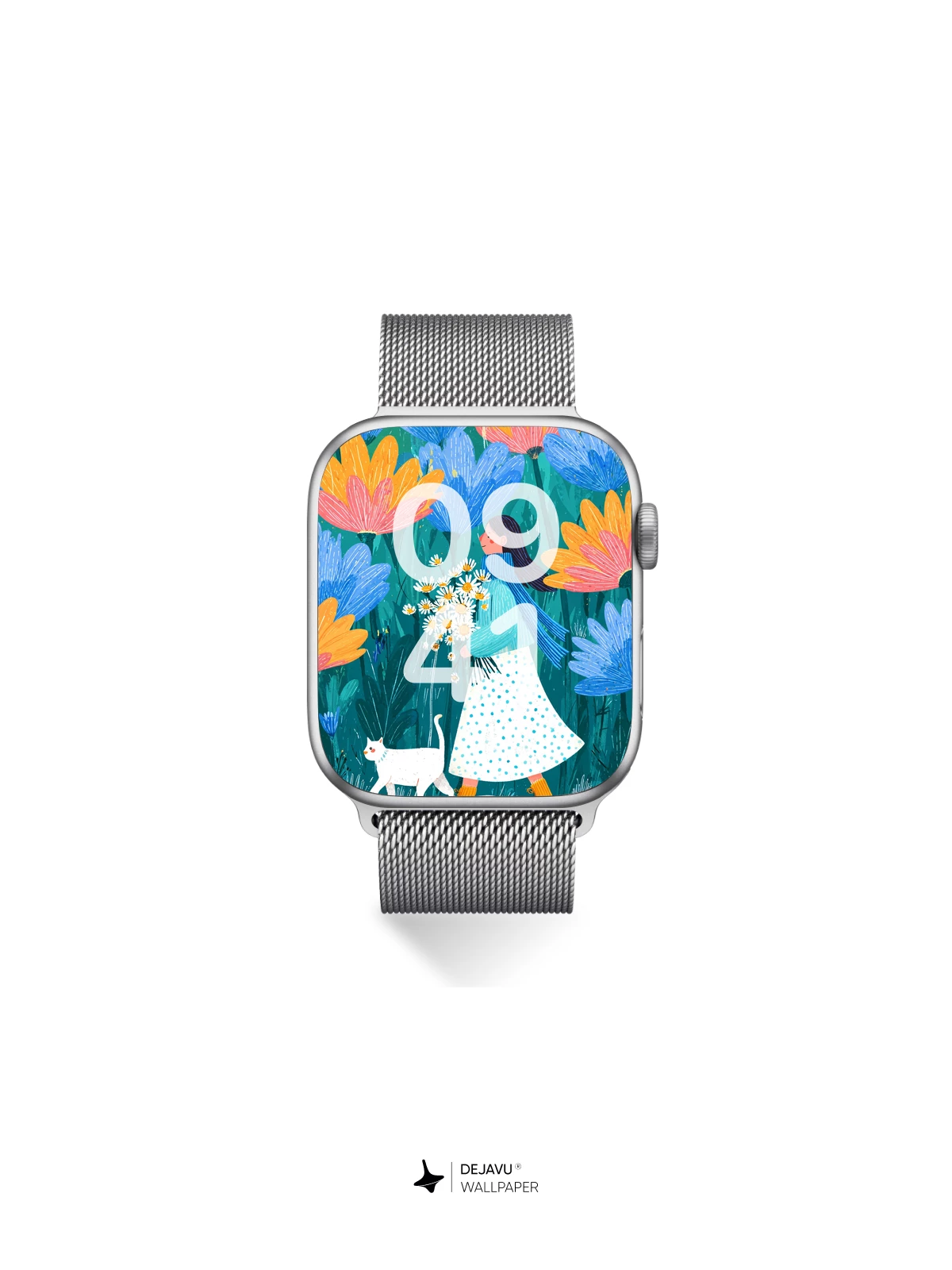 This enchanting 8K wallpaper captures a serene moment in a surreal garden where giant blue and orange flowers tower over a young woman in a polka-dot dress, holding a bouquet of daisies, accompanied by a curious white cat. The artwork, inspired by modern illustrative styles with bold colors and expressive linework, evokes a sense of peaceful wonder and timeless connection to nature. Ideal for iPhone, Android, and tablet screens, this high-resolution design transforms your device into a portal to a magical world—where every glance feels like stepping into a storybook.”.