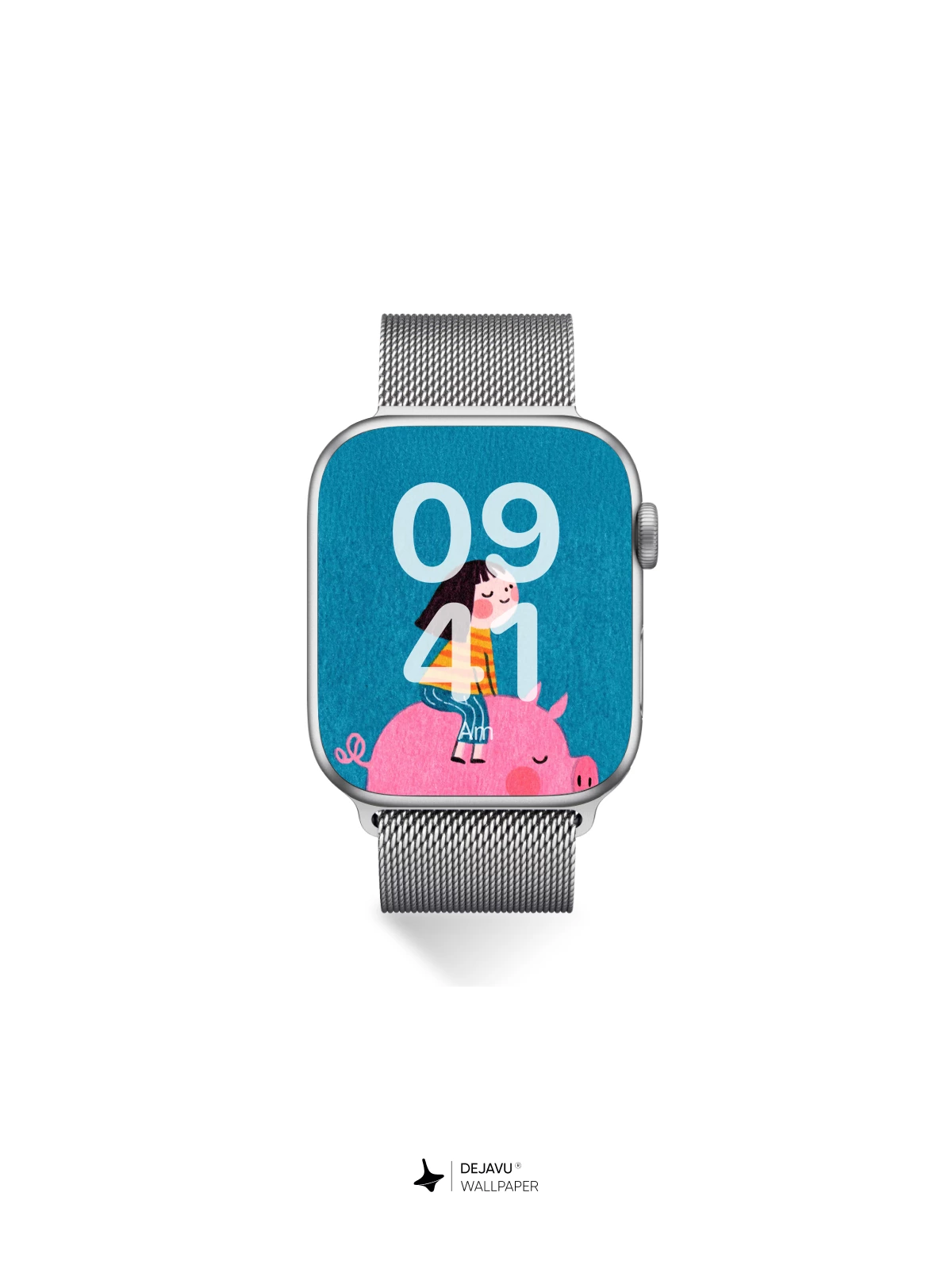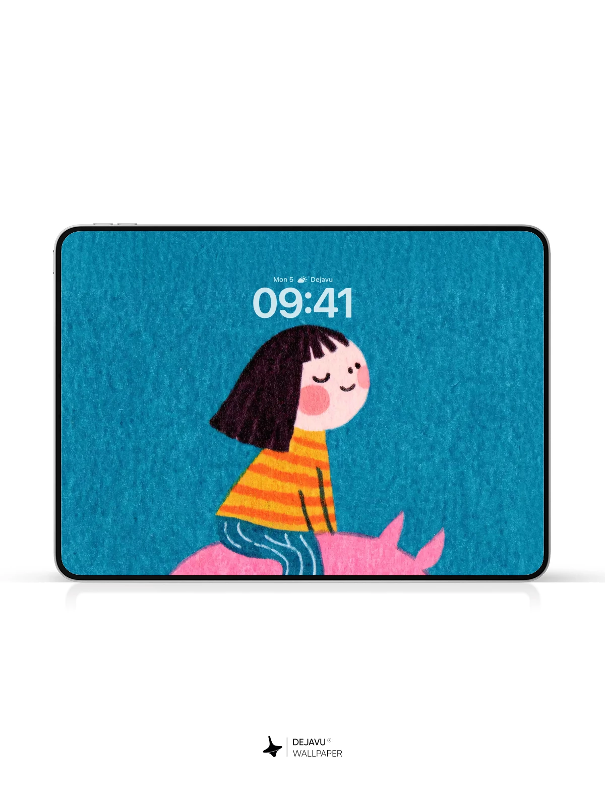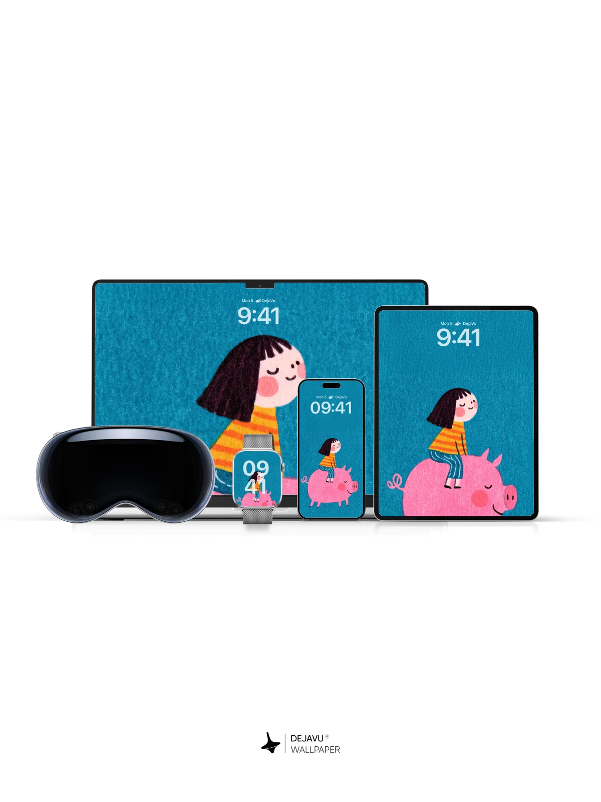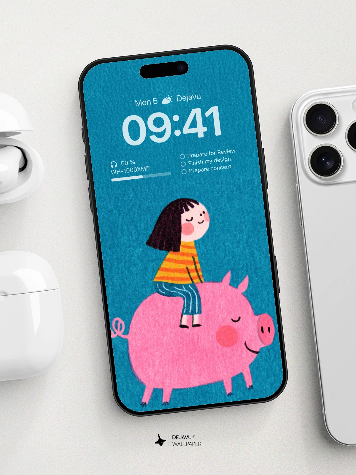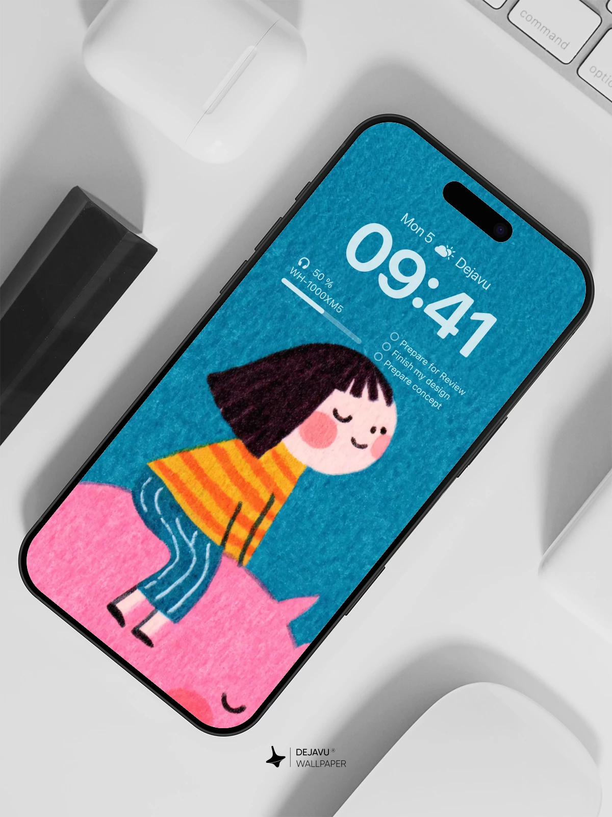 This delightful illustration features a cheerful girl in a striped shirt riding a contented pink pig, both with closed eyes and soft smiles, set against a rich teal backdrop. The playful, hand-drawn style evokes a sense of innocence and whimsy, making it an ideal 8K wallpaper for iPhone, Android, or tablet users who love cute, imaginative designs. The pastel tones and gentle lines create a soothing yet joyful atmosphere, perfect for adding a touch of fantasy to your mobile screen.