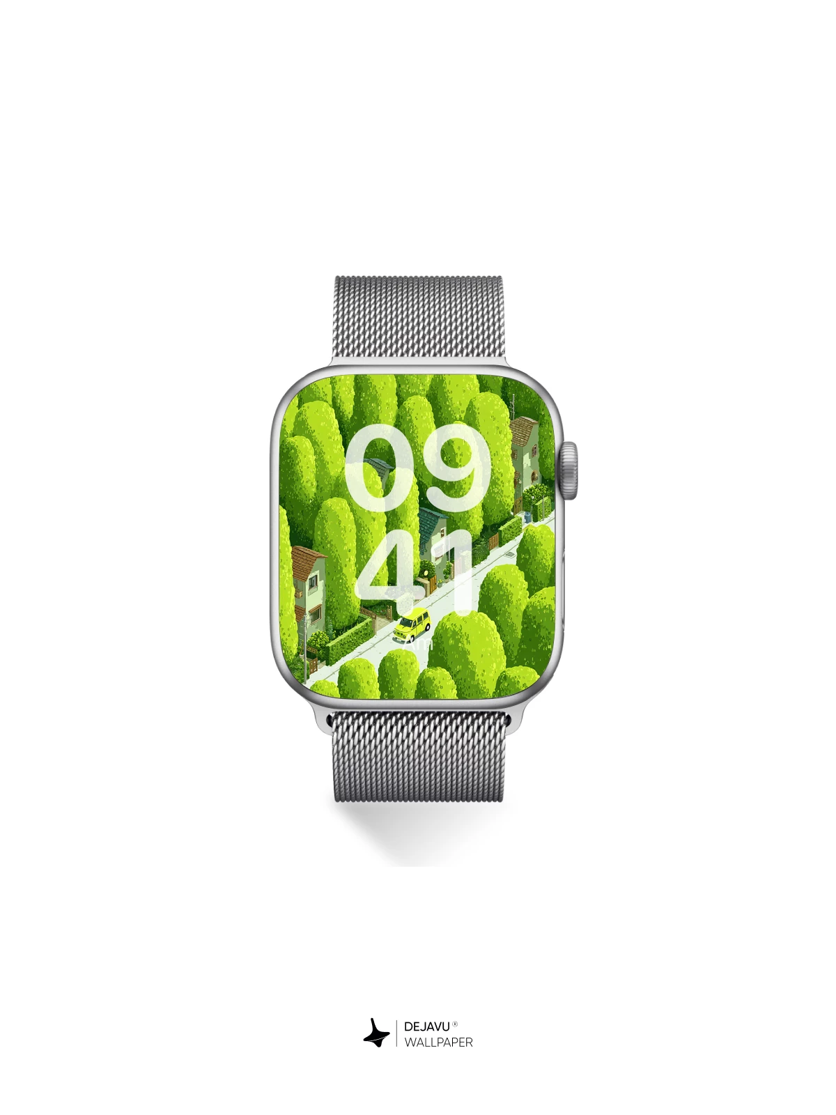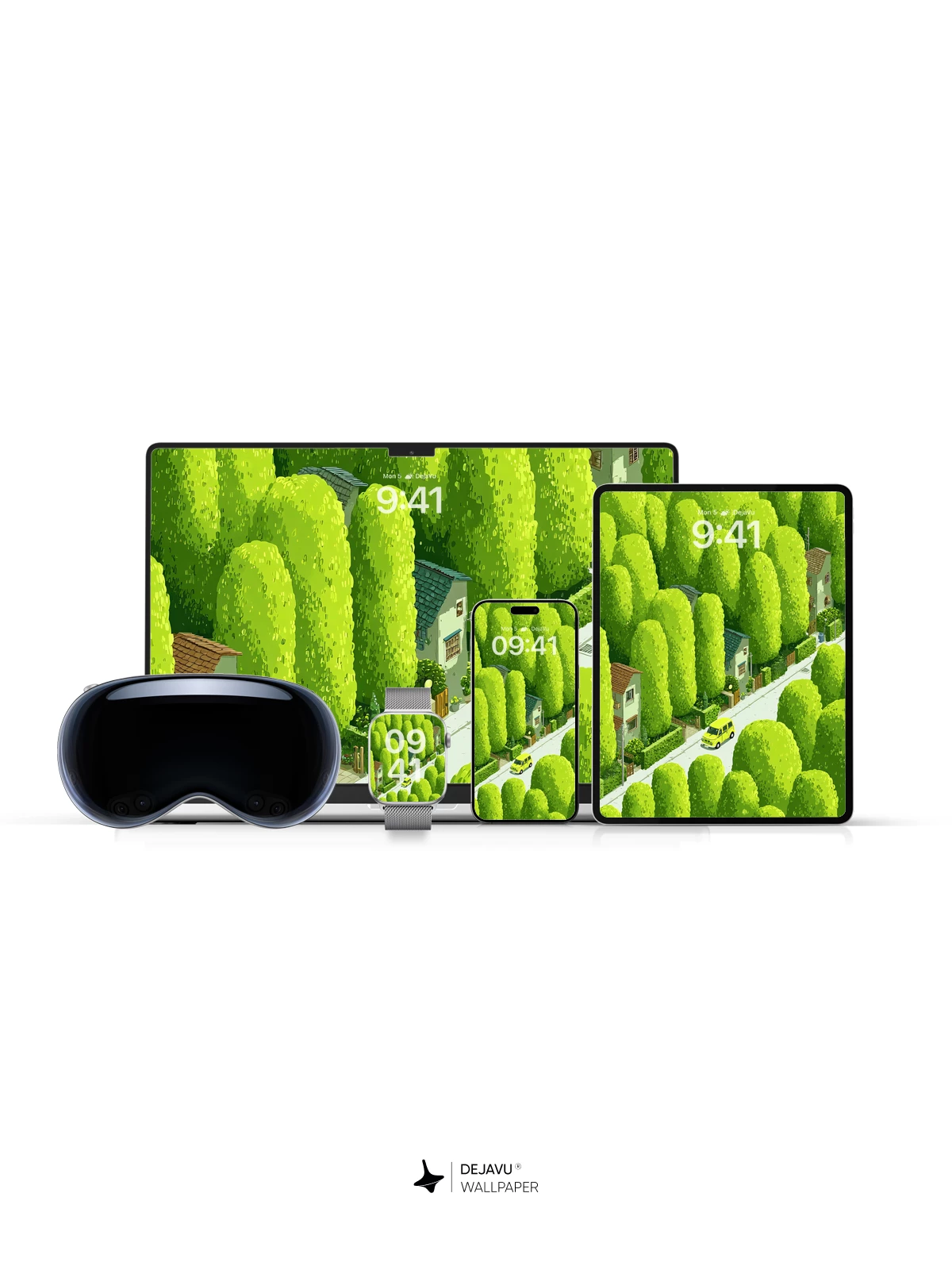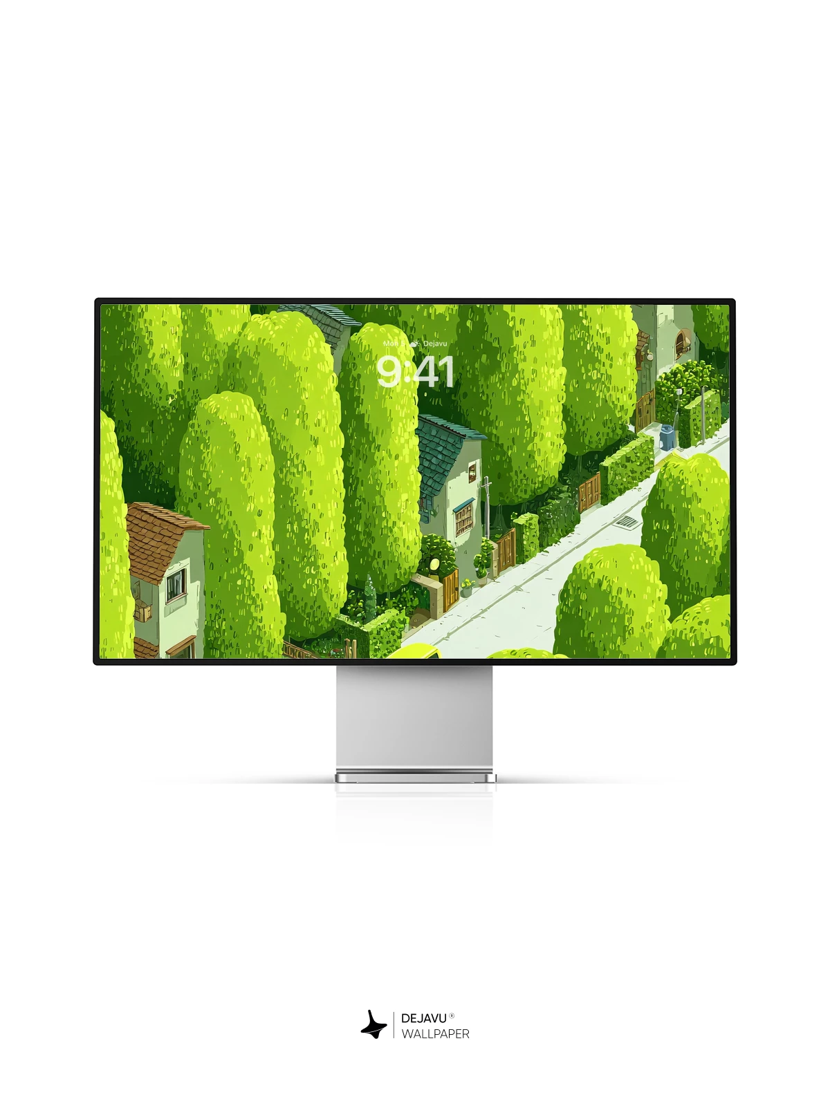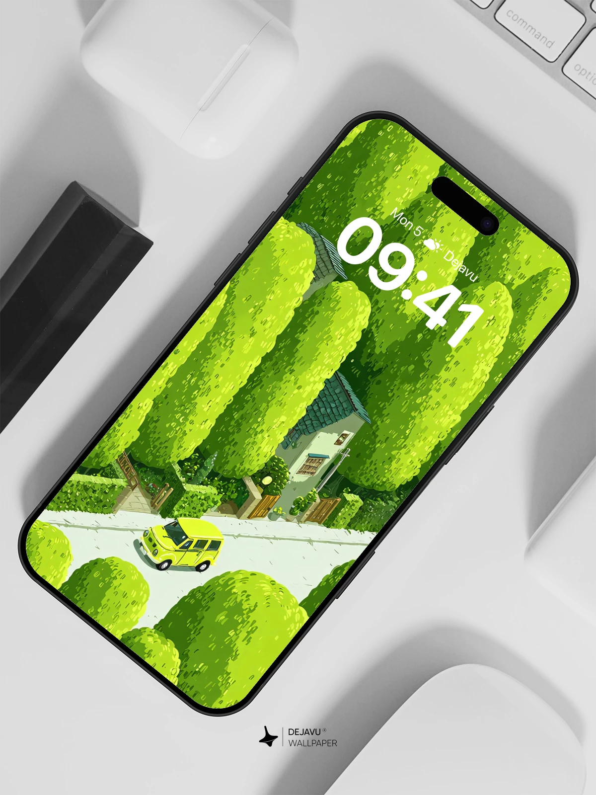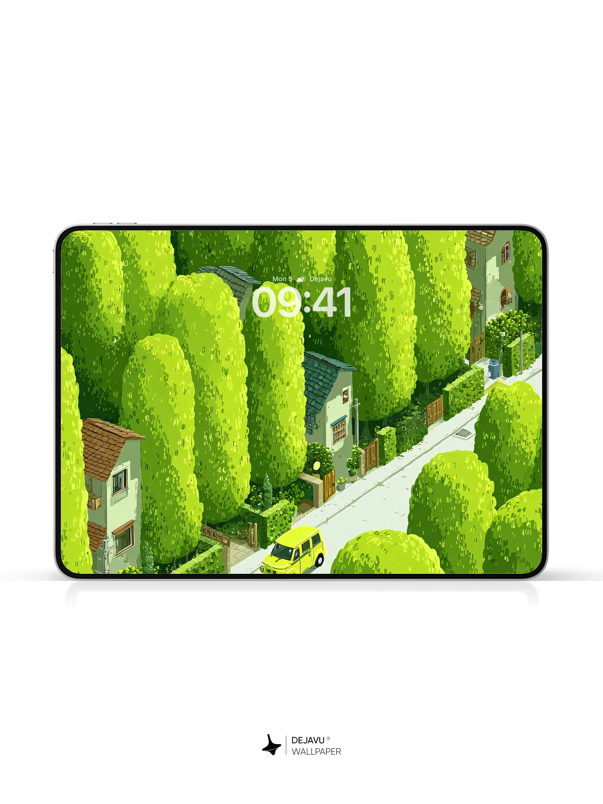 This delightful illustration captures a serene, tree-lined village with soft pastel homes and a cheerful yellow car winding through the scene. The pixel-art inspired style brings a nostalgic, playful charm reminiscent of classic animated worlds. With its vibrant greens and cozy atmosphere, it evokes feelings of peace and wonder, making it a perfect 8K wallpaper for iPhone, Android, or any tablet seeking a touch of whimsy in everyday digital life.