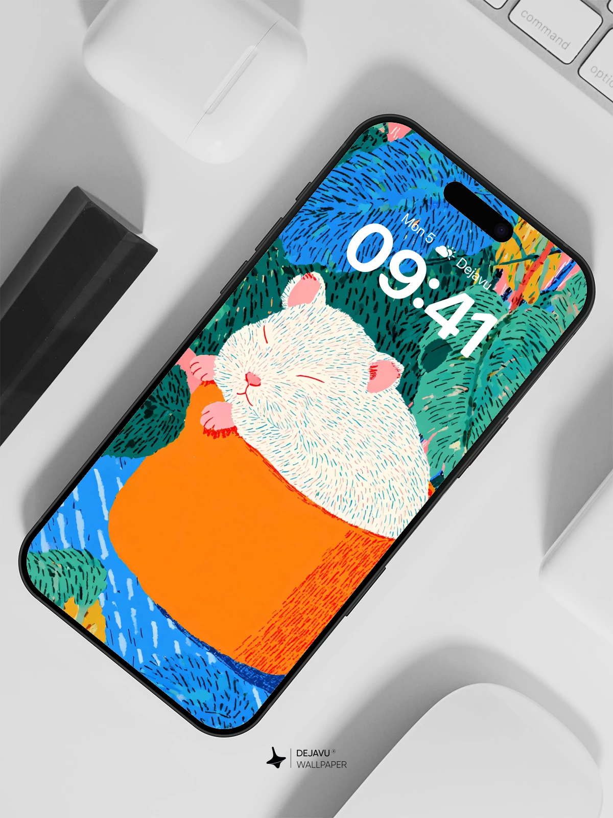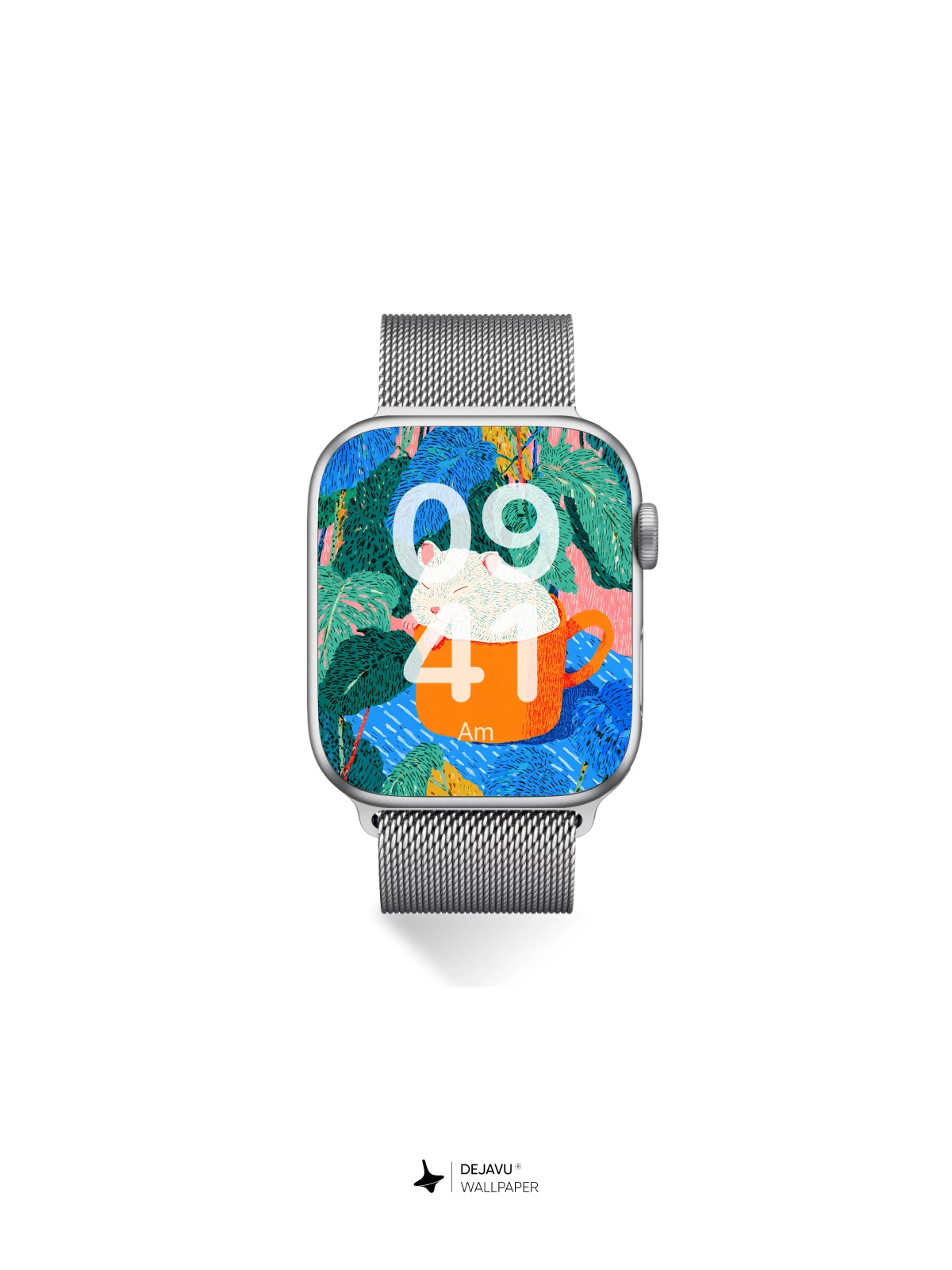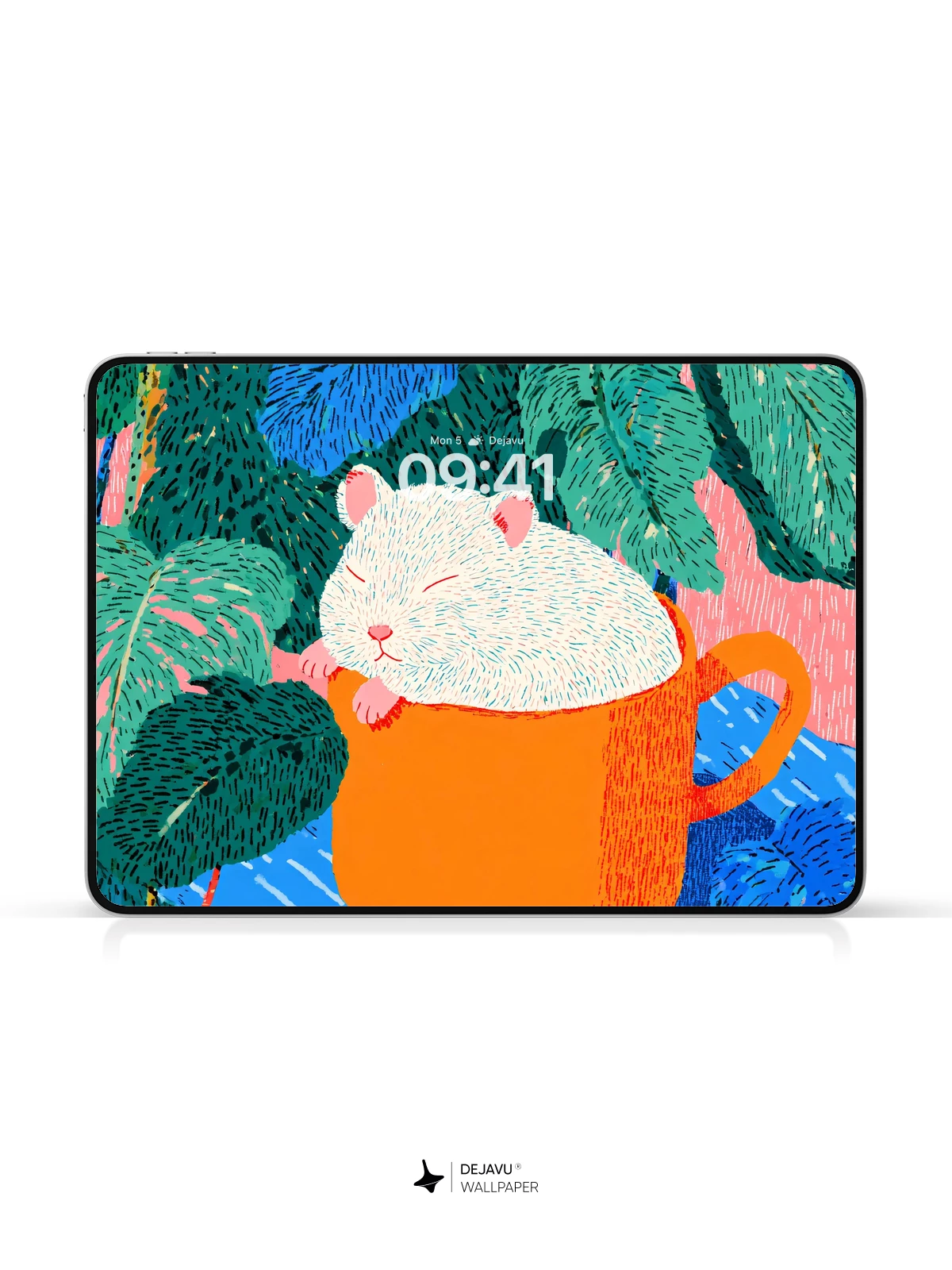 This charming illustration features a fluffy white mouse curled up asleep in a bright orange teacup, nestled among lush, vividly colored jungle foliage. The playful composition blends whimsy with bold, graphic patterns, evoking a sense of serene fantasy. Inspired by modern illustrative styles with a touch of surreal charm, it’s ideal as a high-resolution 8K wallpaper for iPhone, Android, or tablets—bringing warmth and joy to any device screen.