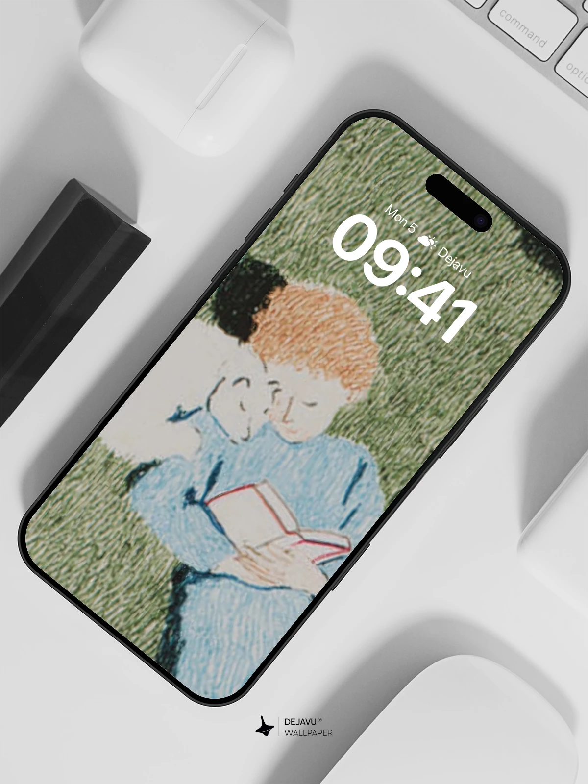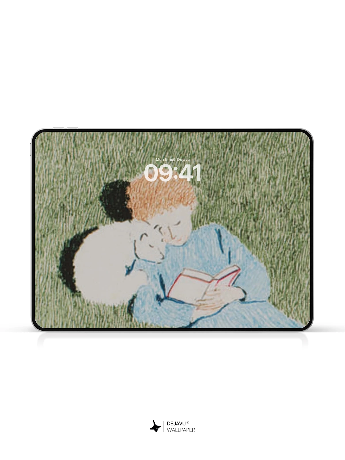 This charming illustration captures a peaceful moment of a child in blue pajamas lying on grass, reading a book while cuddling a white cat. The soft textures and gentle hues evoke a sense of quiet companionship and childhood wonder. Inspired by the delicate storytelling style of classic children’s book illustrators, this artwork brings a cozy, dreamlike quality to any mobile device. Ideal as an 8K wallpaper for iPhone, Android, or tablets, it transforms your screen into a serene escape.