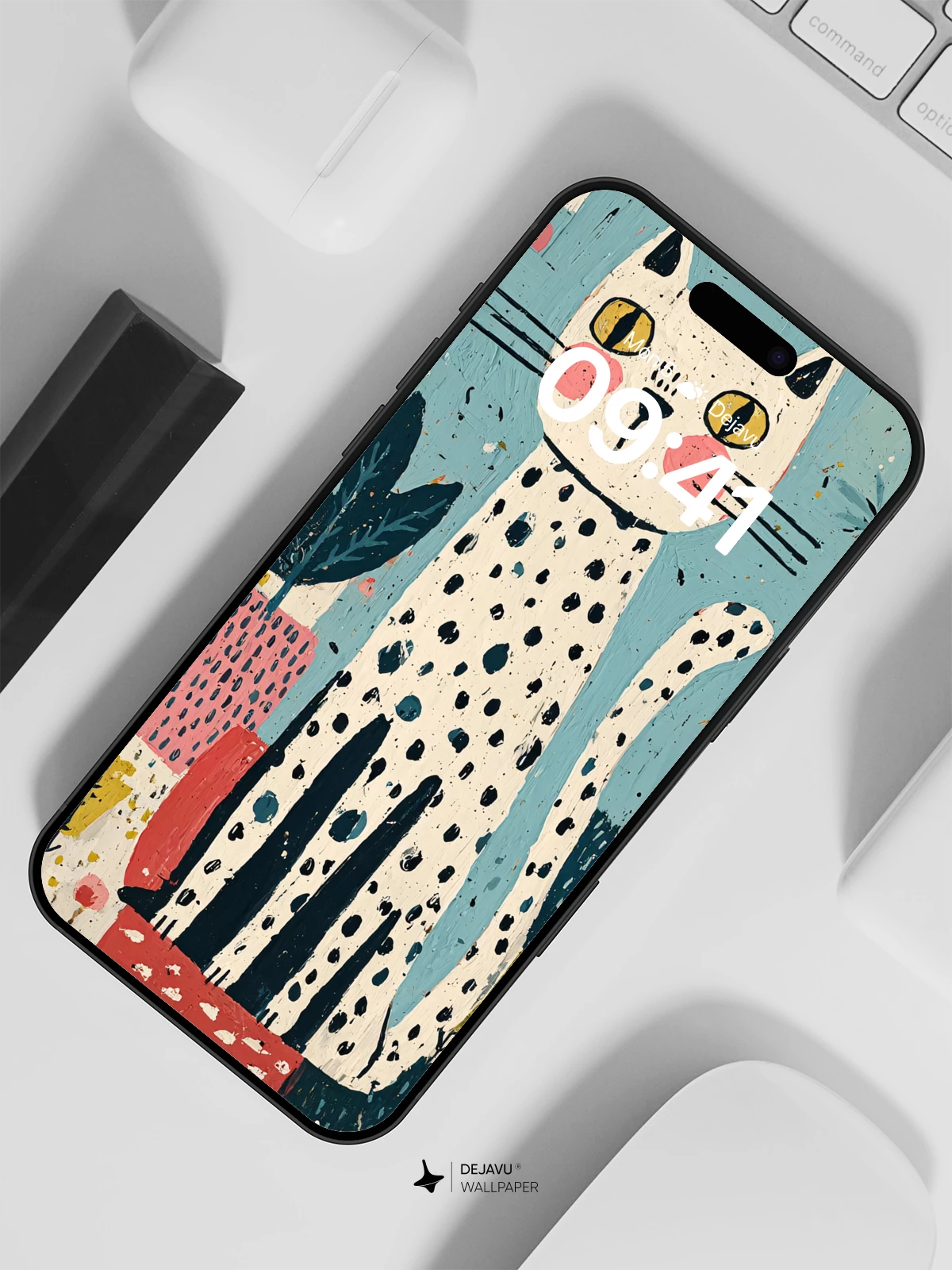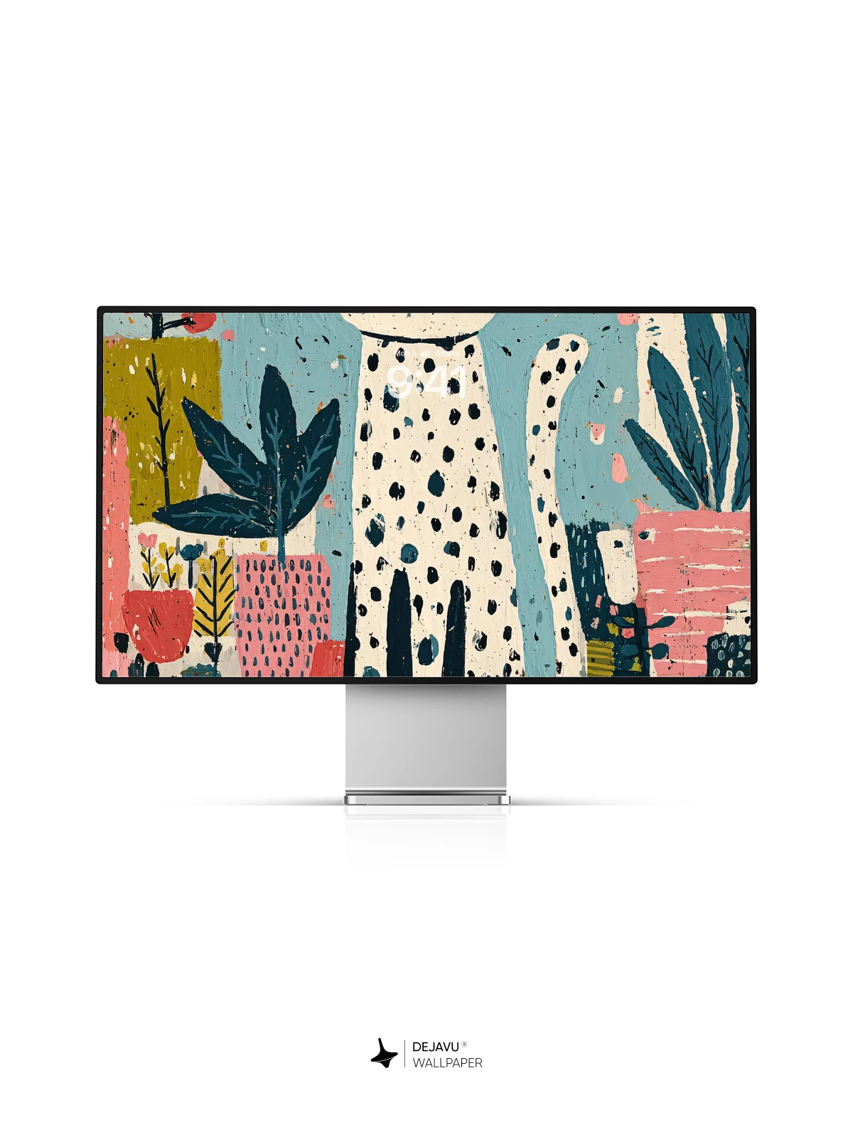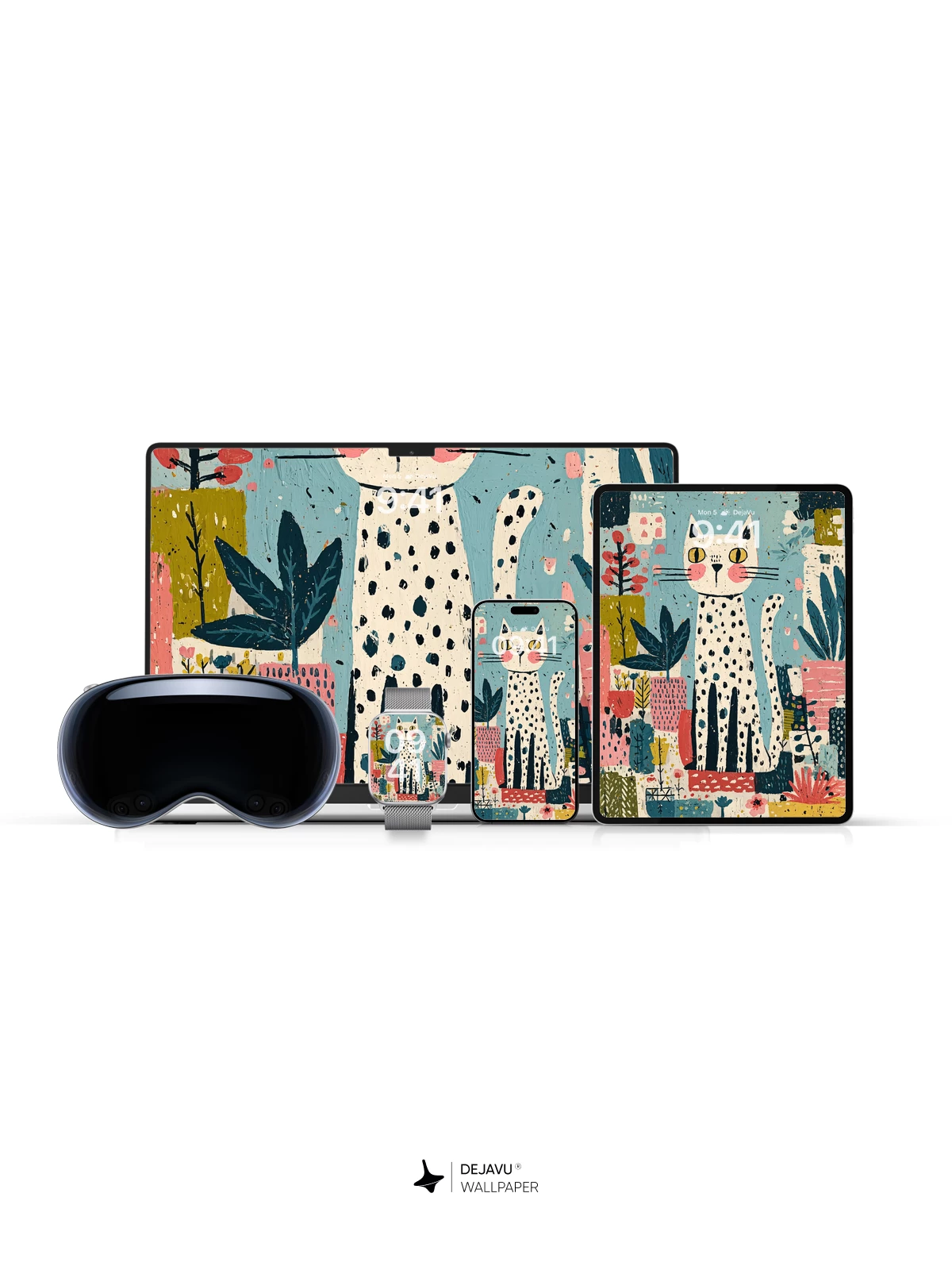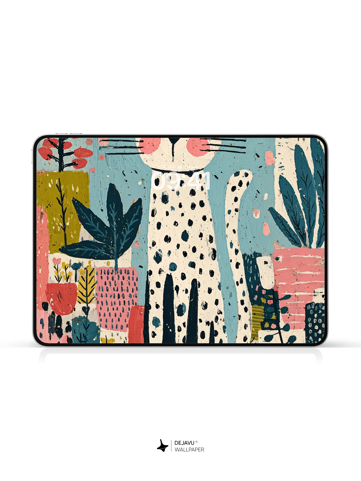 Inspired by modern folk art, this charming illustration features a dapper spotted cat surrounded by an explosion of stylized flora in bold pinks, blues, and greens. The whimsical composition blends childlike wonder with graphic flair, making it perfect for adding personality to your iPhone, Android, or tablet. With its rich textures and lively palette, this 8K wallpaper transforms any screen into a joyful canvas of creativity.
