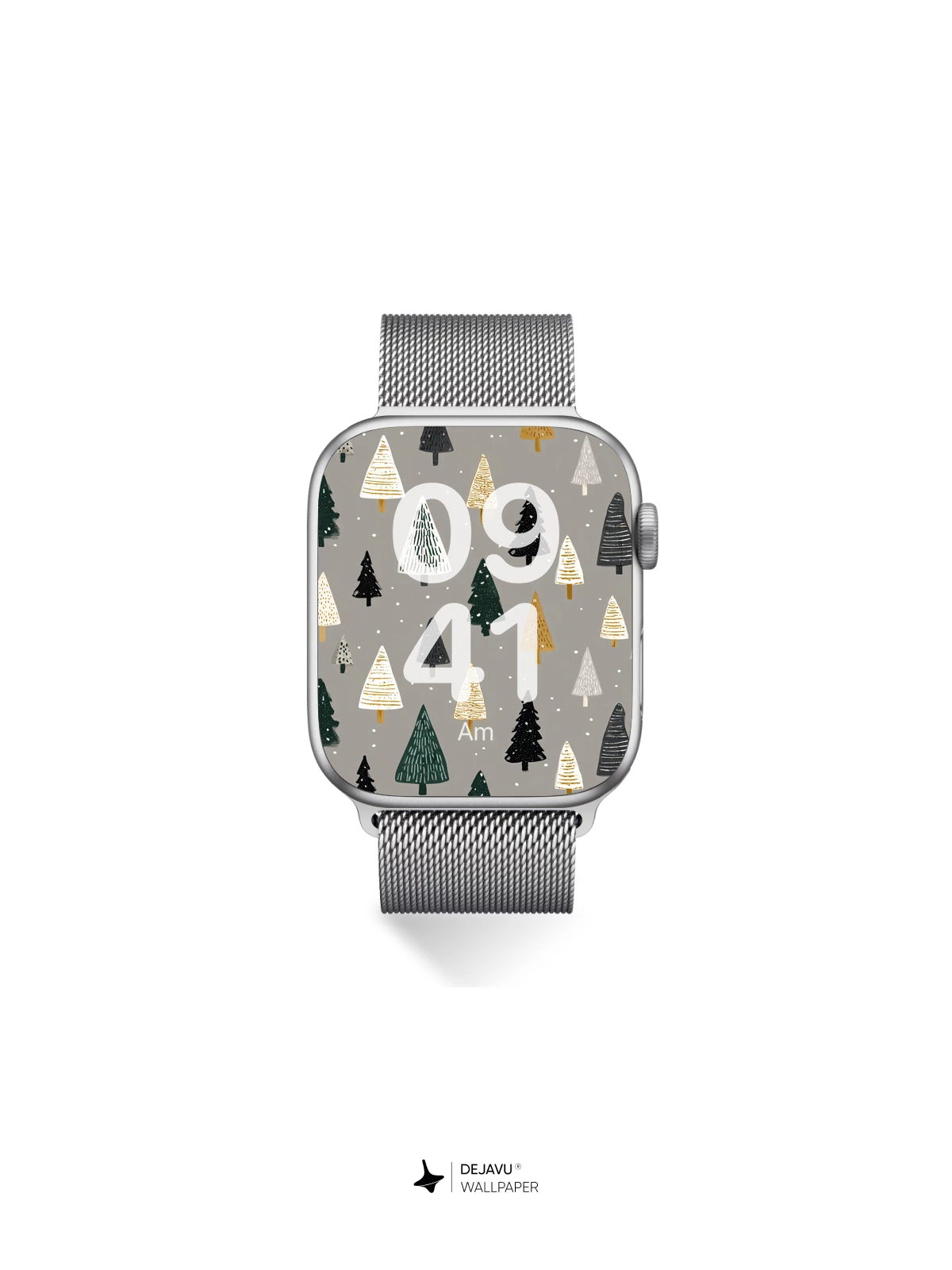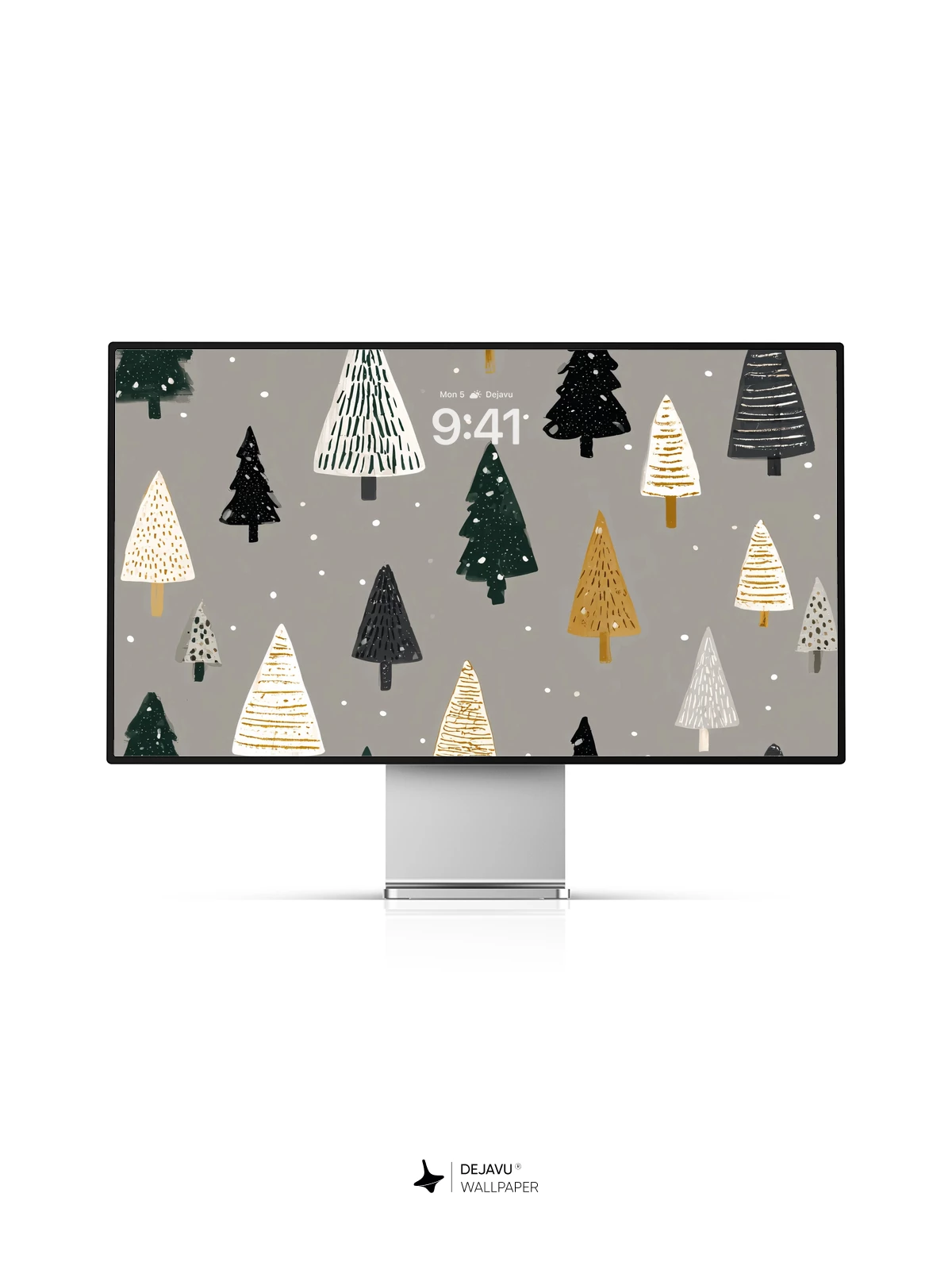This enchanting 8K wallpaper captures the quiet magic of a snowy woodland, where hand-illustrated evergreens in textured whites, deep greens, and warm golds dance across a soft gray canvas dotted with gentle snowflakes. Inspired by modern Scandinavian design, it evokes a sense of calm and holiday warmth—ideal for iPhone, Android, or tablet screens seeking a touch of seasonal charm without overwhelming detail.