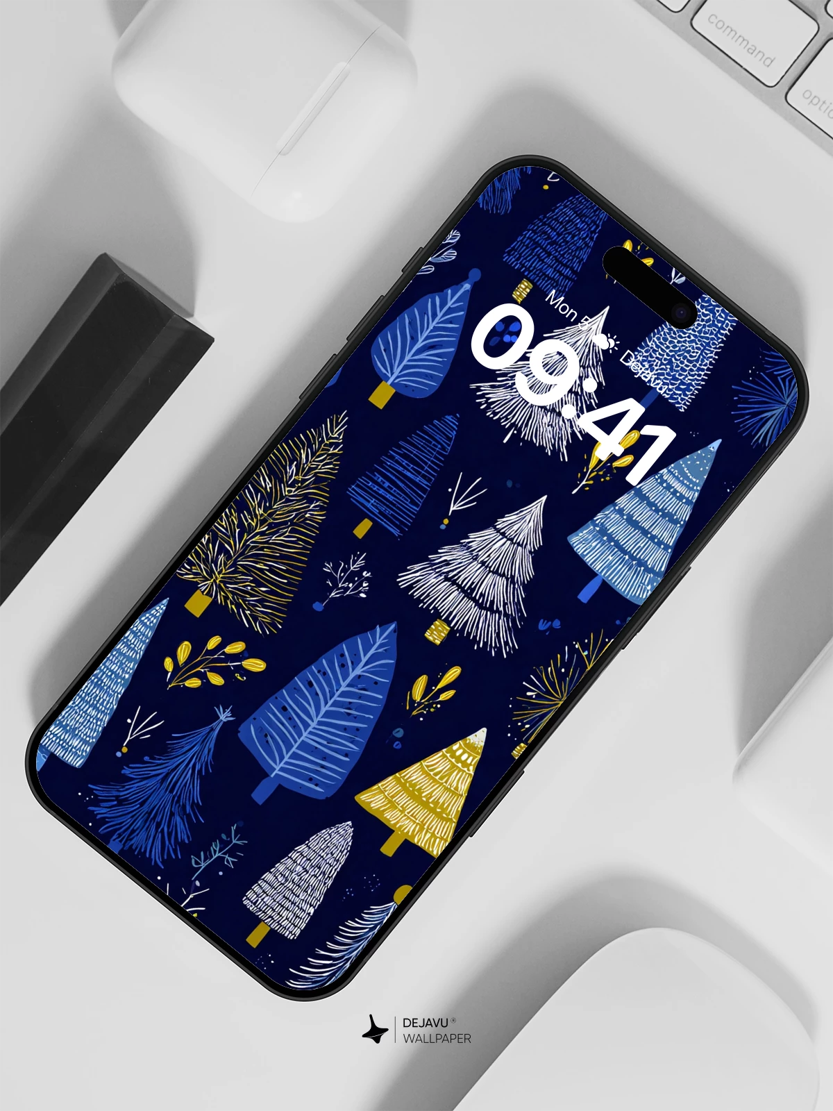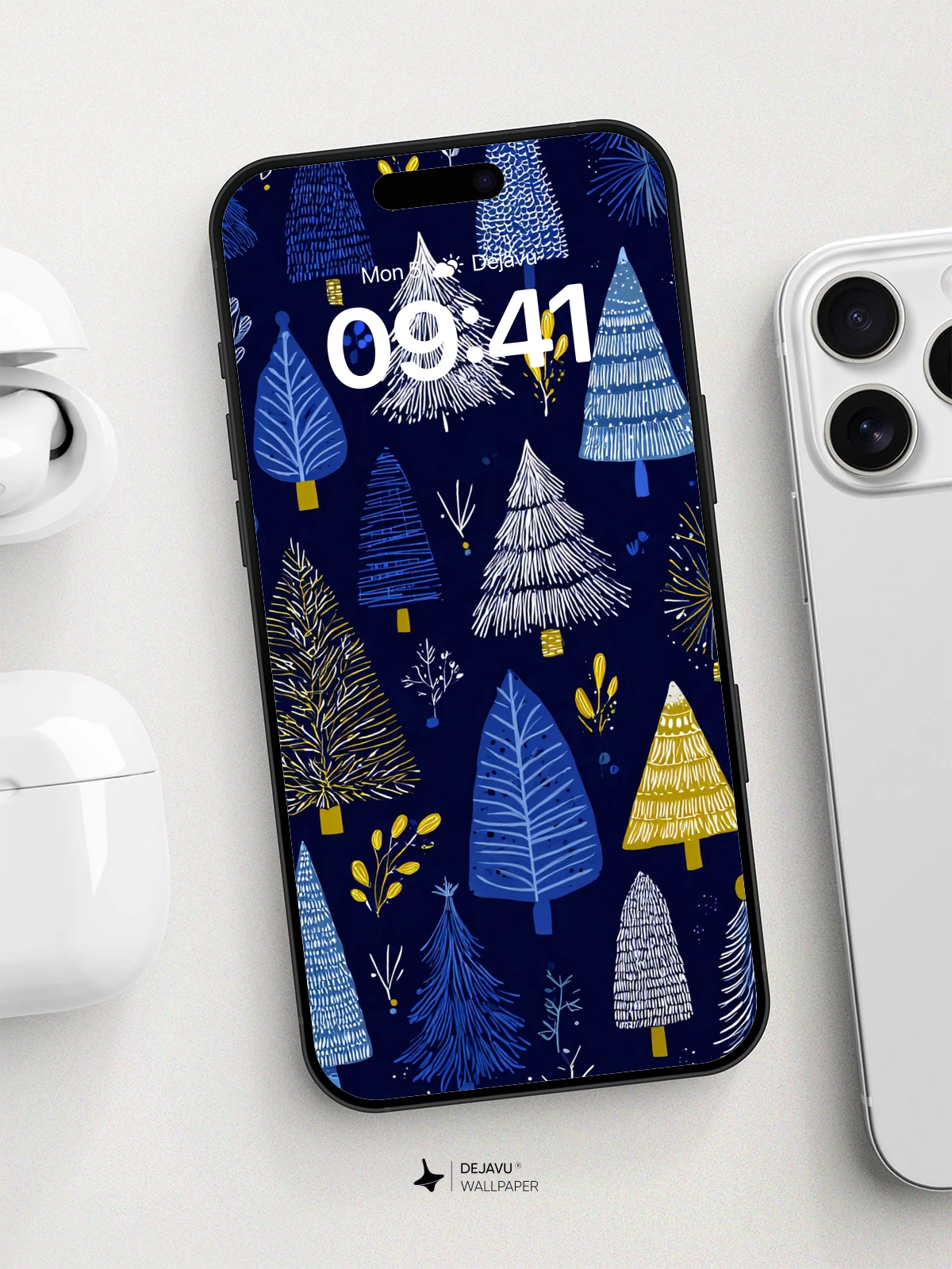 This enchanting 8K wallpaper features a charming pattern of stylized Christmas trees in shades of blue, white, and gold, set against a rich navy backdrop. Inspired by folk art aesthetics, the design evokes warmth and nostalgia, perfect for spreading holiday cheer on your iPhone, Android, or tablet. Each tree is uniquely illustrated with delicate textures and playful details, creating a whimsical winter wonderland that feels both timeless and modern. Ideal for seasonal updates, this high-resolution artwork brings a touch of festive magic to any device screen.