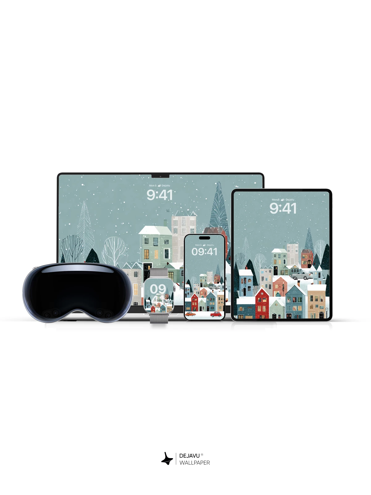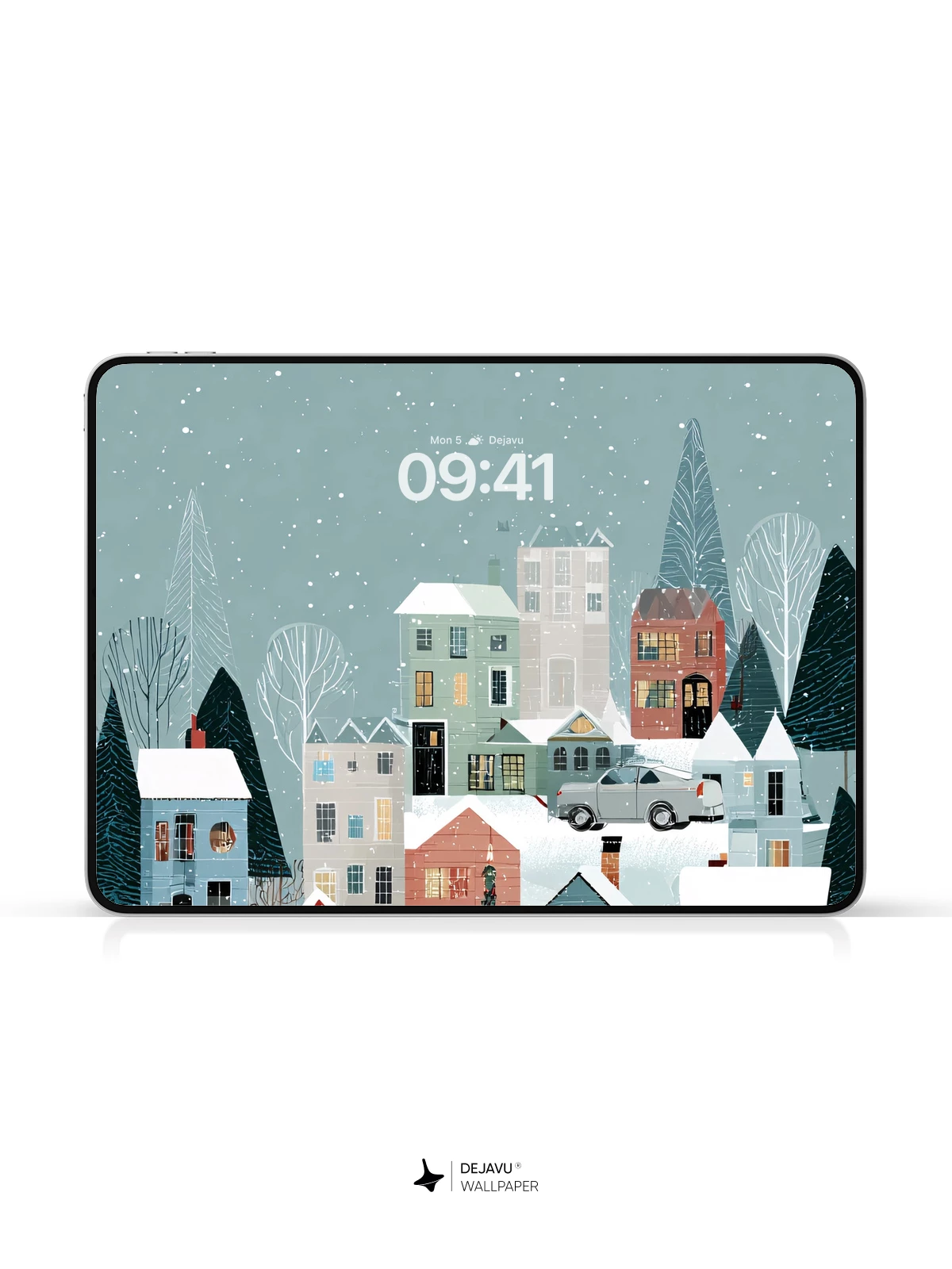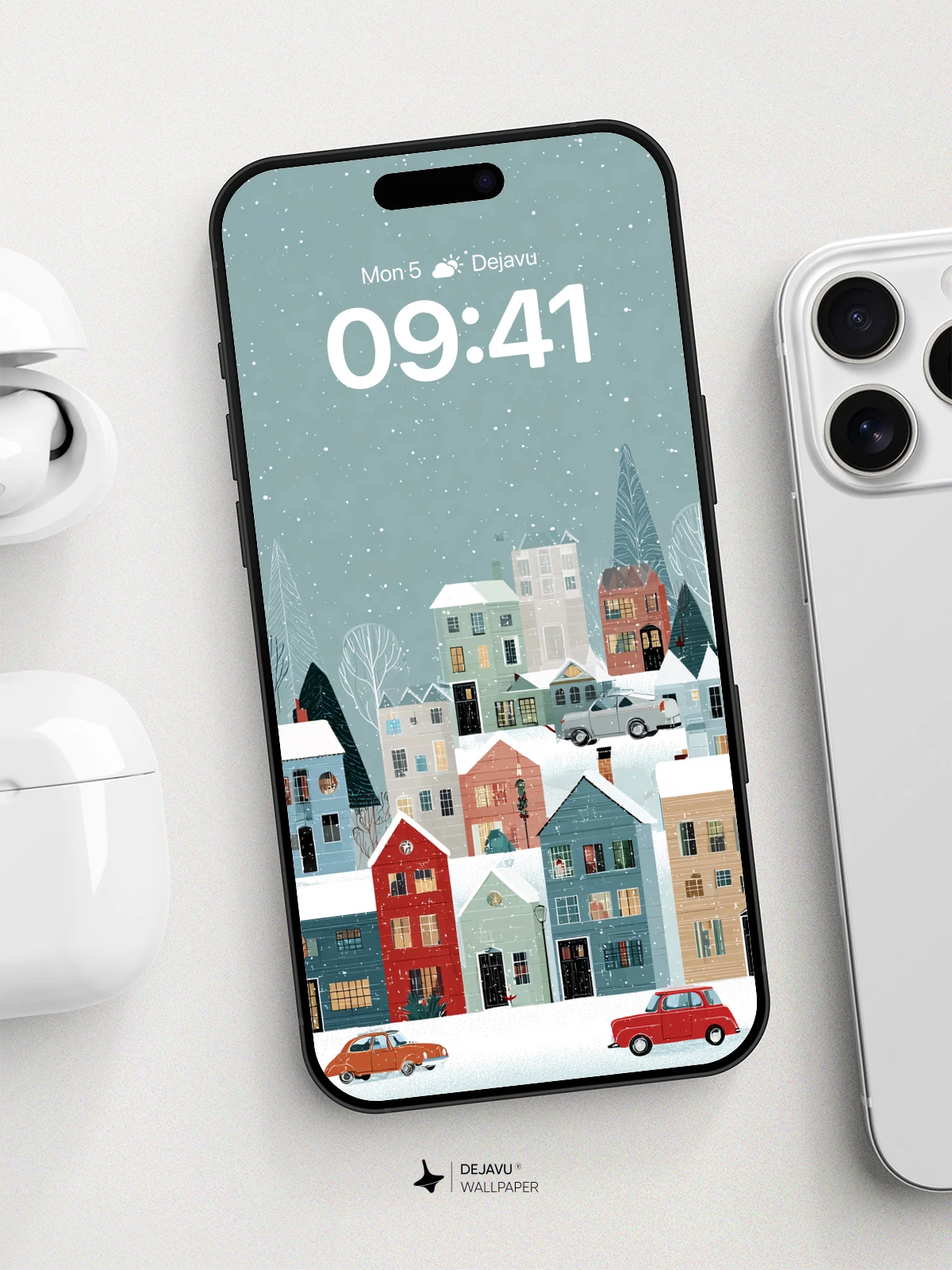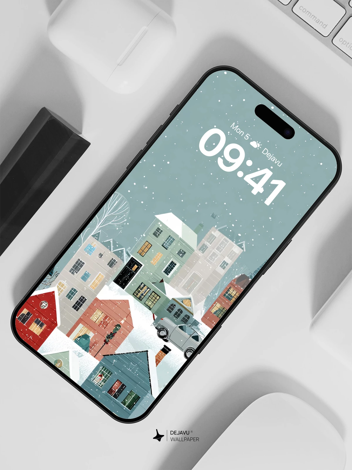 This enchanting winter scene features a quaint town blanketed in snow, with pastel-colored houses, leafless trees, and retro cars adding charm. The soft falling snow and warm window glows evoke a sense of holiday nostalgia and quiet joy. Ideal as a high-resolution 8K wallpaper for iPhone, Android, or tablets, this whimsical illustration brings cozy winter magic to your device’s screen.