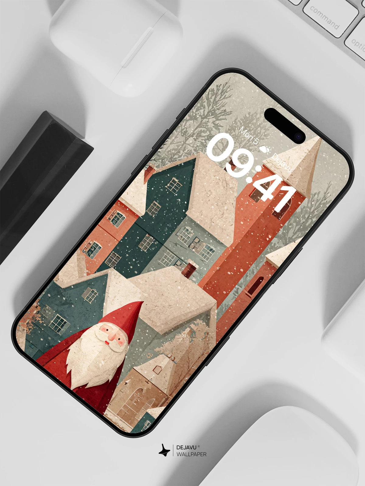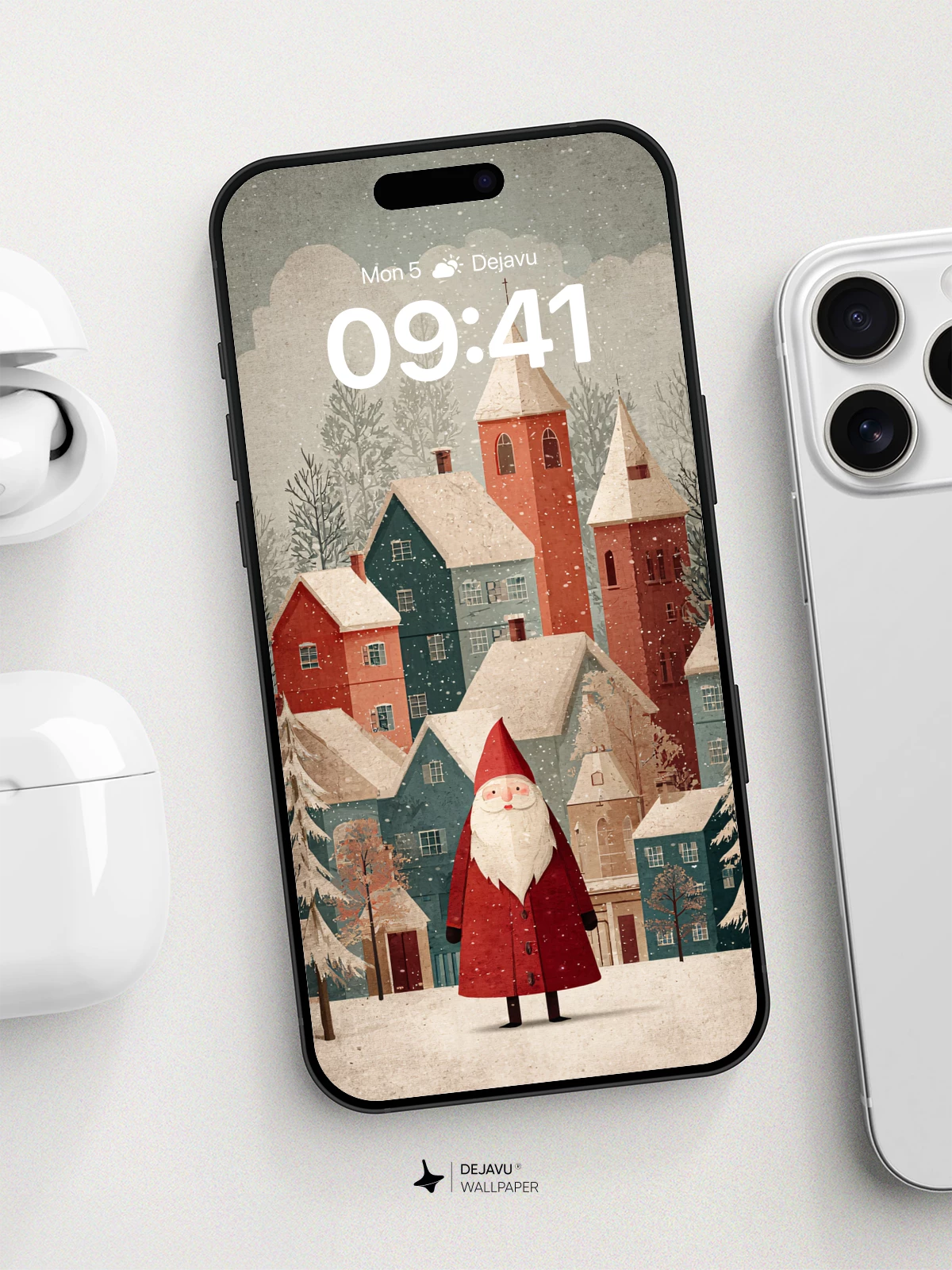 This enchanting illustration captures a serene snowy village with colorful rooftops and a gentle snowfall, centered by a classic Santa figure. Inspired by modern folk art with a nostalgic touch, it evokes warmth and holiday cheer. The detailed yet stylized design makes it ideal as a high-resolution 8K wallpaper for iPhone, Android, or tablets, bringing festive magic to your device’s screen.