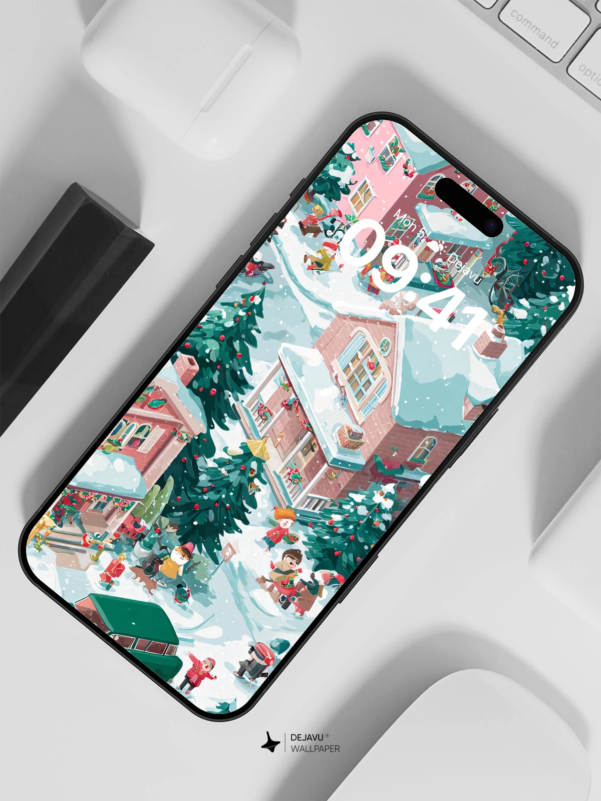 This enchanting illustration captures a cozy winter wonderland where pastel-colored homes glow under falling snow, children play in the streets, and vintage cars add nostalgic charm. Inspired by classic holiday illustrations, the scene radiates warmth and joy, making it an ideal 8K wallpaper for iPhone, Android, and tablets. Its detailed isometric design brings depth and whimsy, perfect for spreading seasonal cheer on any device.