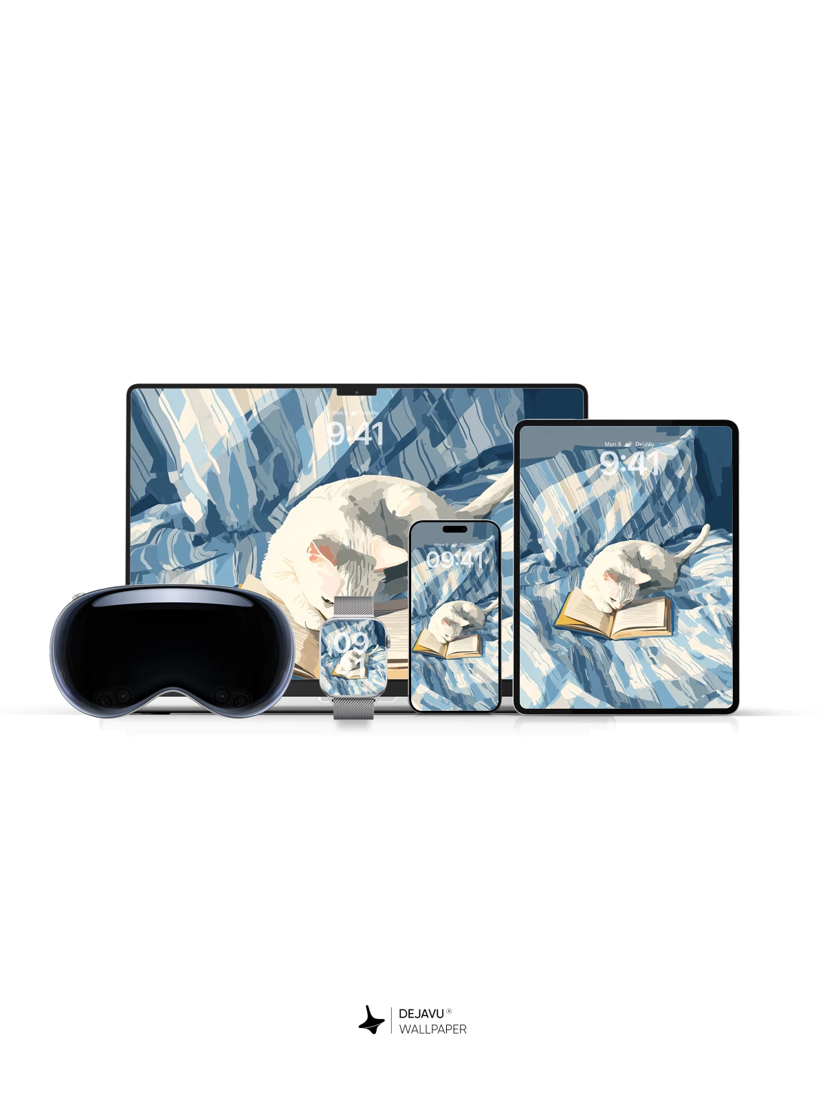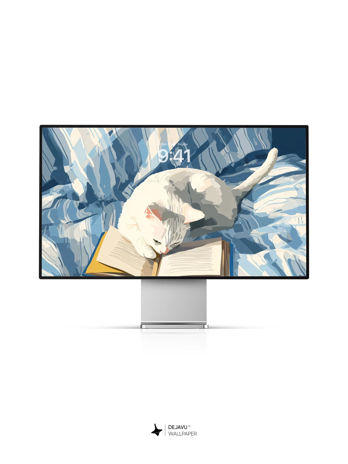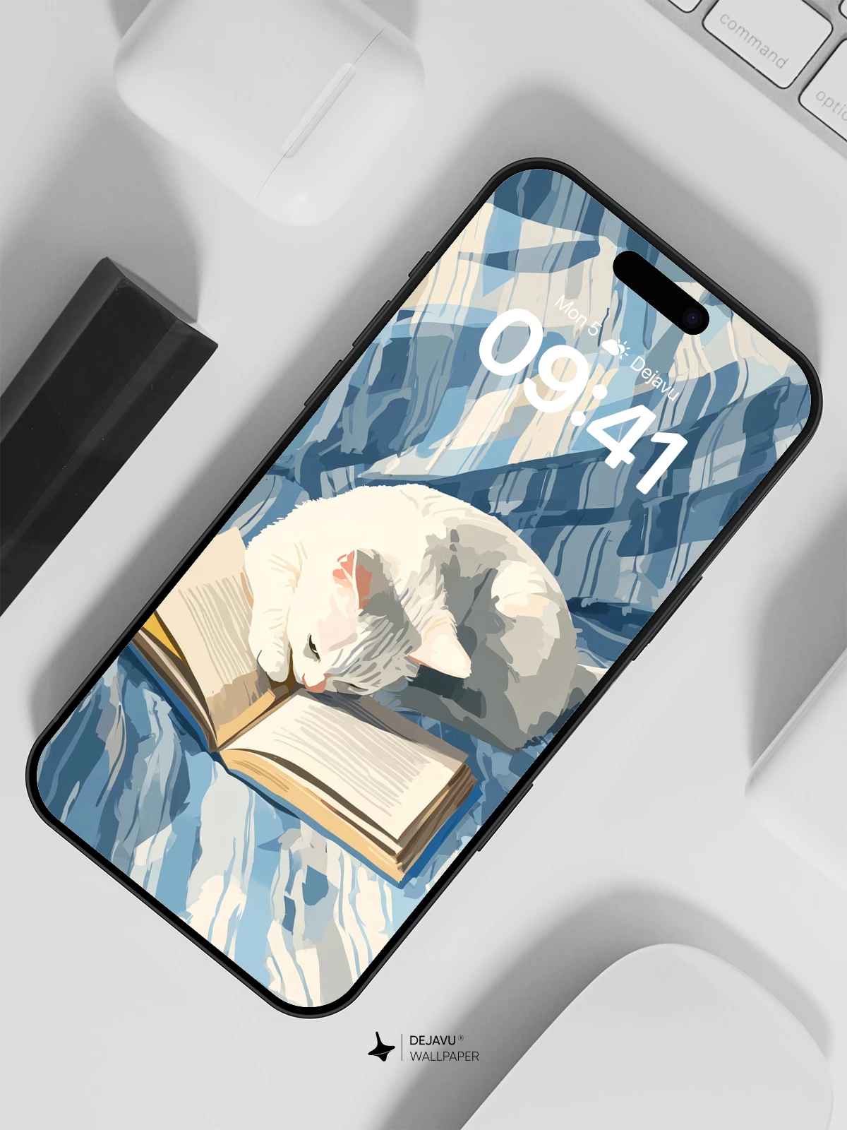 This captivating 8K wallpaper features a peaceful white cat gently resting its head on an open book, nestled on a rumpled blue-and-white quilted bed. Rendered in a delicate, impressionistic style reminiscent of modern digital painting, the scene evokes quiet contemplation and cozy solitude. The soft light and textured strokes create a calming atmosphere ideal for iPhone, Android, or tablet screens. A perfect blend of whimsy and serenity, it transforms any device into a tranquil retreat.