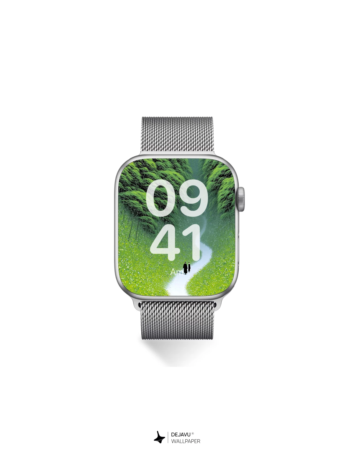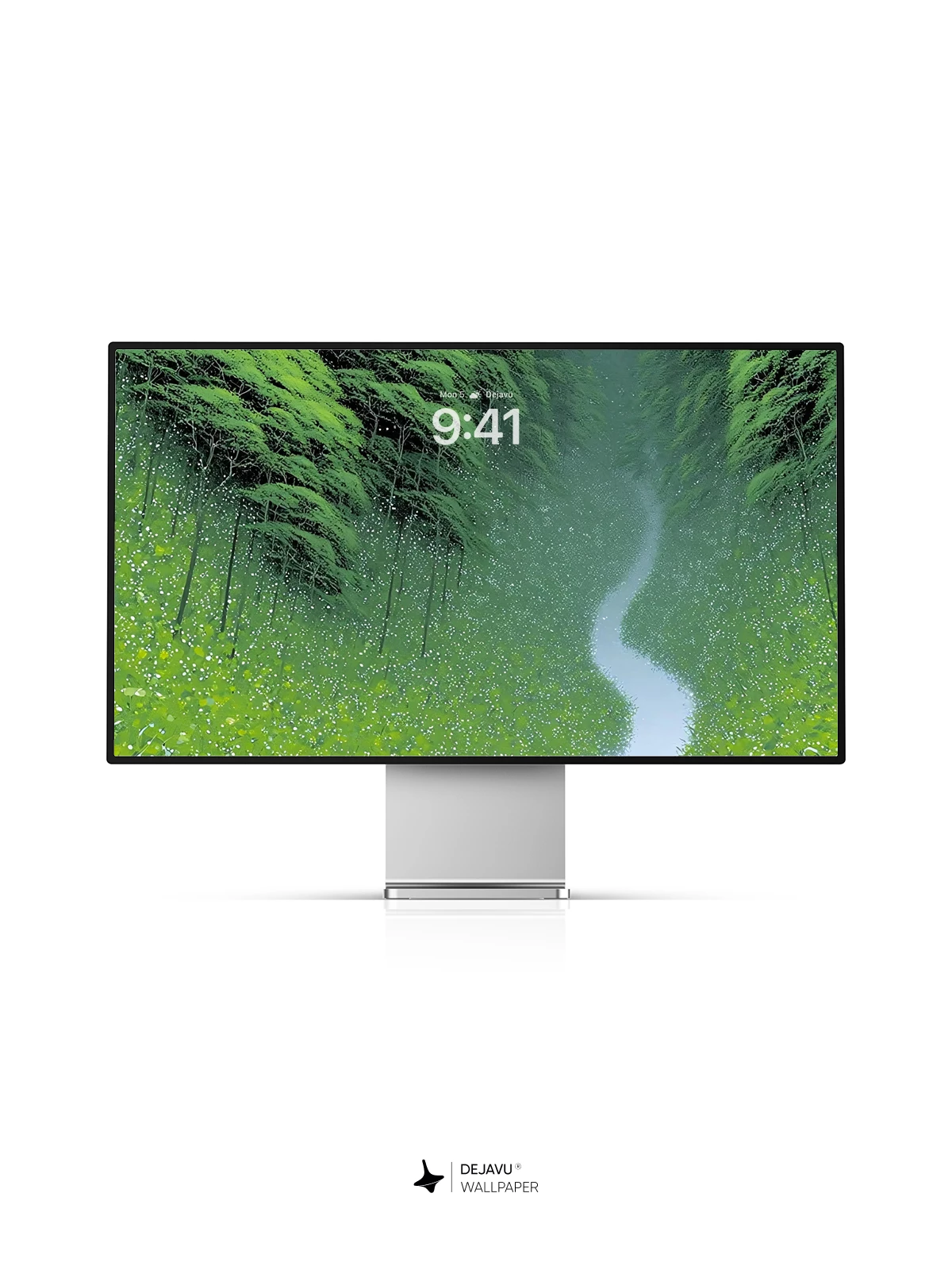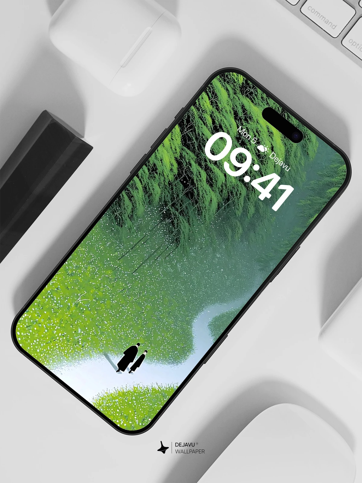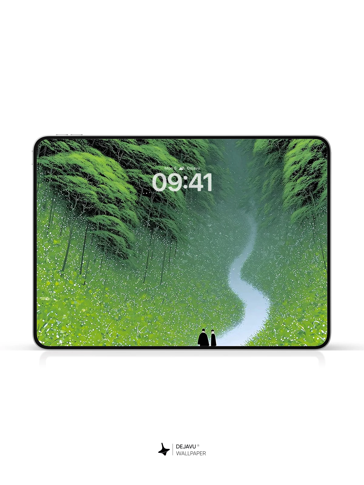 This ethereal illustration captures a winding path through a vibrant, moss-covered forest under a crescent moon, where two solitary figures journey deeper into nature’s embrace. Inspired by the tranquil beauty of Japanese woodblock prints and modern illustrative minimalism, the artwork blends realism with poetic symbolism. The rich greens and soft glow create a calming atmosphere ideal for iPhone, Android, and tablet wallpapers. Perfect for those who seek serenity in their digital spaces.