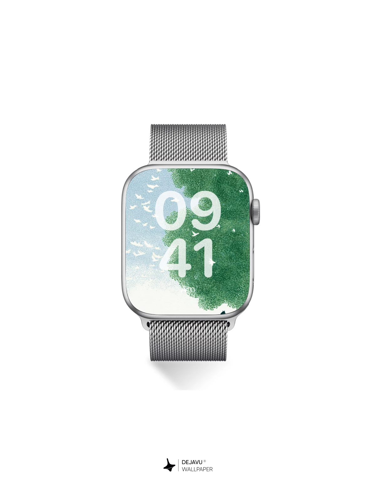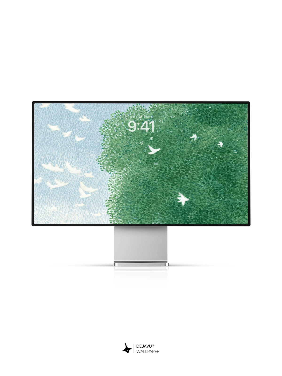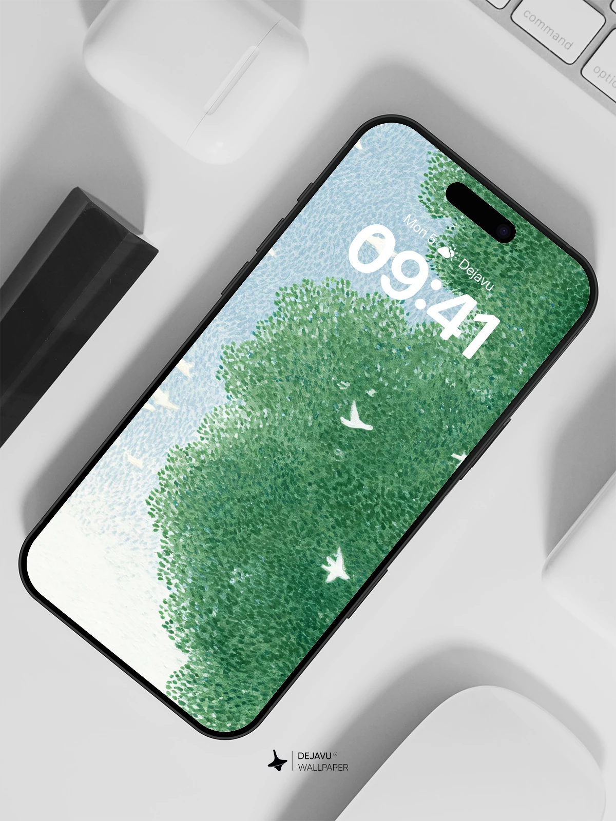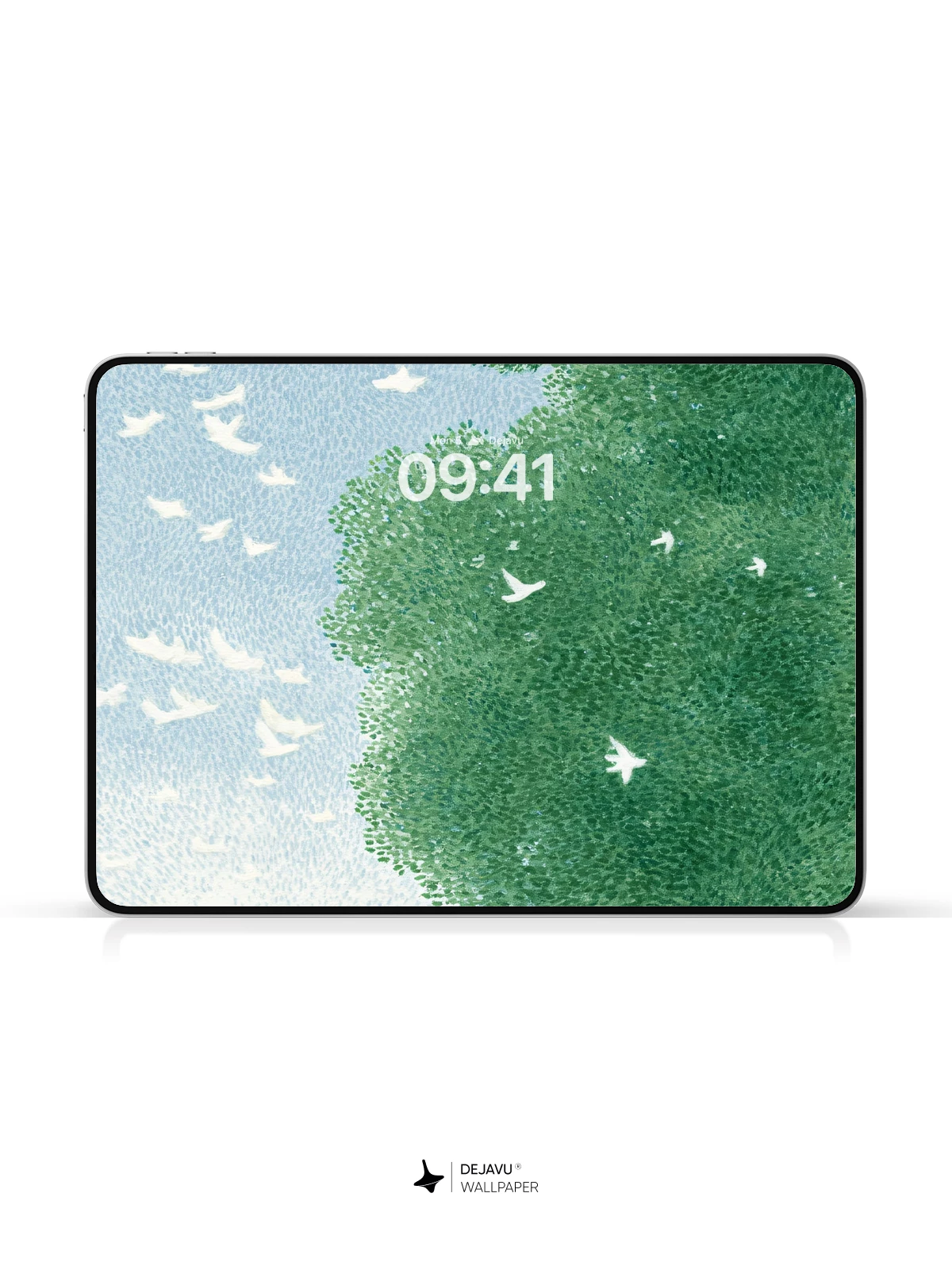 This tranquil illustration evokes a sense of quiet contemplation, where a lone black cat sits beneath a towering, leafy tree as white birds drift into the soft blue sky. Rendered in a delicate watercolor style with textured brushwork, the image blends nature and solitude into a dreamlike stillness. Ideal as an 8K wallpaper for iPhone, Android, or tablets, it brings peaceful elegance to your device’s screen.