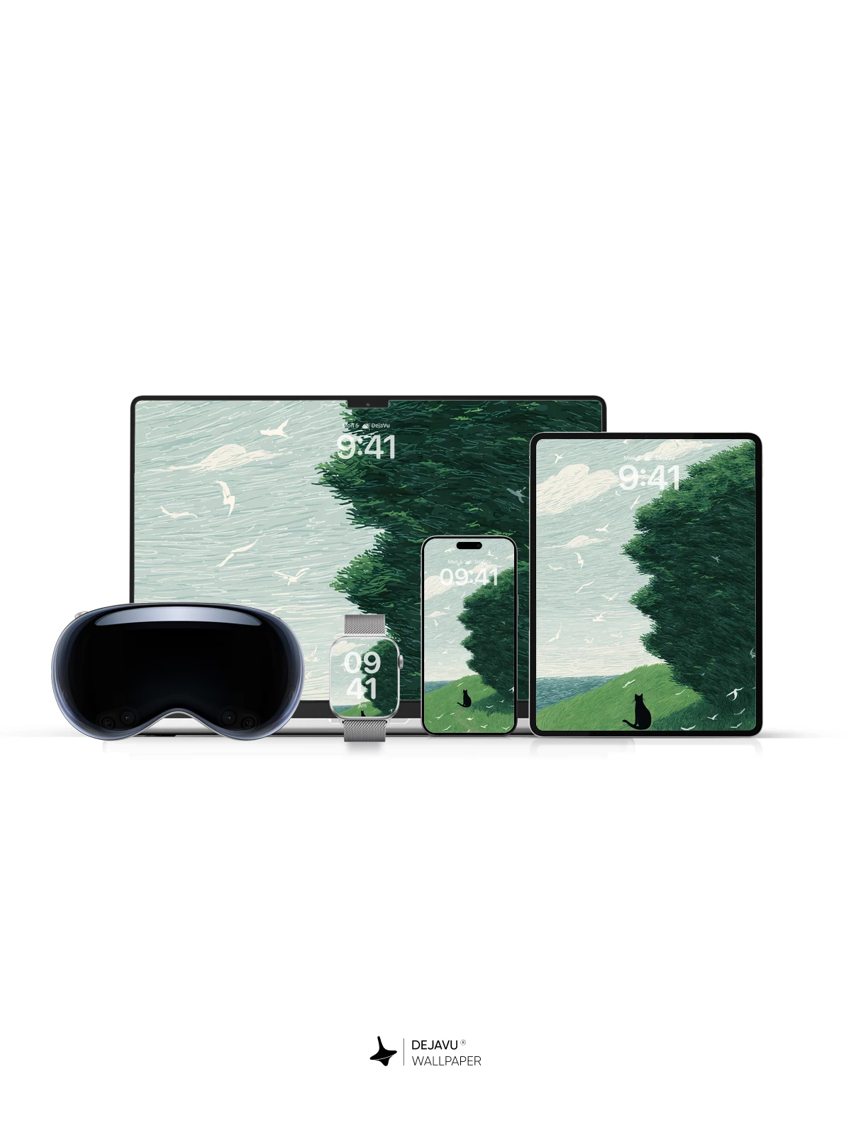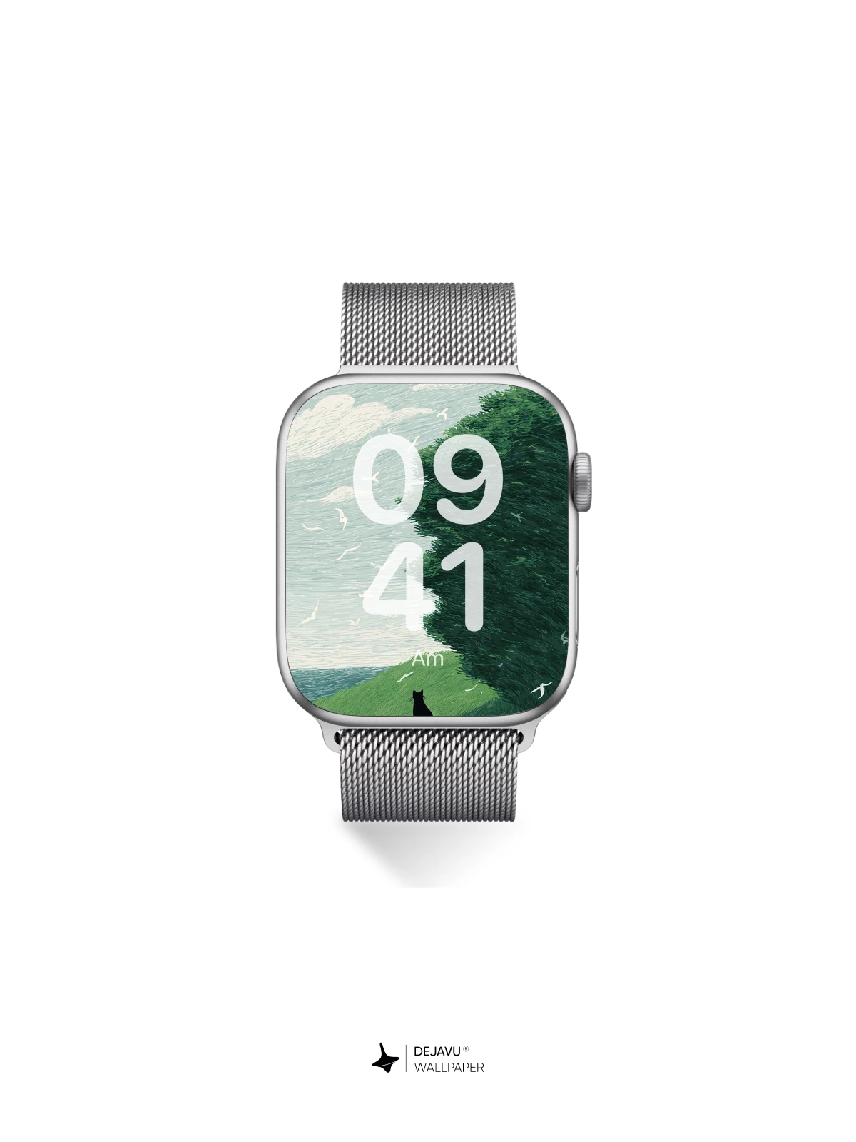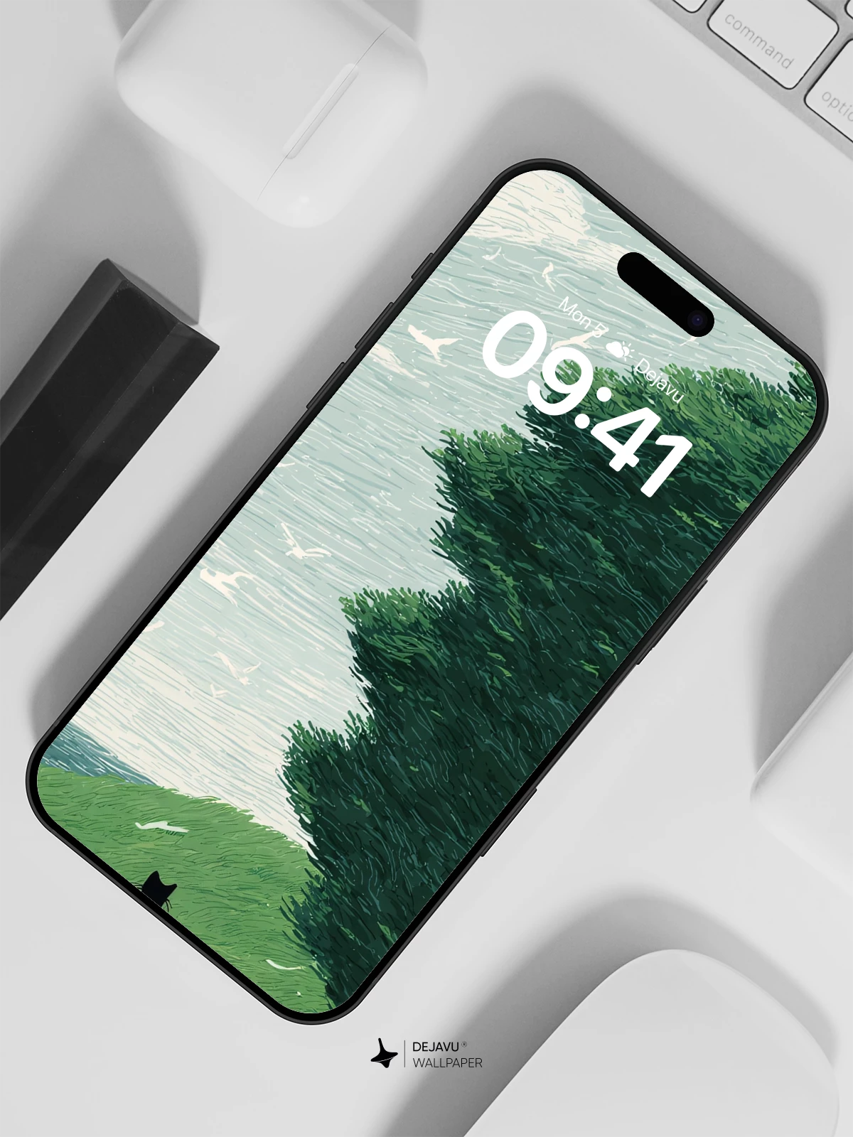 Inspired by the delicate brushwork of modern illustrative art, this 8K wallpaper features a lone black cat perched on a vibrant green slope, gazing at a sky alive with flying birds and flowing clouds. The scene evokes a sense of peaceful solitude and natural harmony, where wind shapes the trees like waves. Perfect for iPhone, Android, or tablet screens, this high-resolution artwork brings an ethereal, contemplative mood to your device—ideal for those who appreciate nature, minimal storytelling, and artistic depth in their mobile backgrounds.