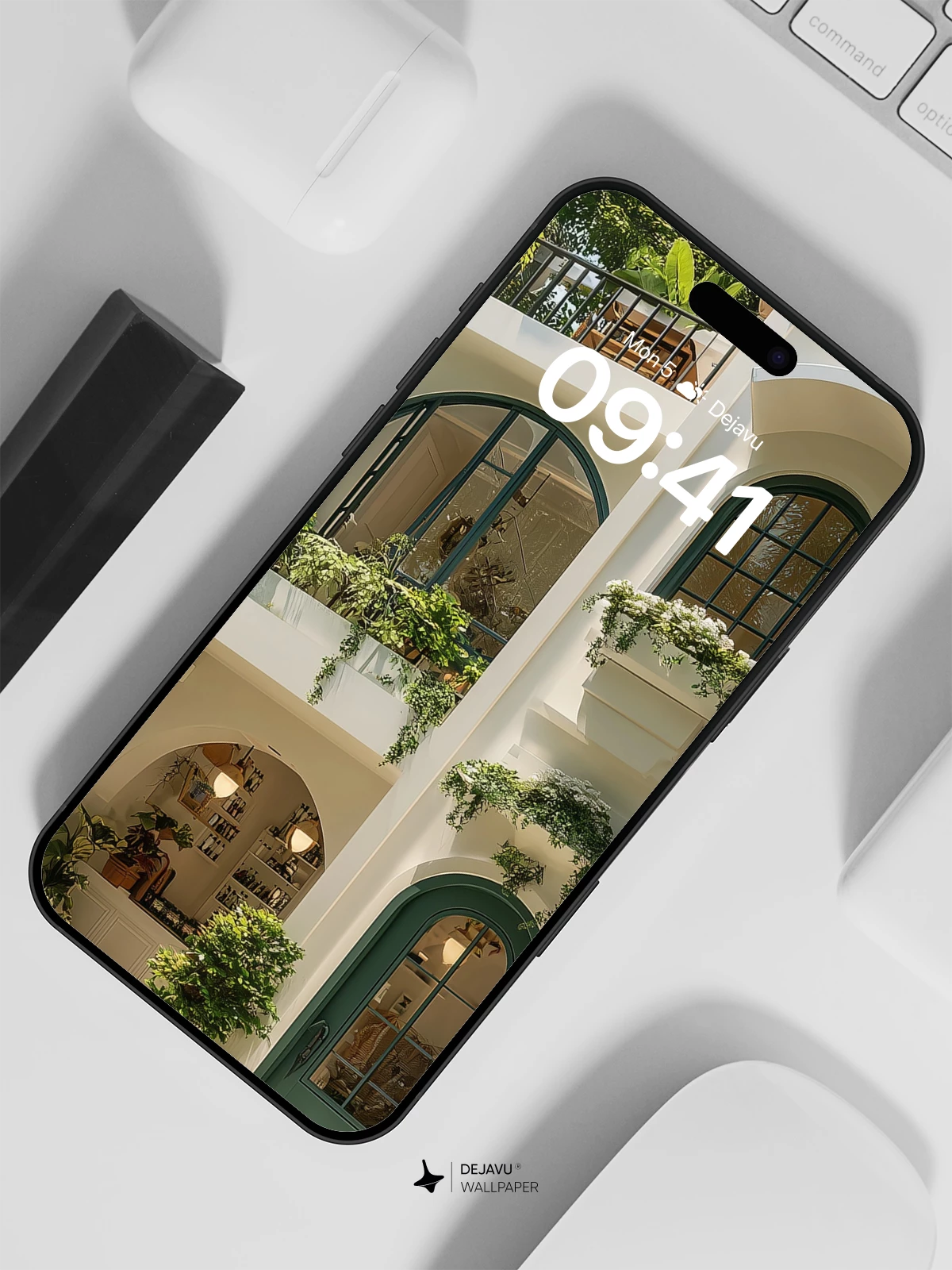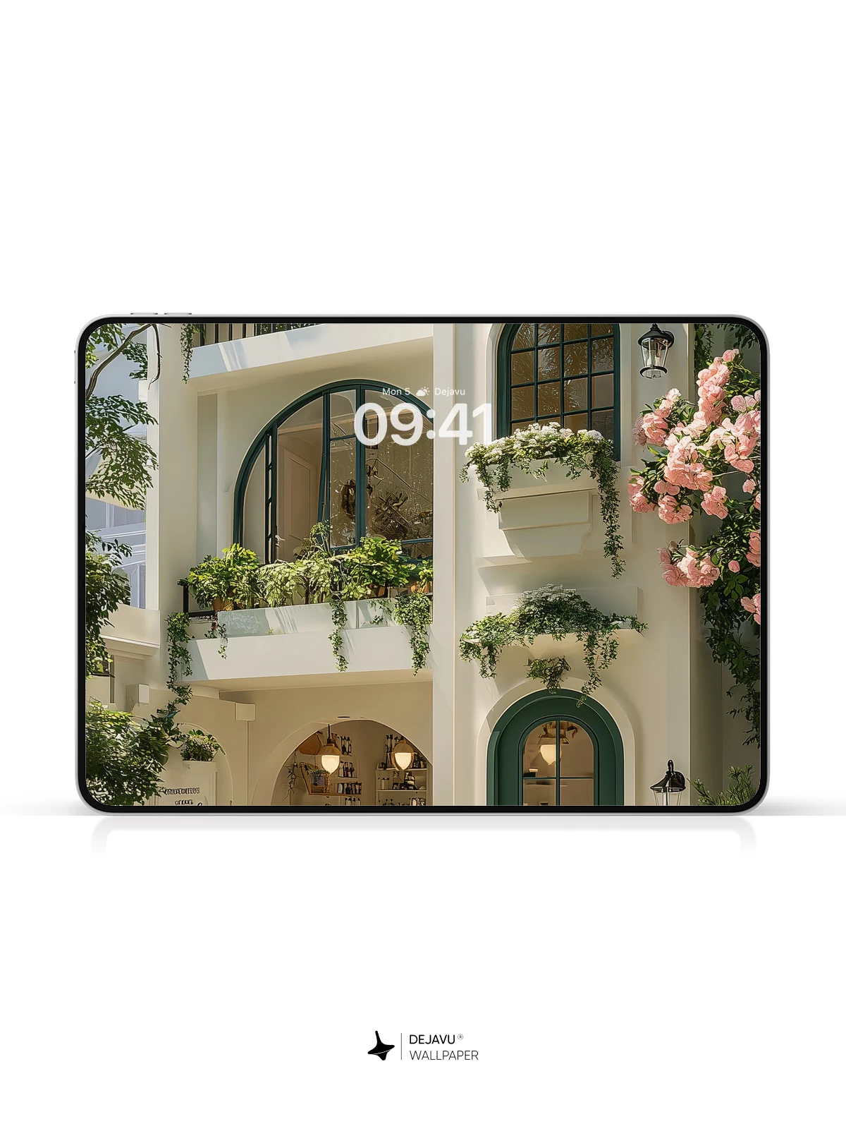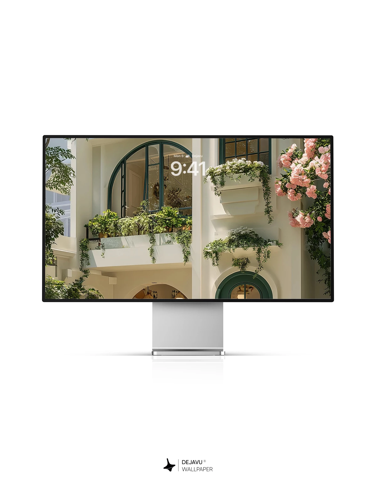 Bring the serenity of a Mediterranean garden to your screen with this 8K wallpaper. The image captures a pristine white building with elegant arched windows and a lush collection of greenery, creating a peaceful and inviting atmosphere perfect for iPhone, Android, and tablet backgrounds.