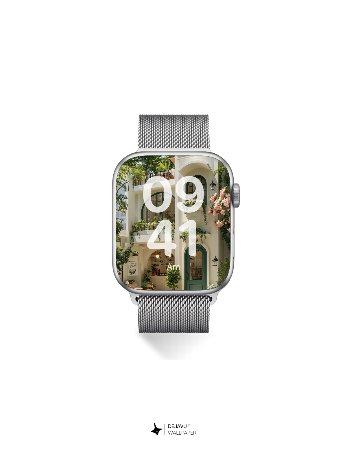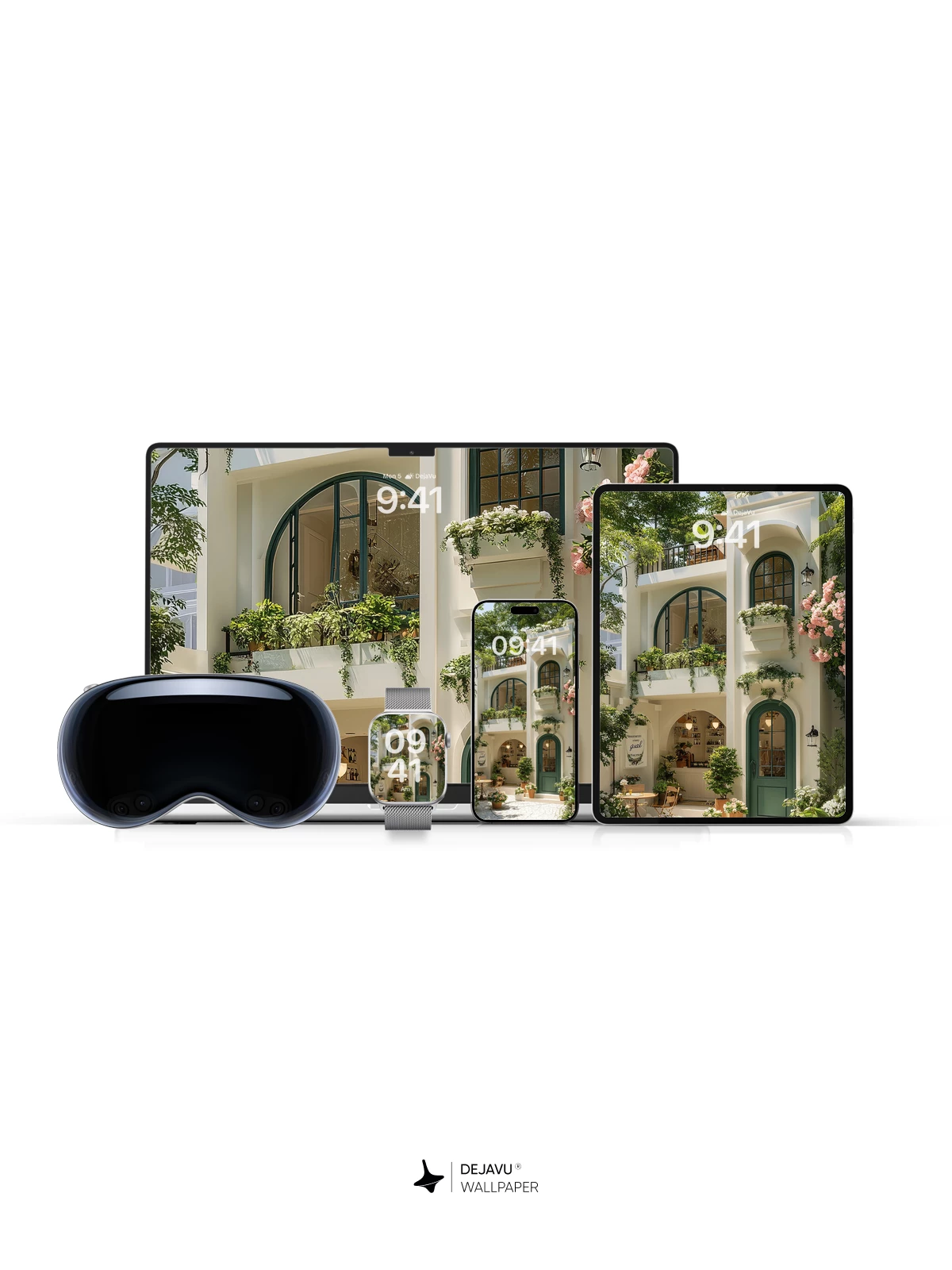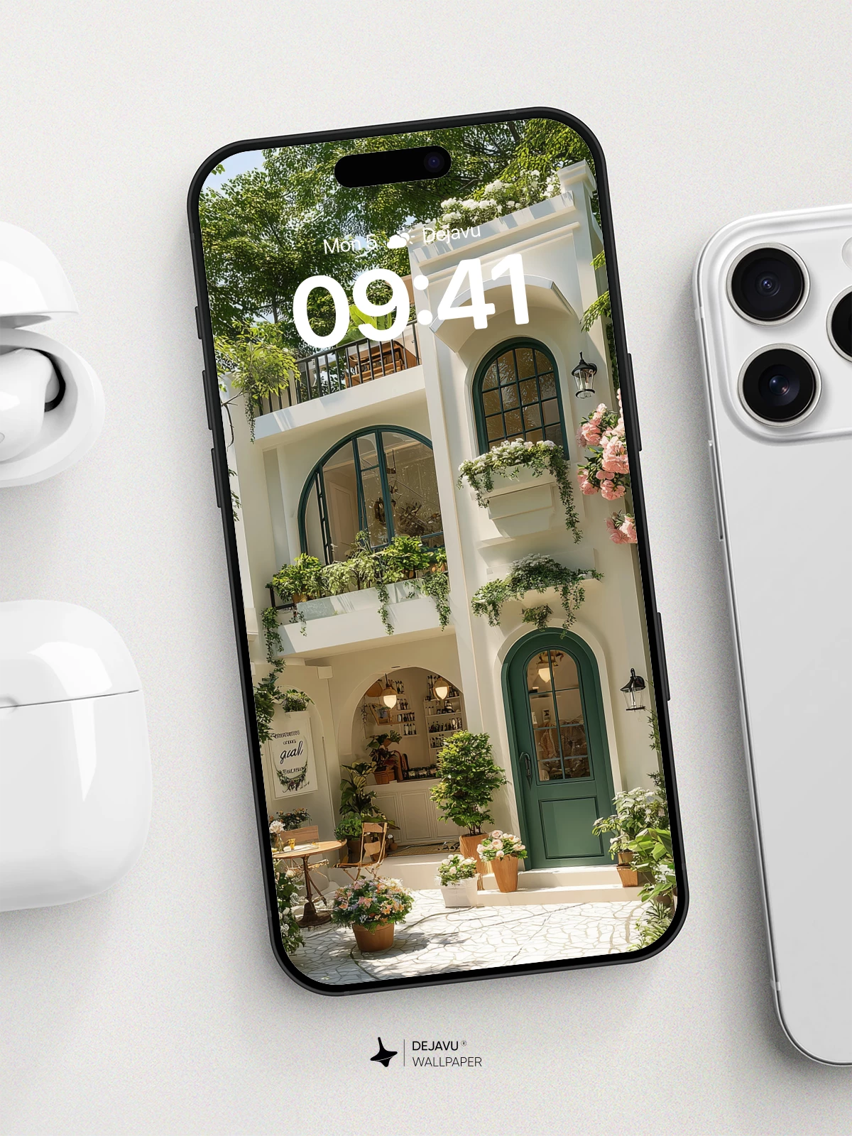 Bring the serenity of a Mediterranean garden to your screen with this 8K wallpaper. The image captures a pristine white building with elegant arched windows and a lush collection of greenery, creating a peaceful and inviting atmosphere perfect for iPhone, Android, and tablet backgrounds.
