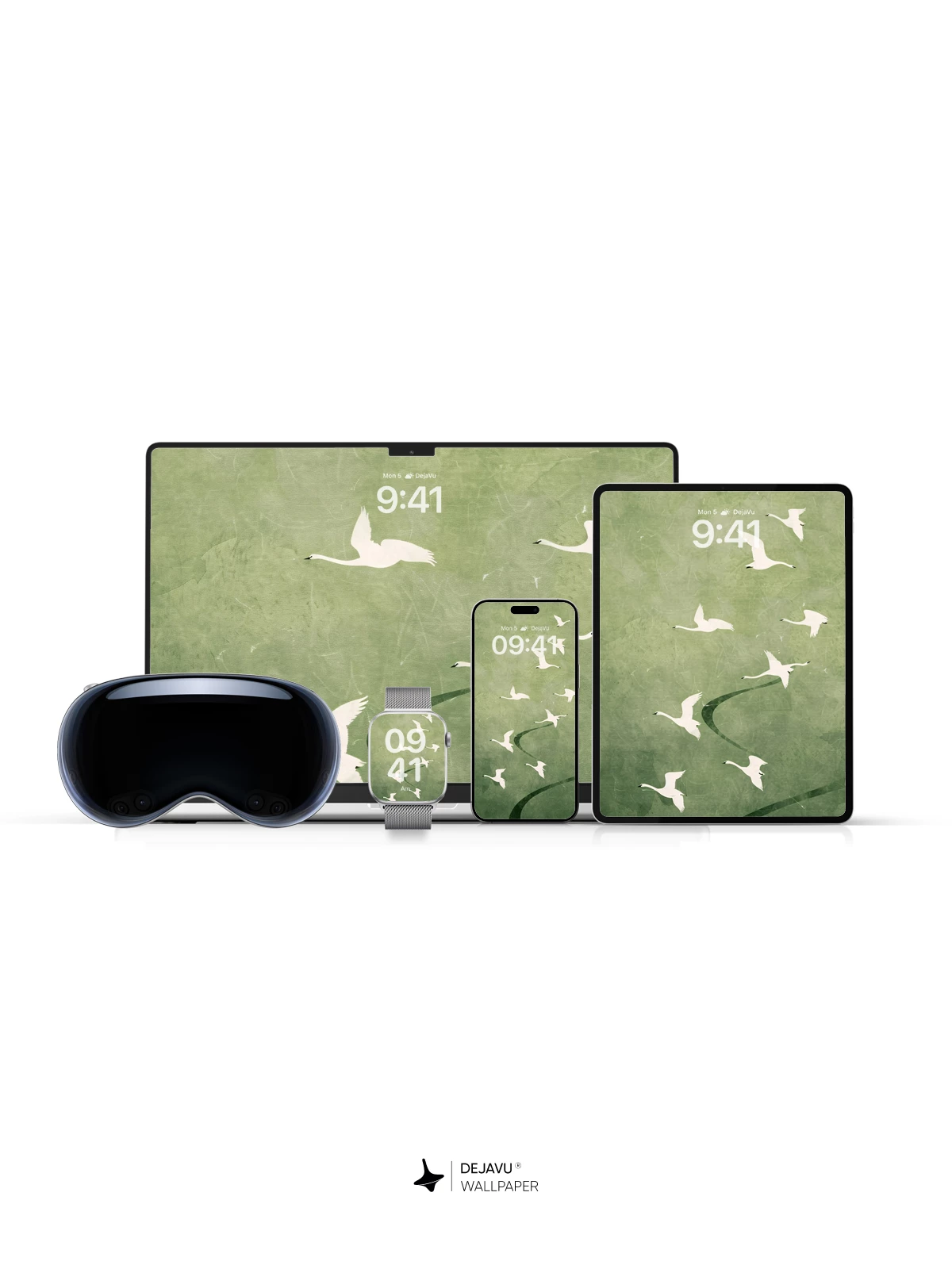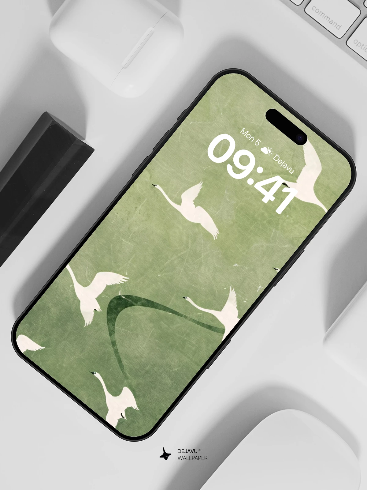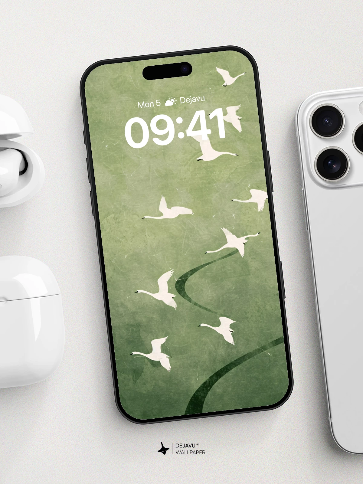 This 8K wallpaper captures a graceful formation of white swans soaring across a textured, muted green canvas. The design evokes a sense of tranquility and freedom, making it perfect for personalizing your iPhone, Android, or tablet with a sophisticated, nature-inspired aesthetic.