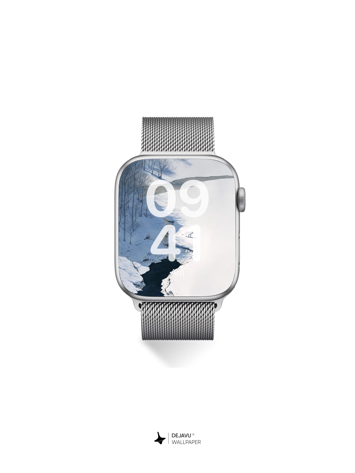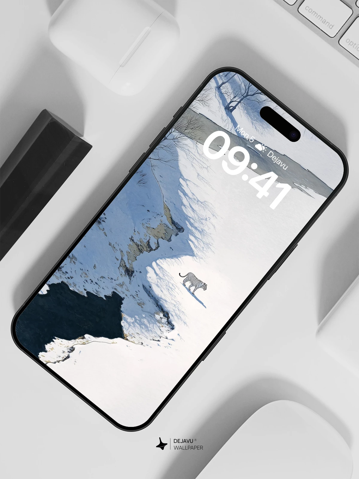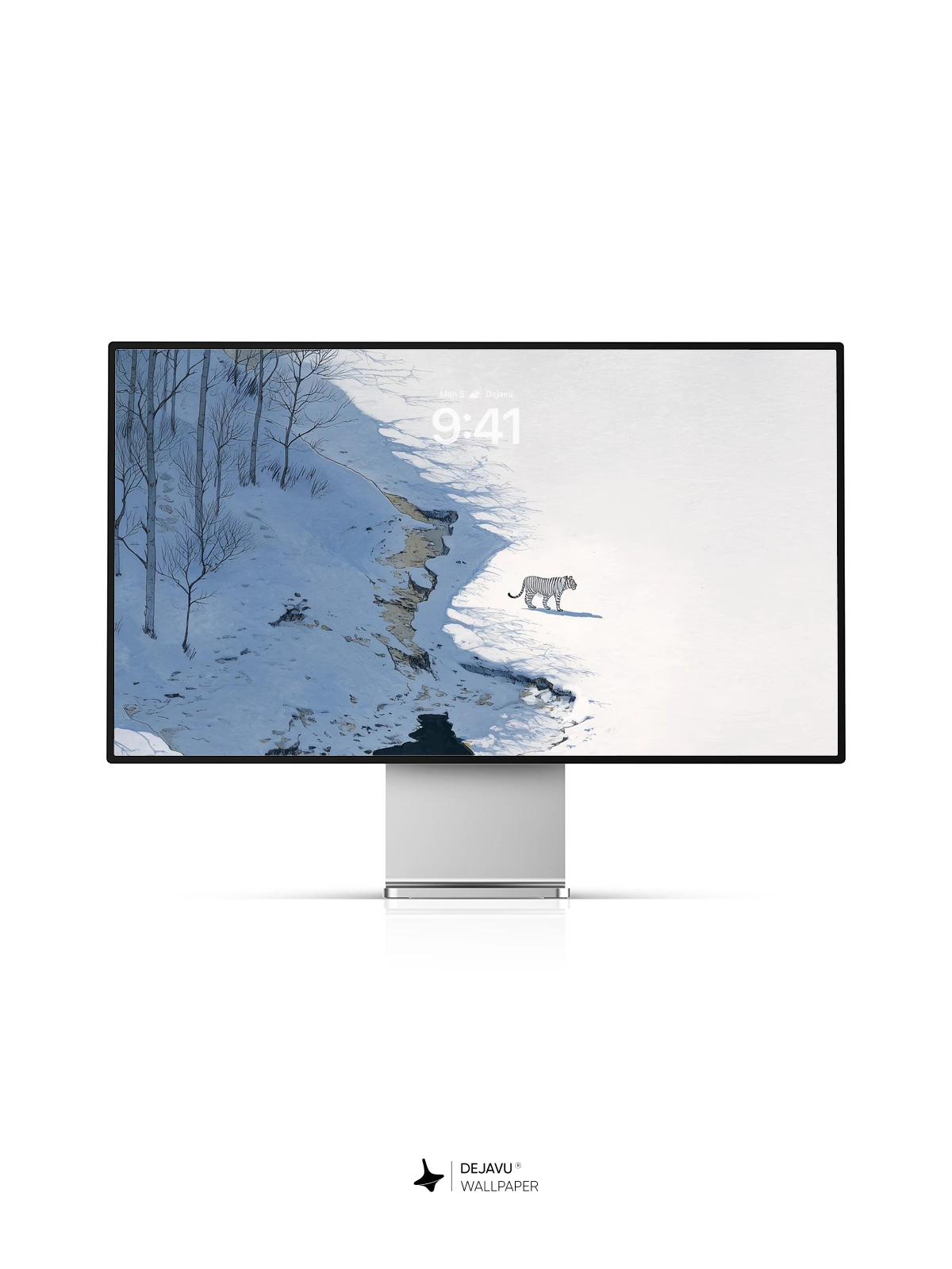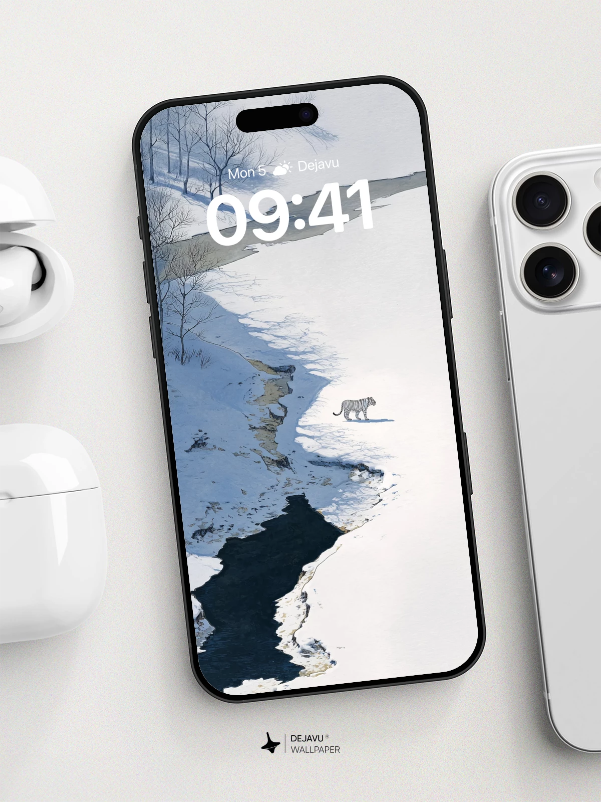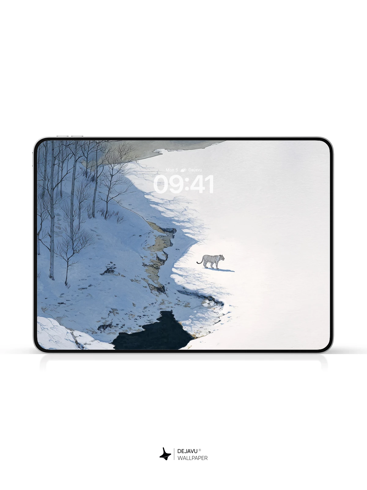 This high-resolution 8K wallpaper features a majestic white tiger walking along a snow-covered riverbank. The minimalist composition and cool color palette create a calm, sophisticated atmosphere, making it an ideal background for iPhone, Android, and tablets.