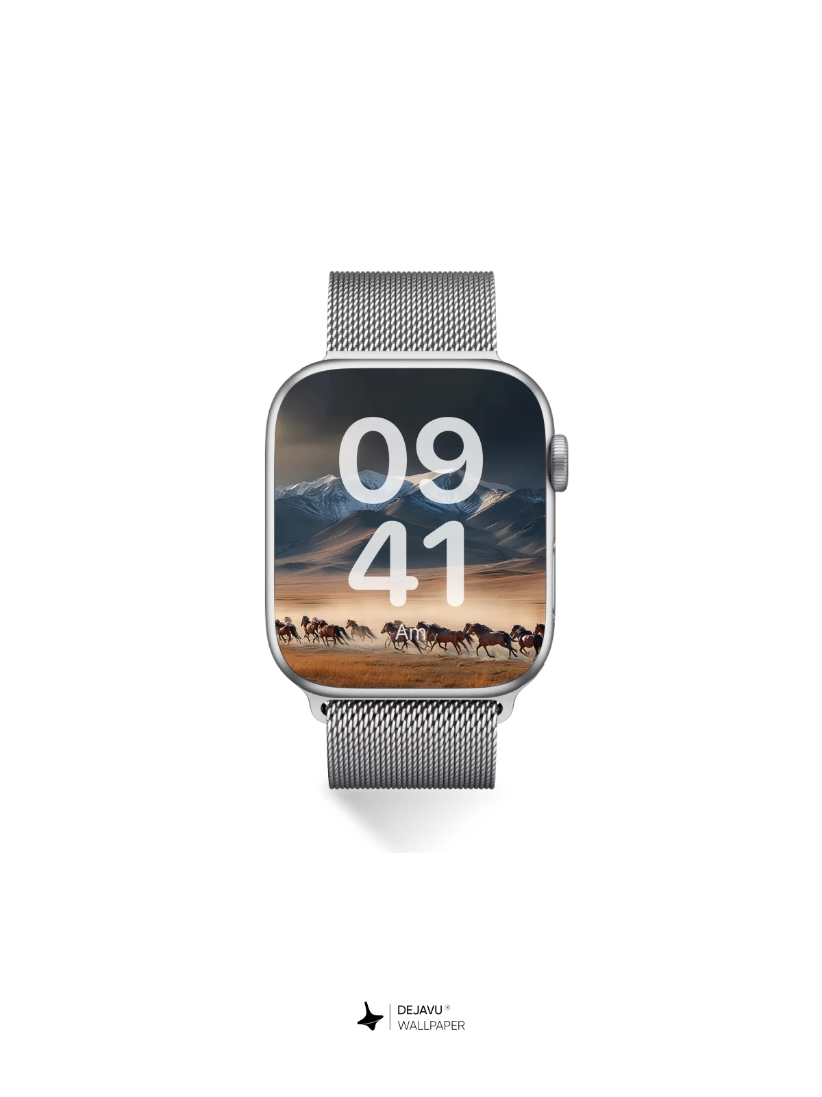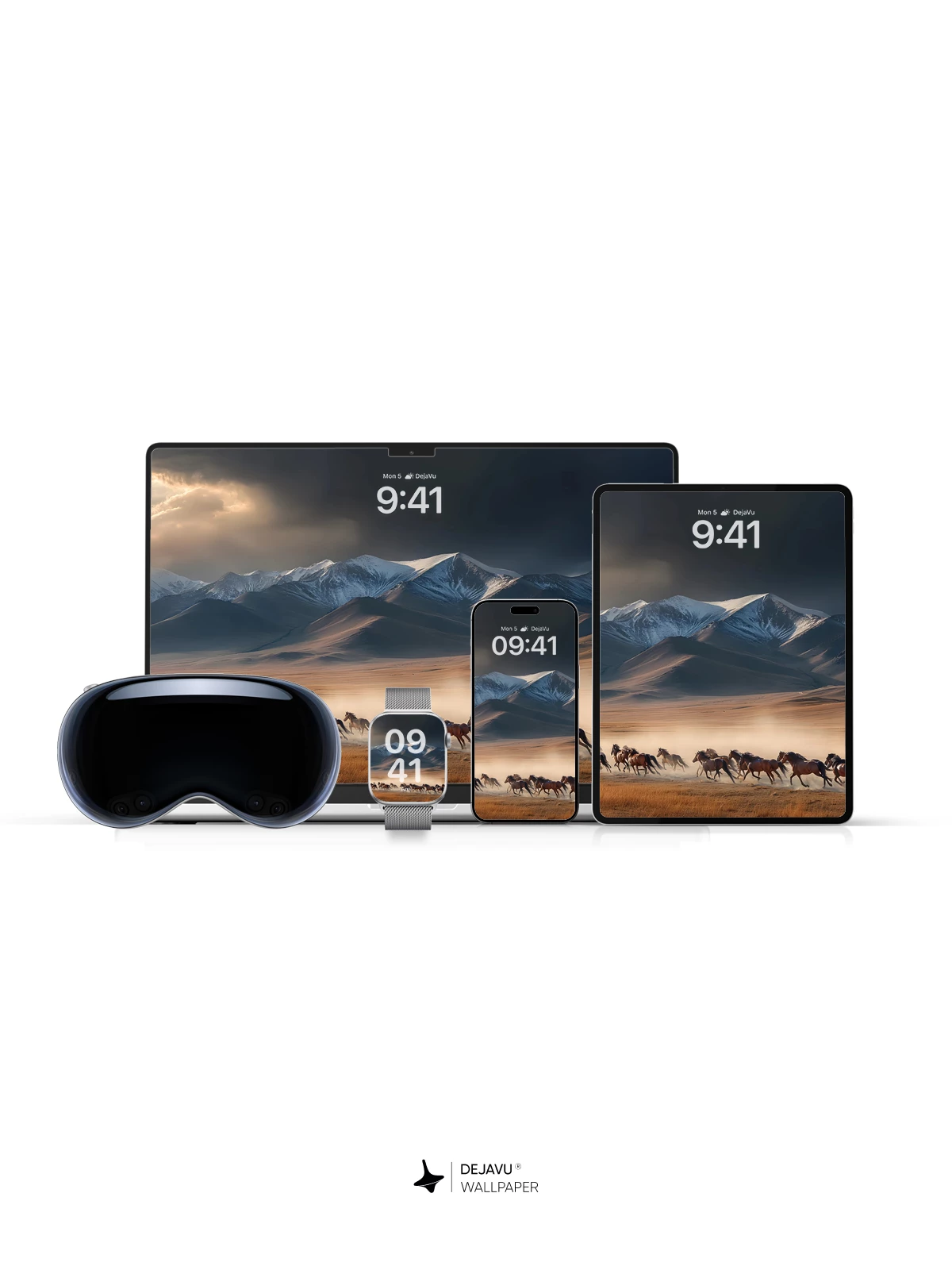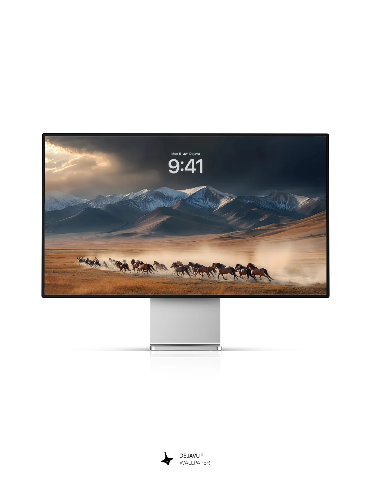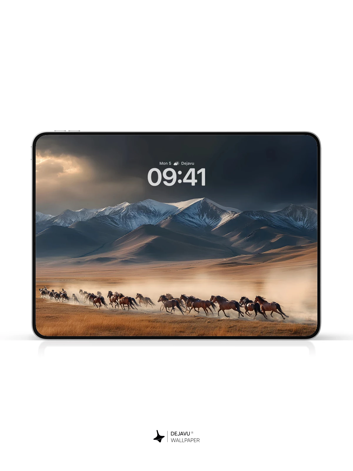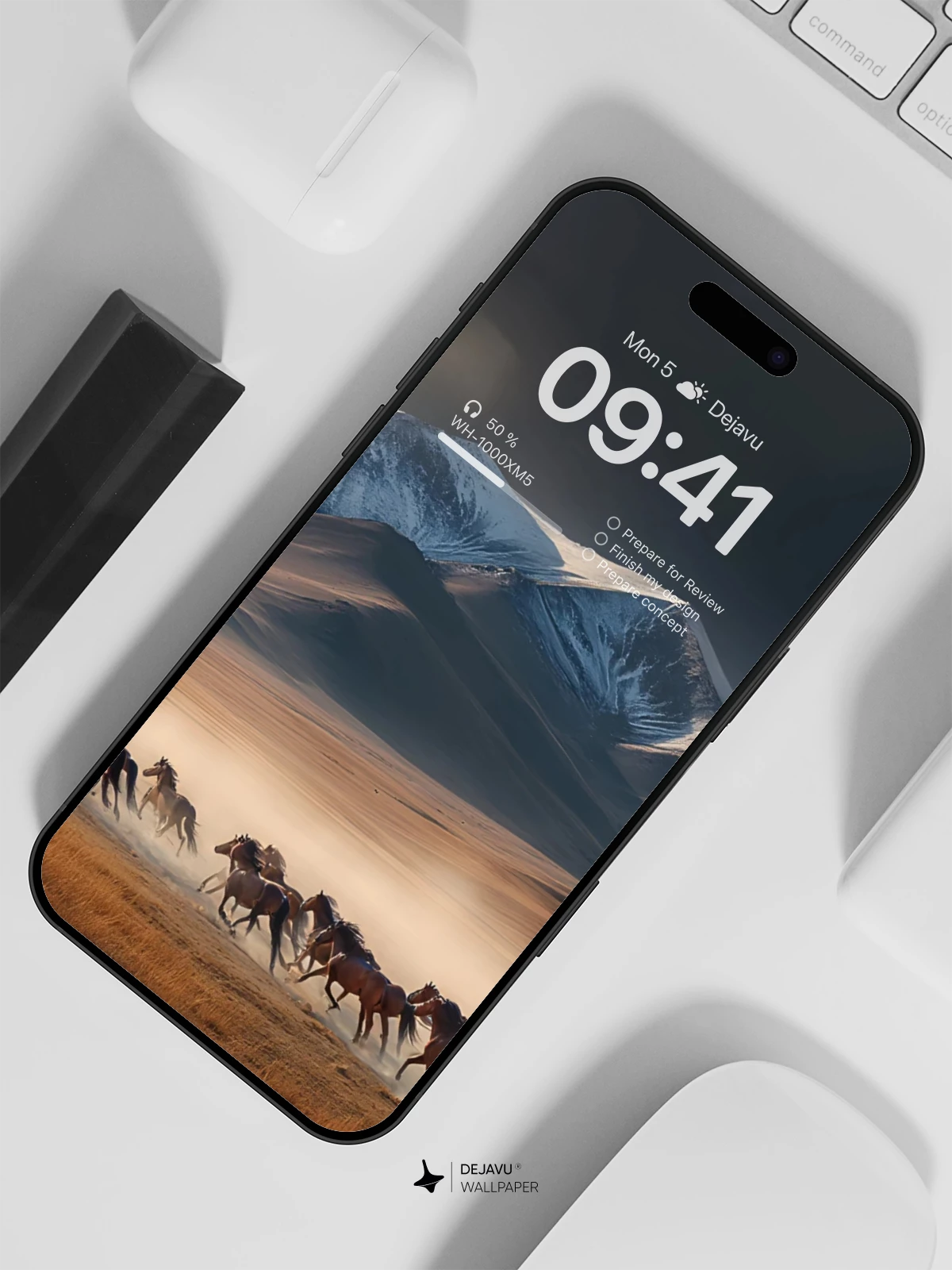 This stunning 8K wallpaper captures the raw power and freedom of wild horses galloping across a vast desert plain, kicking up dust beneath a dramatic sky. Snow-capped peaks rise in the distance, adding depth and grandeur to the scene. The image evokes a sense of untamed wilderness and timeless beauty, making it an ideal high-resolution background for iPhone, Android, and tablets. Its cinematic composition and natural lighting bring the wild landscape to life—perfect for those who seek immersive, nature-inspired digital art.