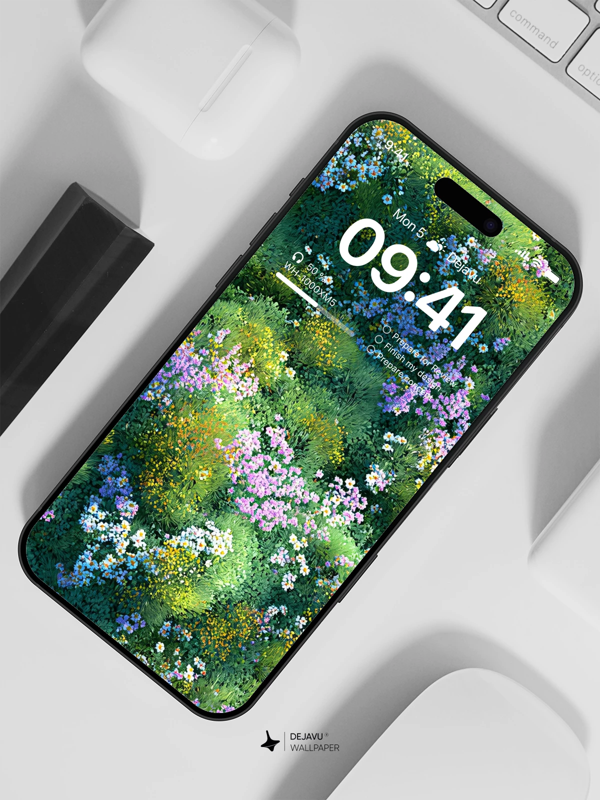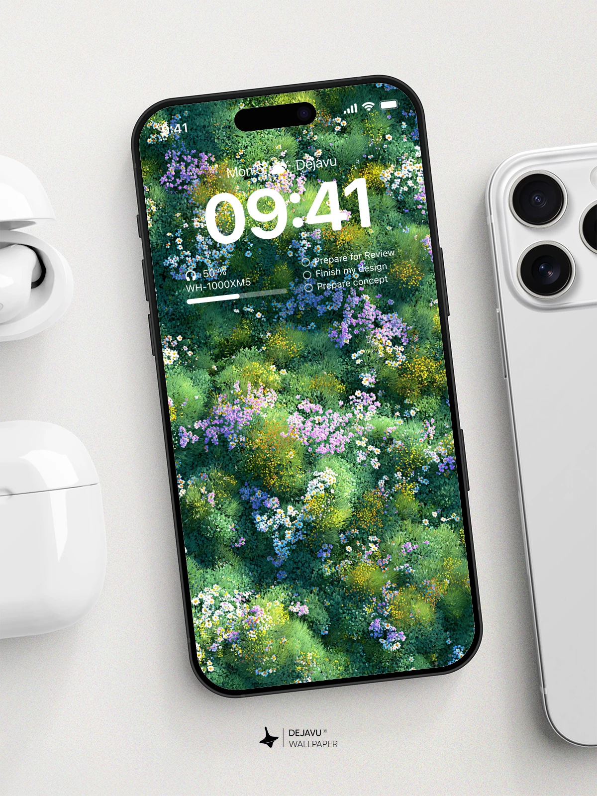 This 8K wallpaper captures a dense meadow from a bird’s-eye view, layering clusters of daisies, lavender, and goldenrod into a textured green field. The light feels natural and even, with no hard shadows, giving it a calm, painterly mood. Ideal for iPhone, Android, and tablets, it brings a touch of quiet nature to your screen without overwhelming the icons.