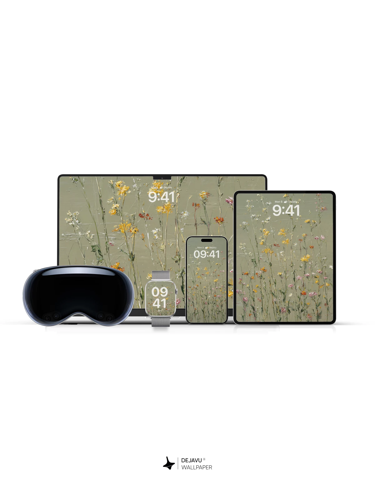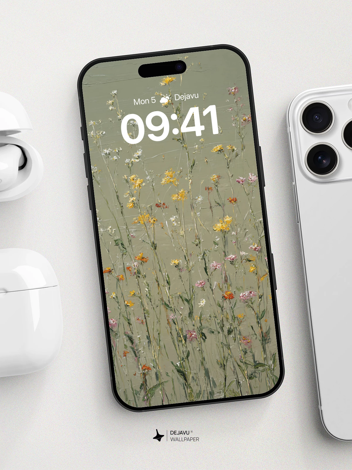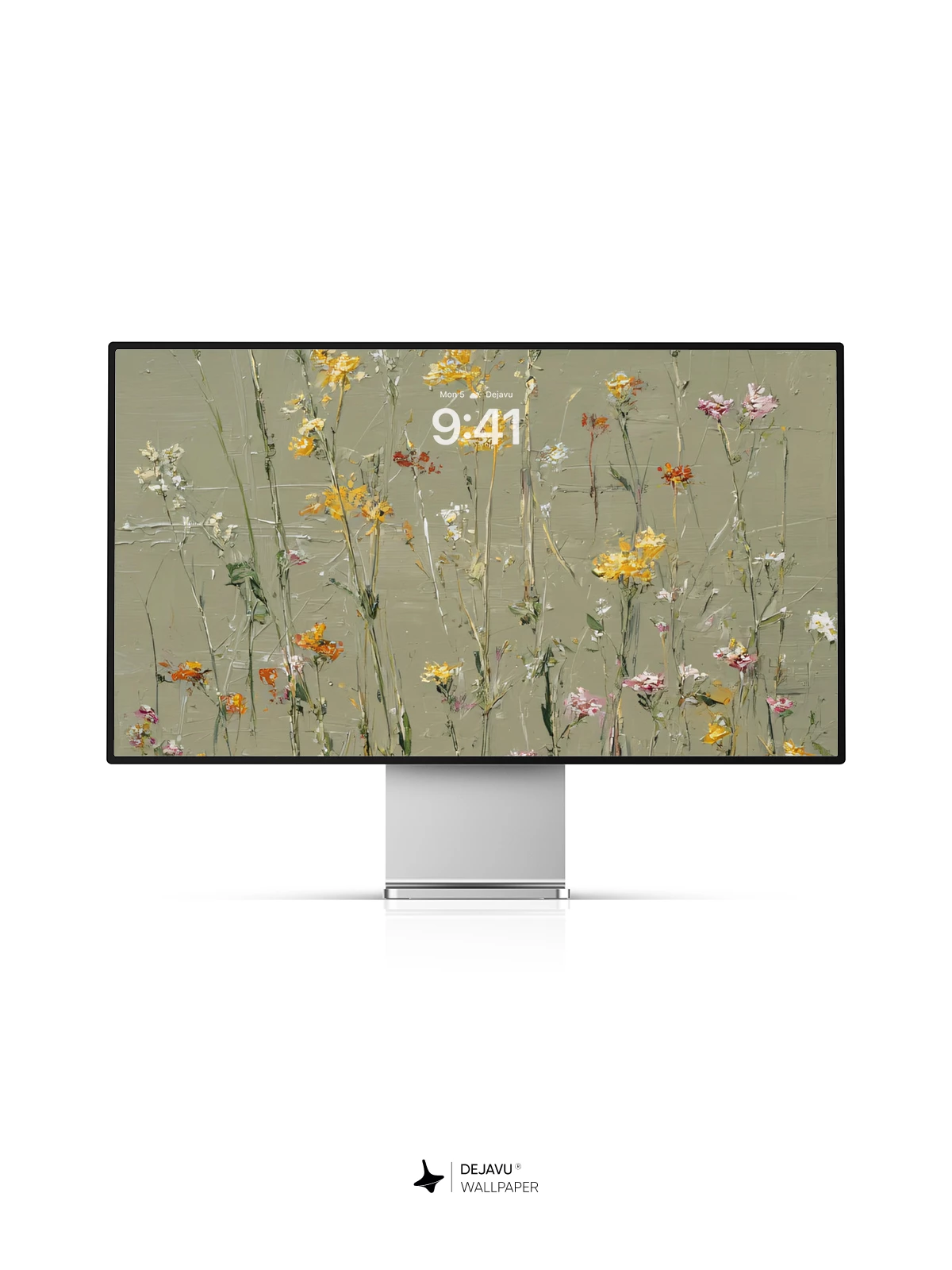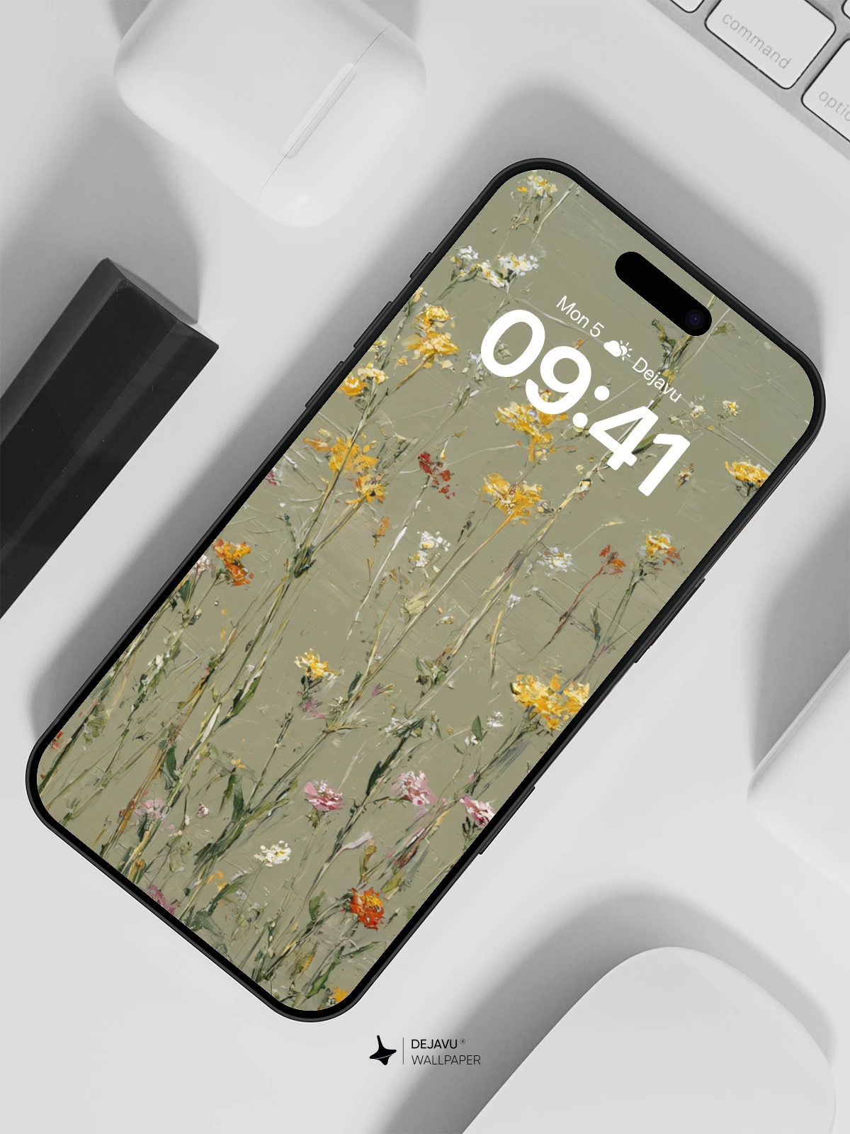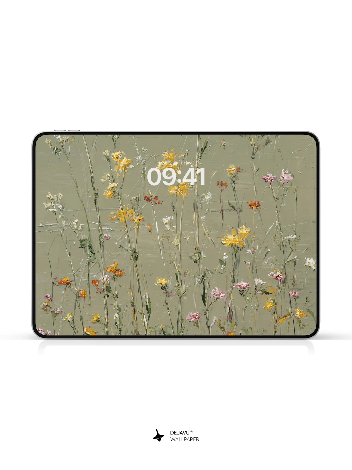 This evocative oil painting captures the quiet beauty of a wildflower meadow, with slender stems and vibrant blooms in pale yellows, pinks, and whites dancing against a muted olive backdrop. Inspired by the impressionistic brushwork of artists like Monet, the piece exudes tranquility and natural grace. Perfect as an 8K wallpaper for iPhone, Android, or tablet, it brings a touch of poetic serenity to your daily screen experience.