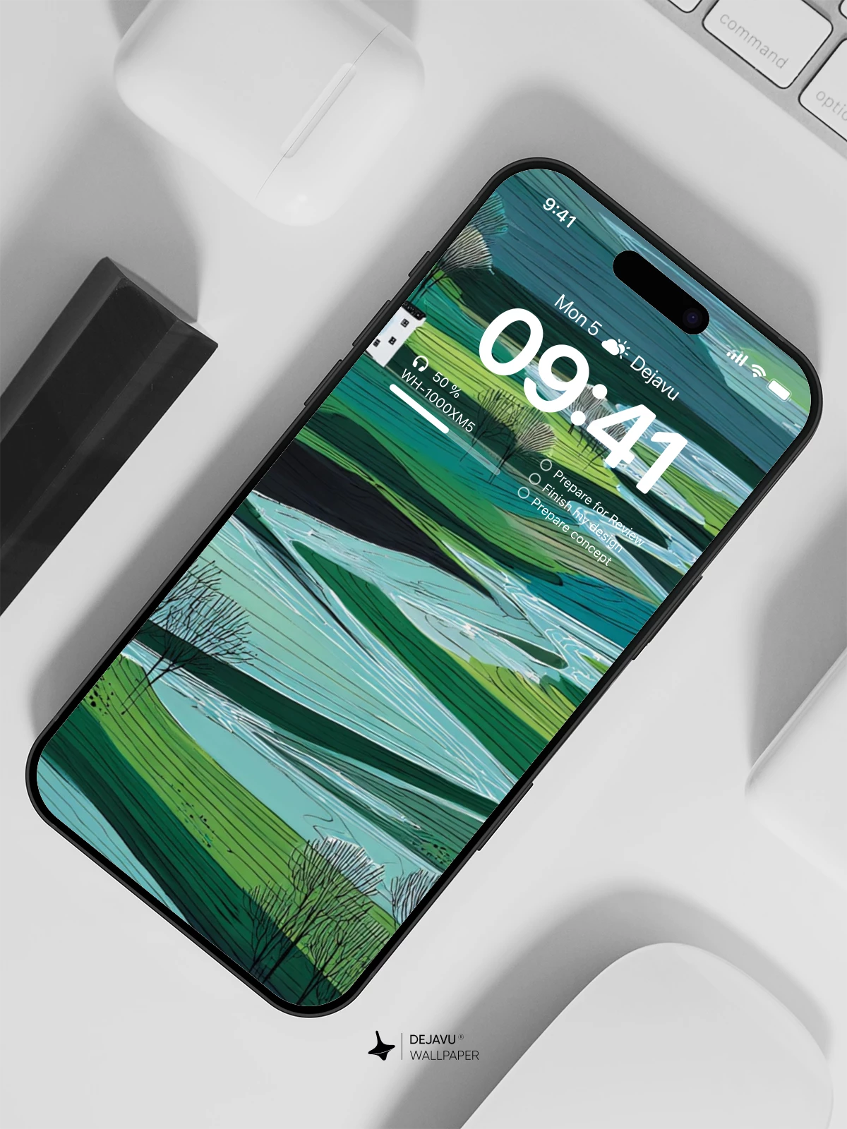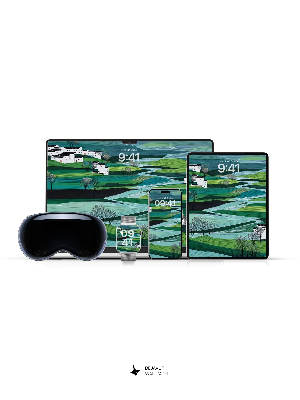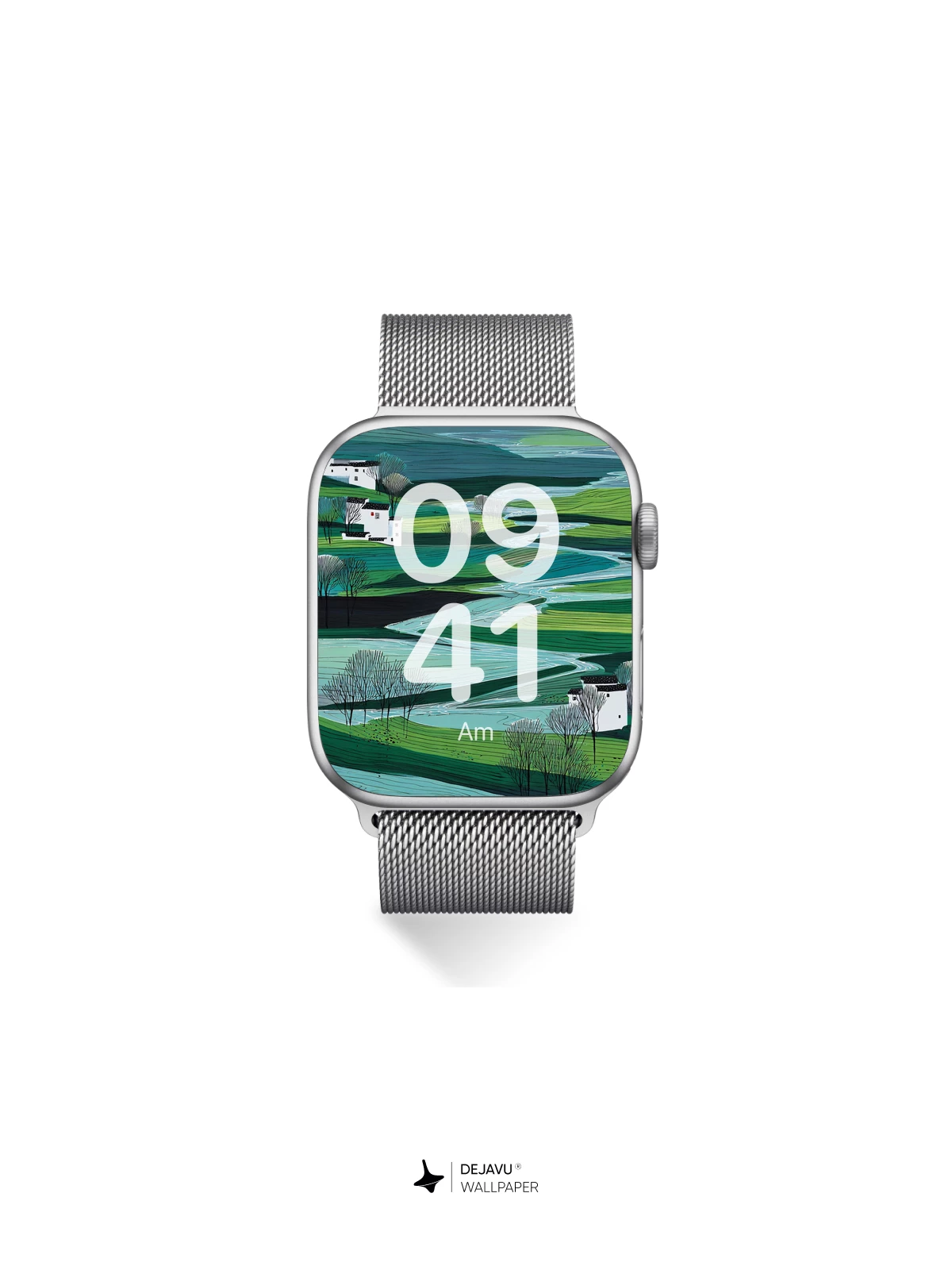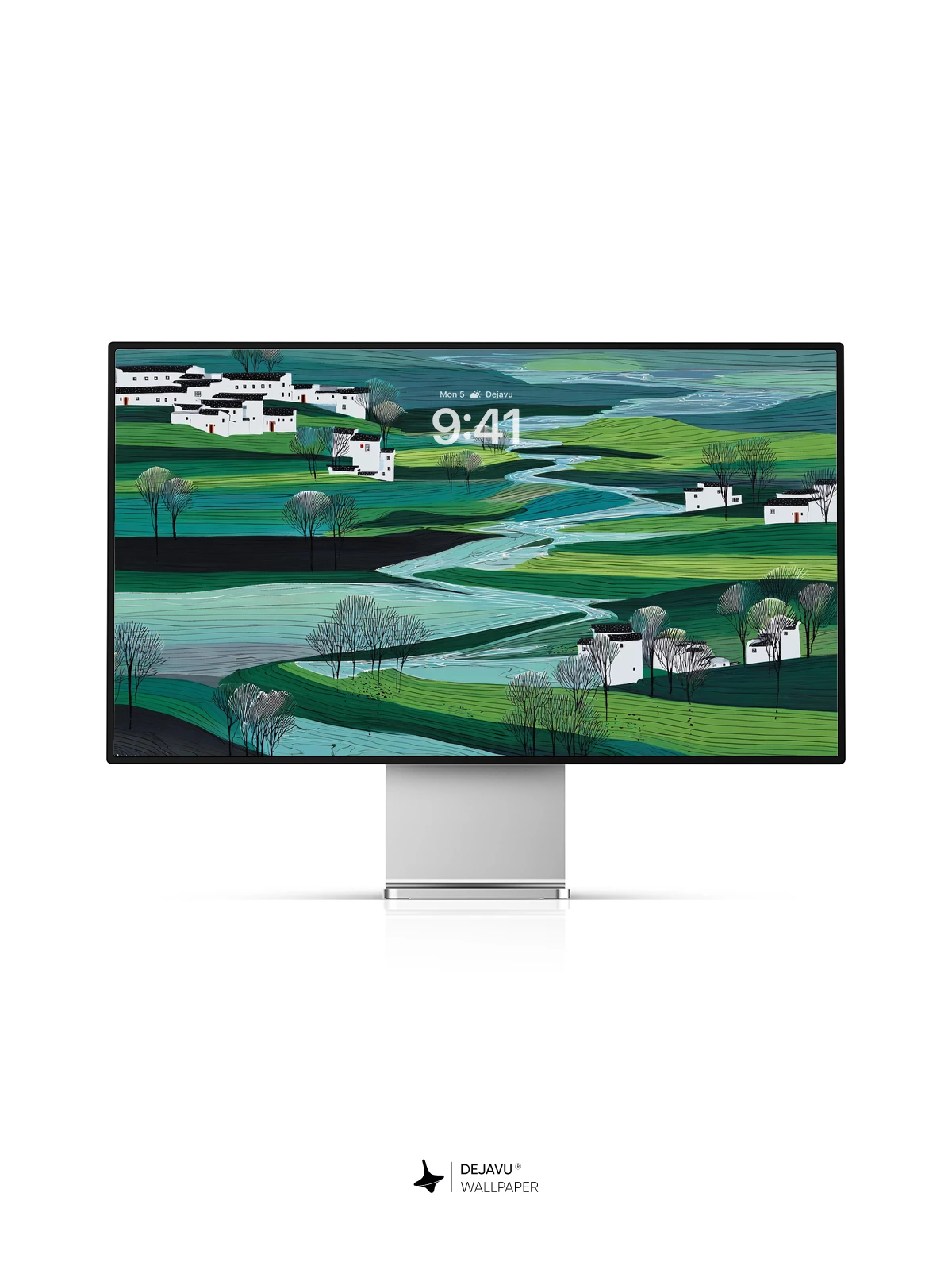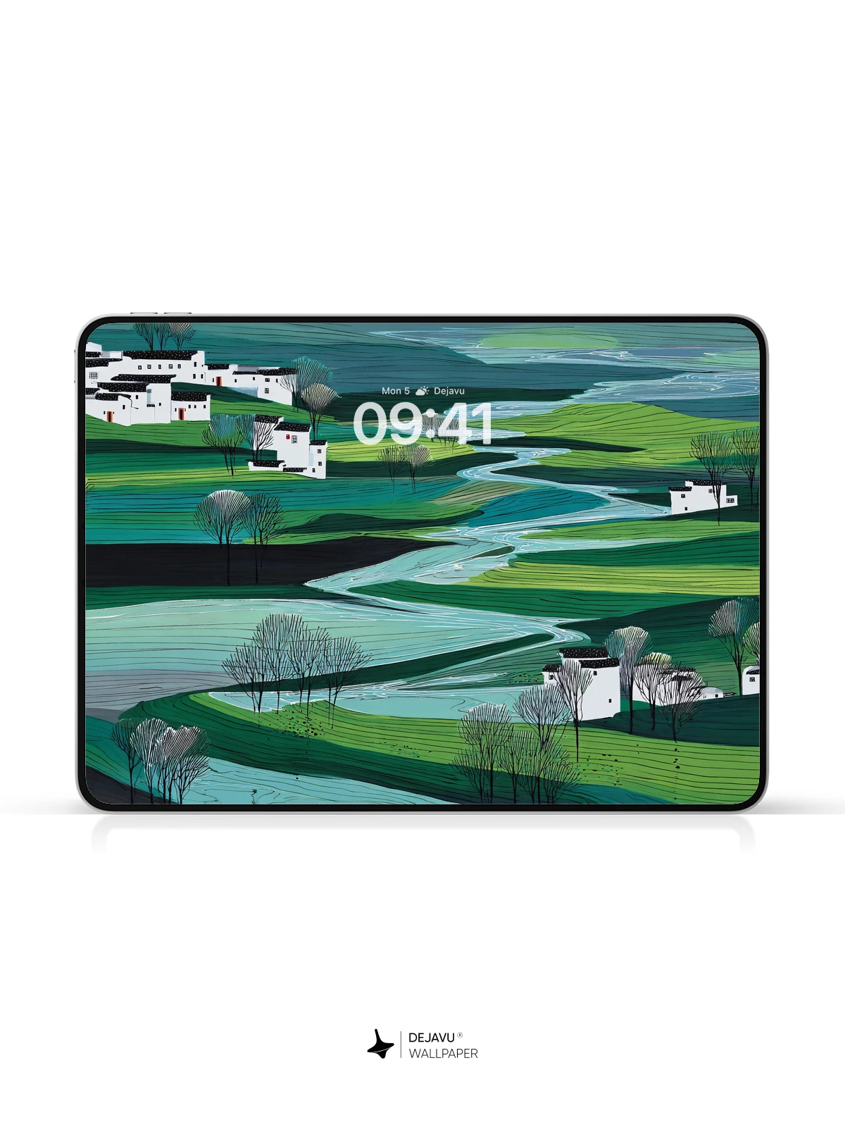 This wallpaper captures a tranquil scene with a meandering river cutting through verdant fields and clusters of white houses. The soft, painterly style and vibrant greens create a soothing atmosphere, perfect for enhancing the look of your iPhone, Android, or tablet screen.