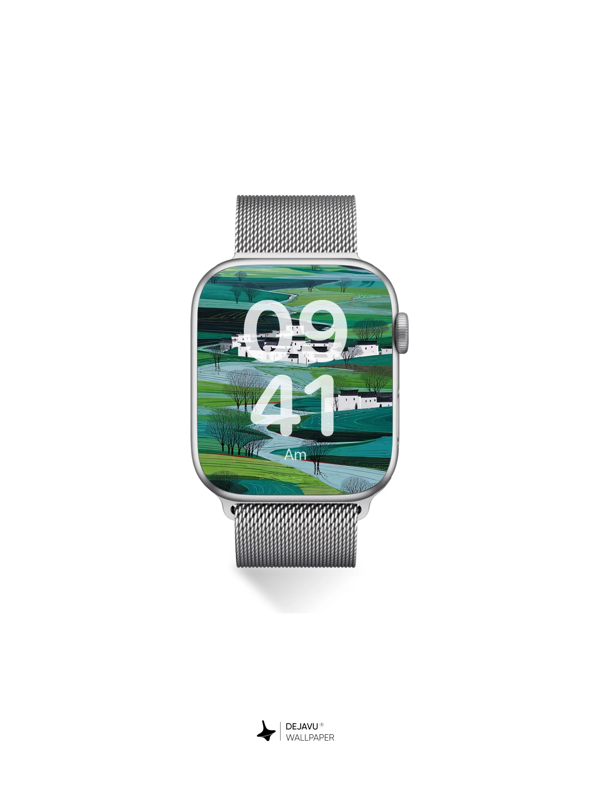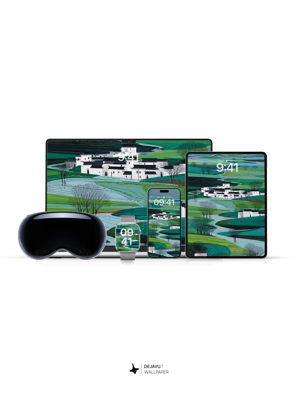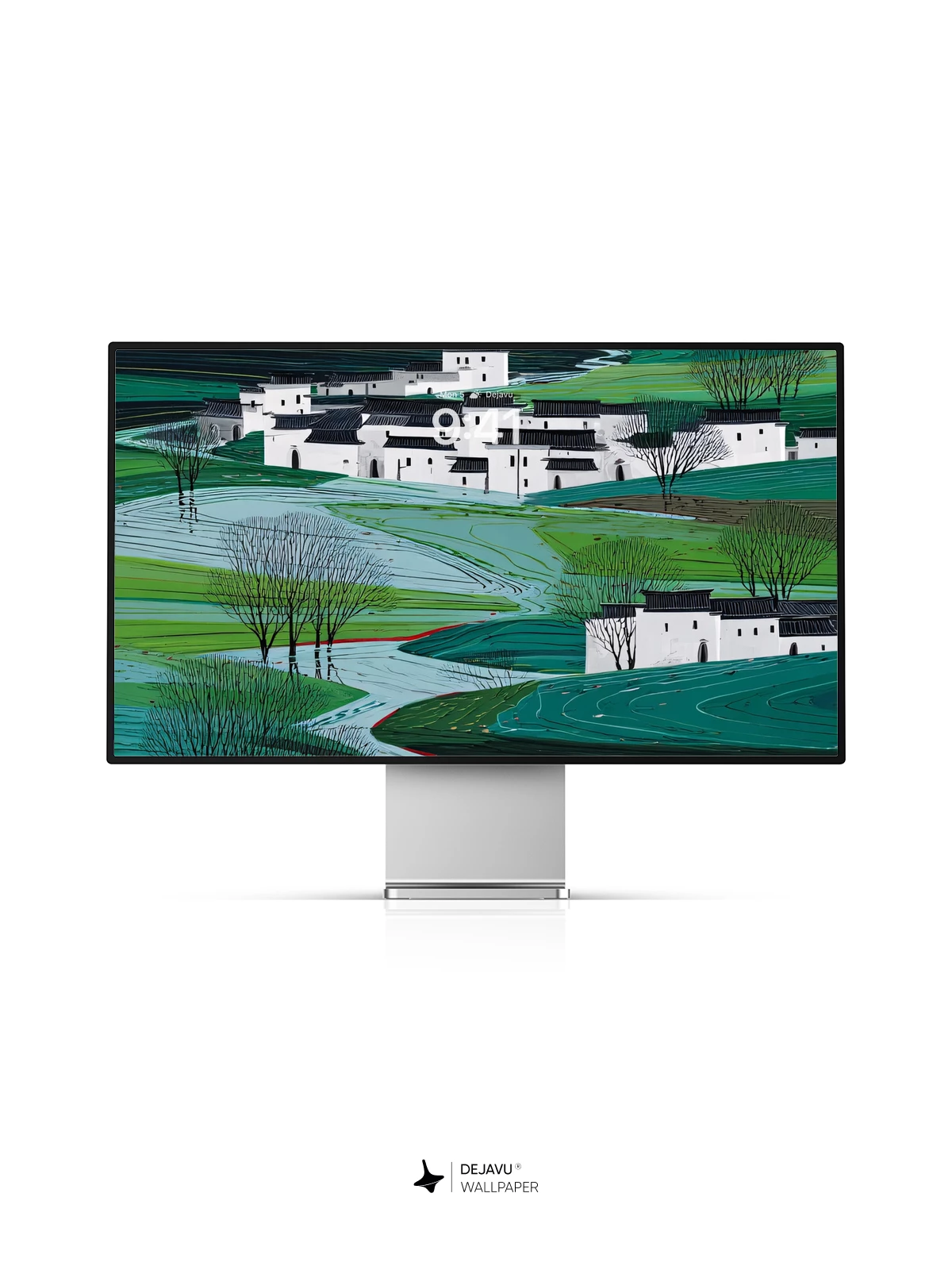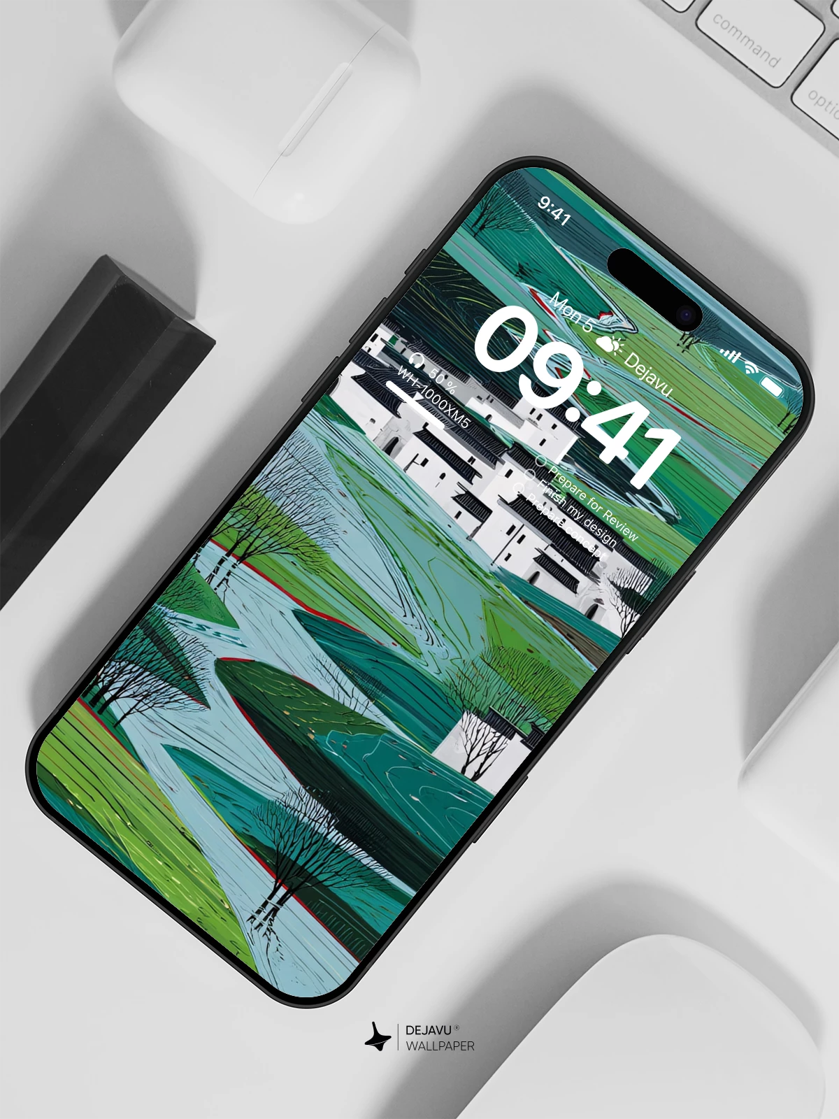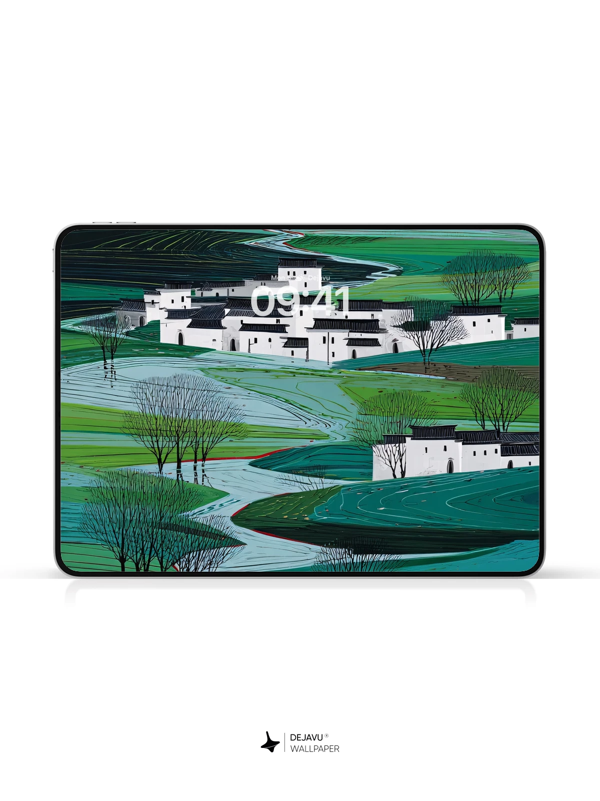 This 8K wallpaper showcases a stylized landscape with a winding river, white buildings, and rolling green hills. The minimalist design and soothing color palette create a calming effect, making it an ideal choice for your iPhone, Android, or tablet screen.