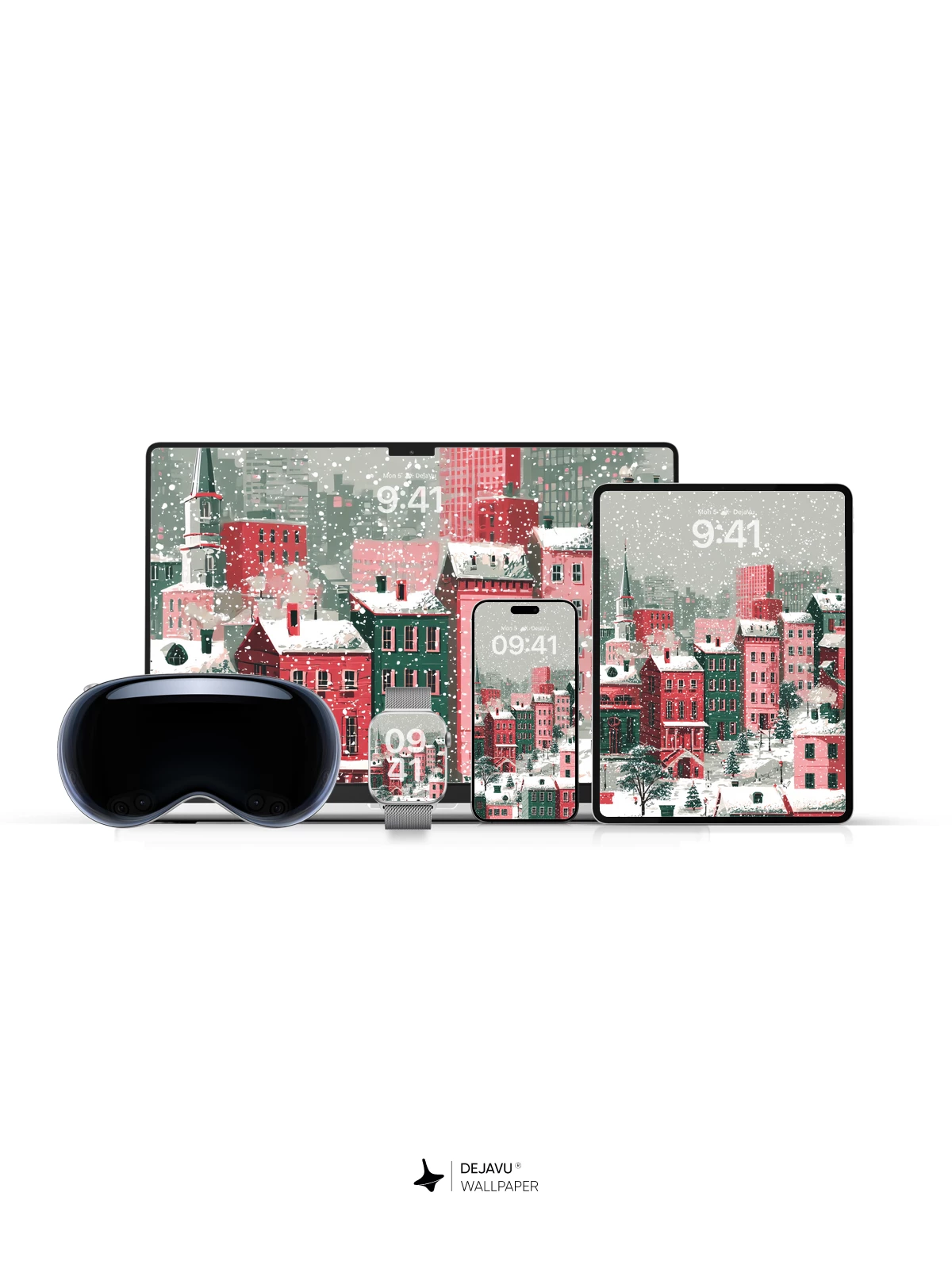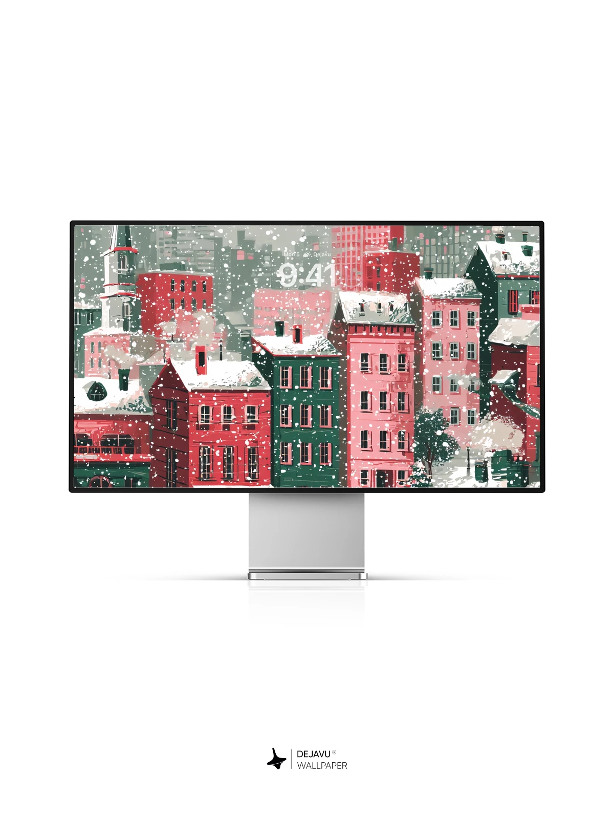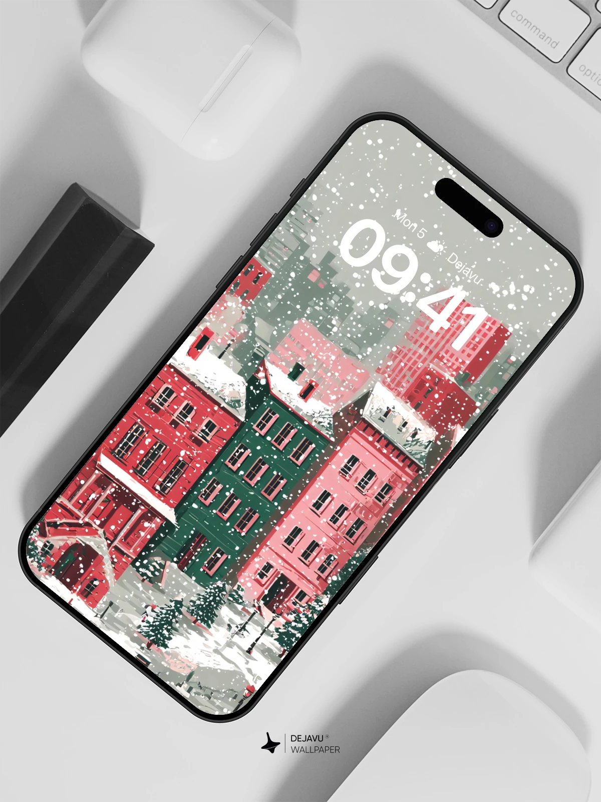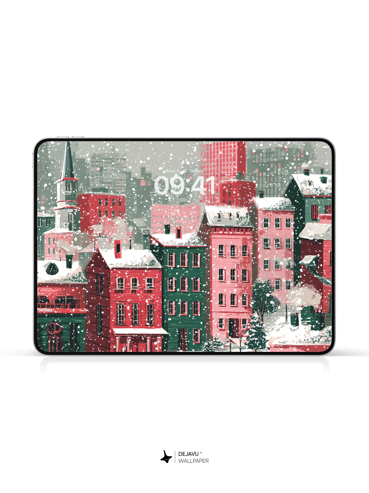 This enchanting winter cityscape captures a whimsical urban scene blanketed in gentle snowfall, where colorful buildings glow under a soft gray sky. With its bold palette of reds, pinks, and emerald greens, the illustration evokes a nostalgic holiday spirit—ideal as an 8K wallpaper for iPhone, Android, or tablets. The artistic style draws inspiration from modern illustrative design, balancing warmth and charm with crisp detail. Whether you’re seeking seasonal cheer or a visually soothing backdrop, this image brings a serene, storybook winter to your device.