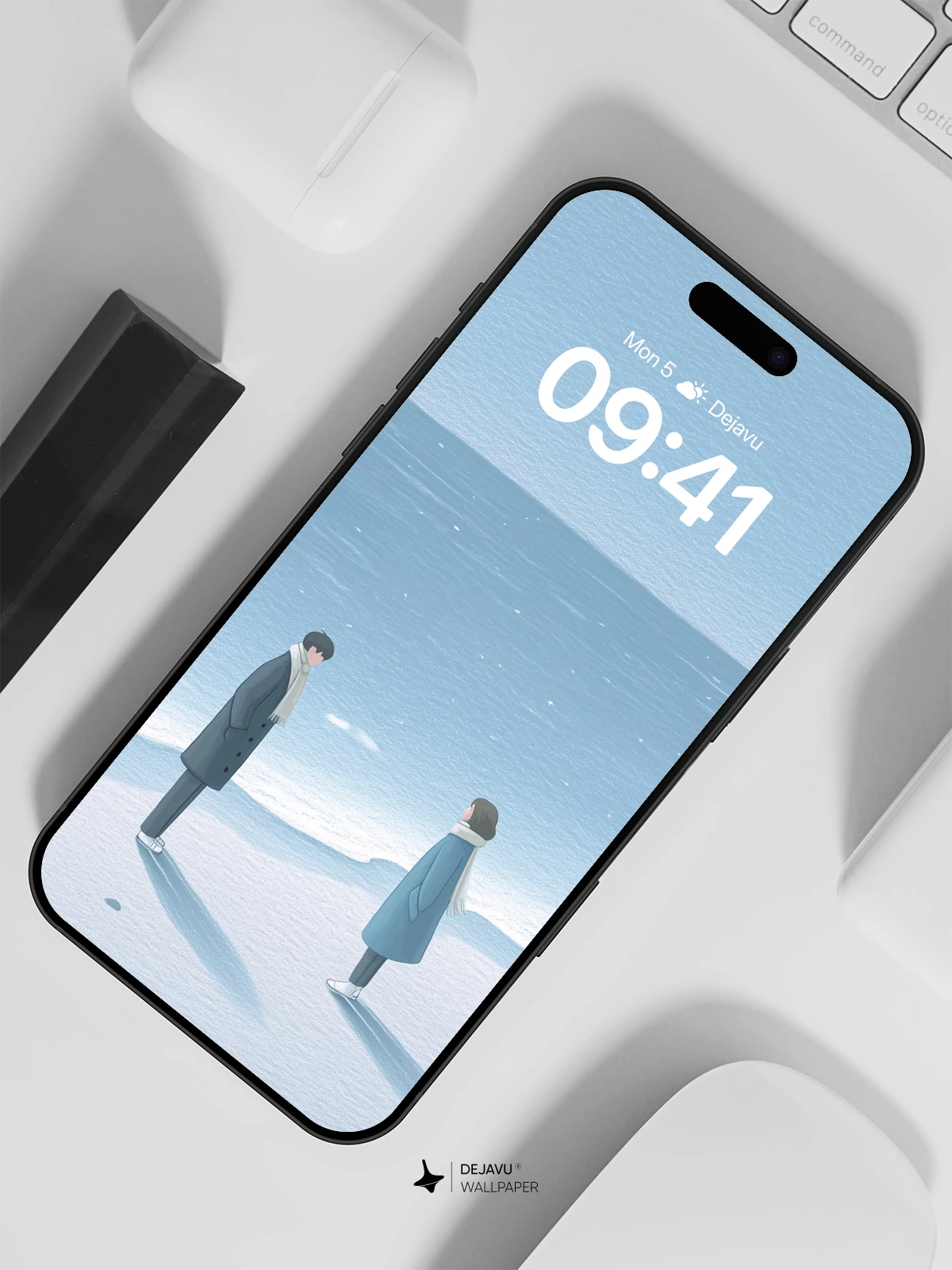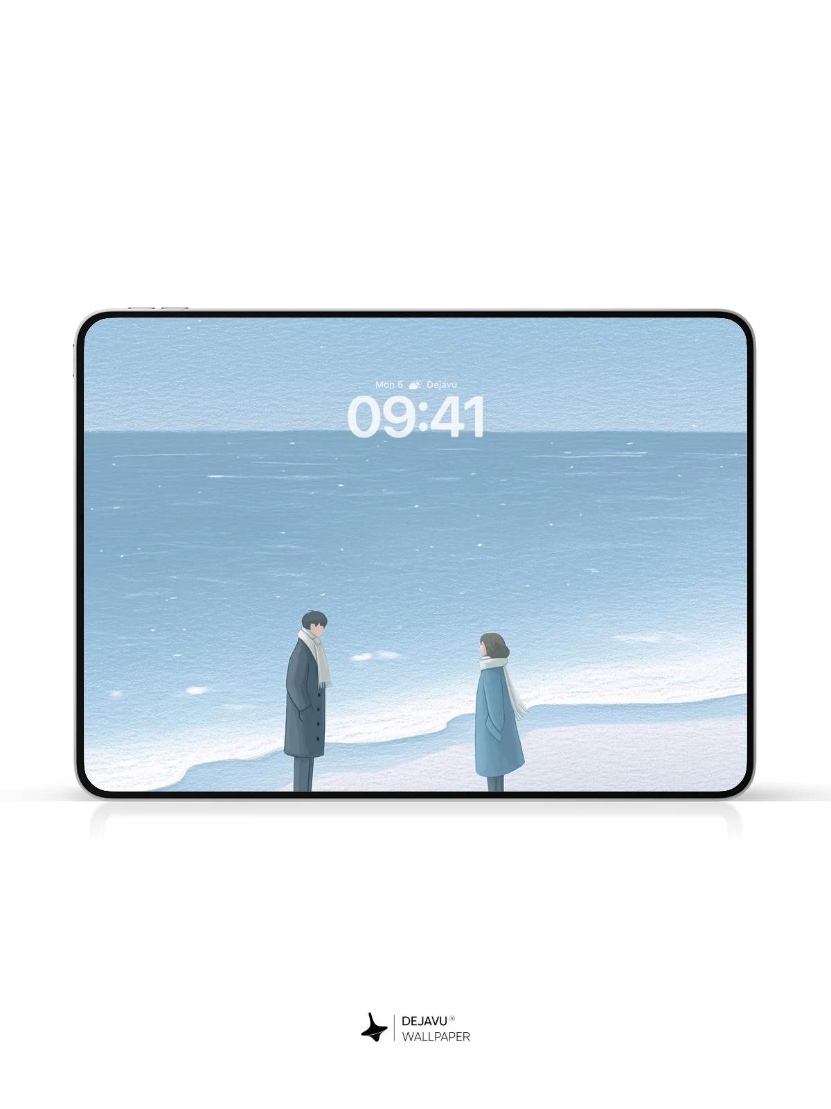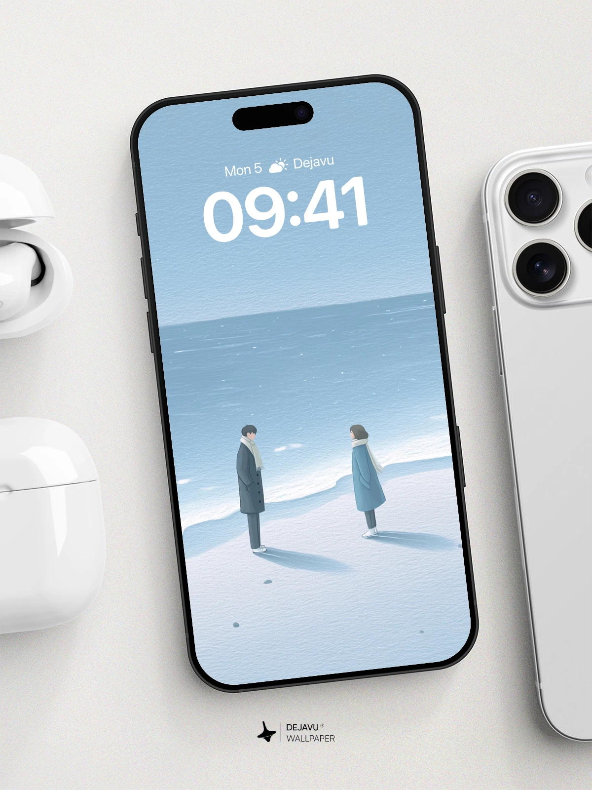 In this evocative illustration, two solitary figures stand on an endless snow-covered beach, facing each other against the tranquil expanse of icy sea and sky. The soft pastel palette and delicate brushwork evoke a sense of introspection and quiet connection, reminiscent of contemporary Japanese art styles. Perfect as an 8K wallpaper for iPhone, Android, or tablet, this image captures the stillness of winter with poetic grace, transforming your device into a portal of peaceful reflection.