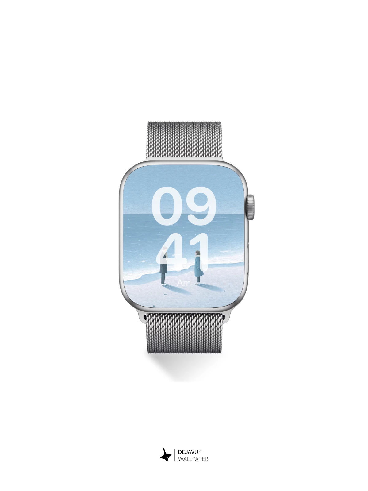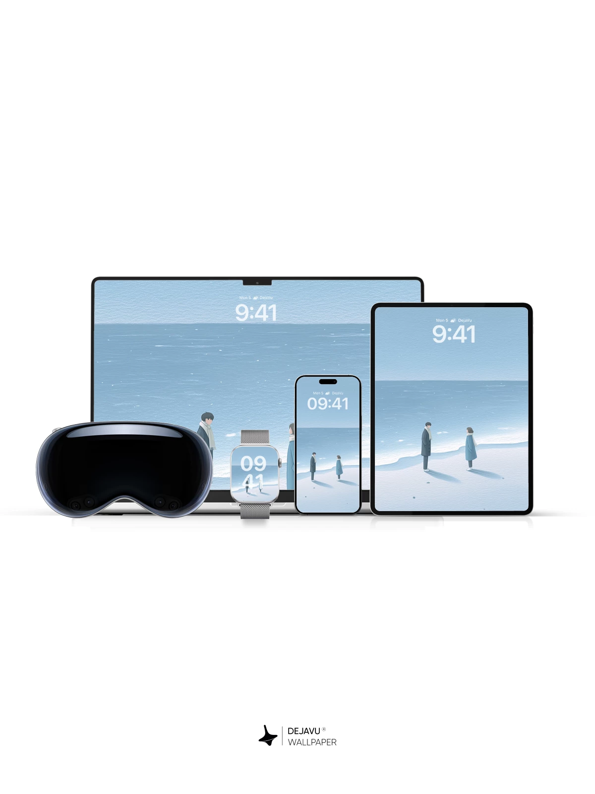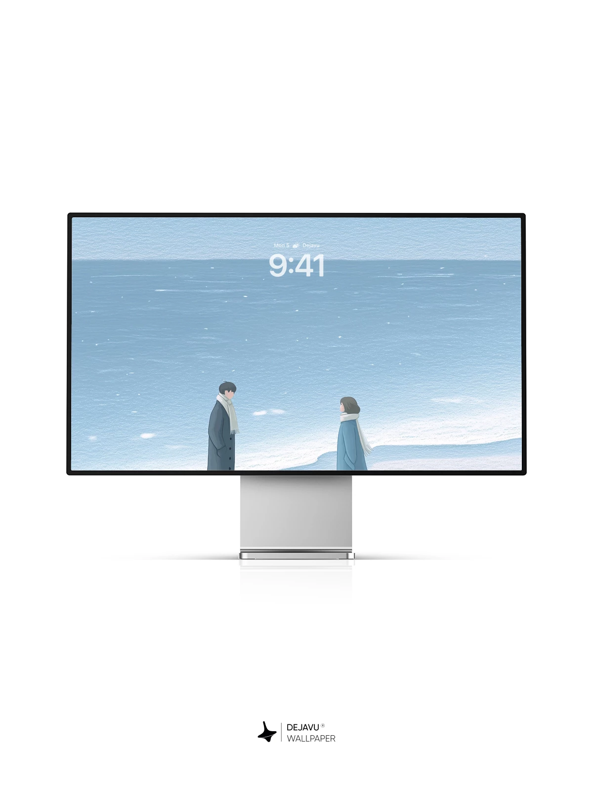 In this evocative illustration, two solitary figures stand on an endless snow-covered beach, facing each other against the tranquil expanse of icy sea and sky. The soft pastel palette and delicate brushwork evoke a sense of introspection and quiet connection, reminiscent of contemporary Japanese art styles. Perfect as an 8K wallpaper for iPhone, Android, or tablet, this image captures the stillness of winter with poetic grace, transforming your device into a portal of peaceful reflection.