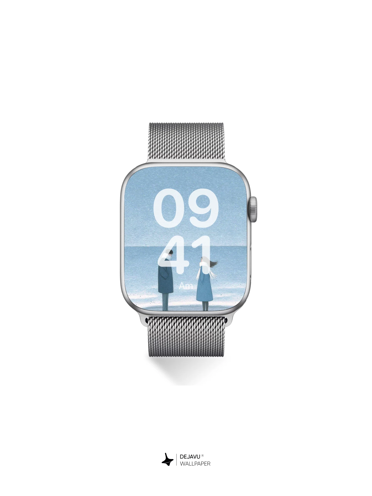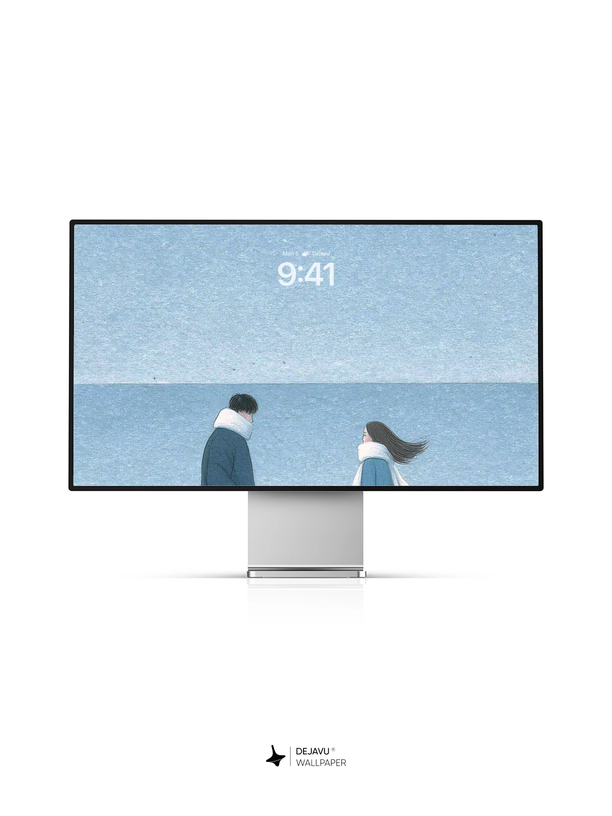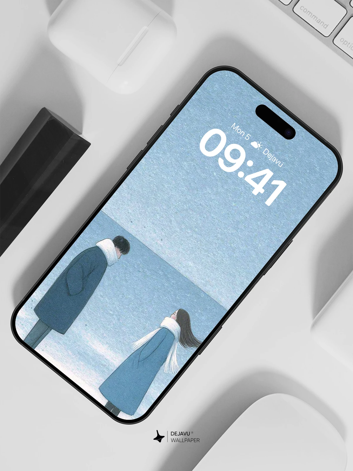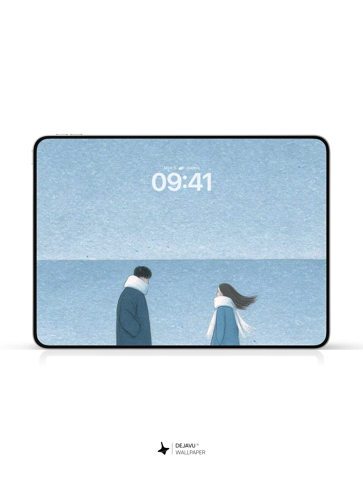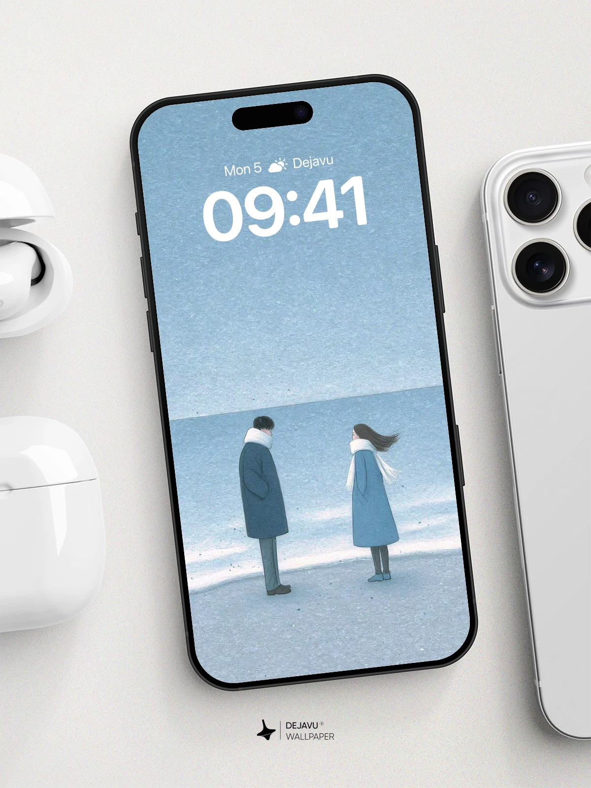 This beautifully illustrated wallpaper captures a quiet moment between two figures on a snow-dusted beach under a vast, pale sky. Dressed in warm coats with white fur collars, they stand apart yet connected by gaze, evoking themes of longing and stillness. The muted blue palette and delicate brushwork create a dreamlike atmosphere, reminiscent of contemporary Japanese illustration styles. Perfect for iPhone, Android, and tablets, this 8K wallpaper brings calm and elegance to your mobile device, making it ideal for those who appreciate emotional depth and minimalist artistry.”.