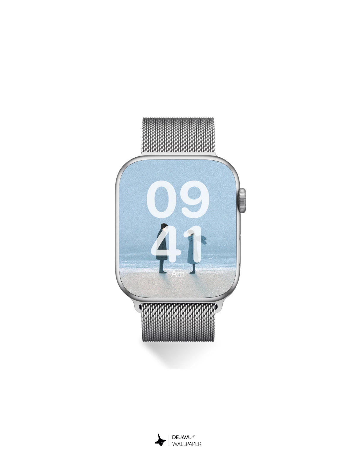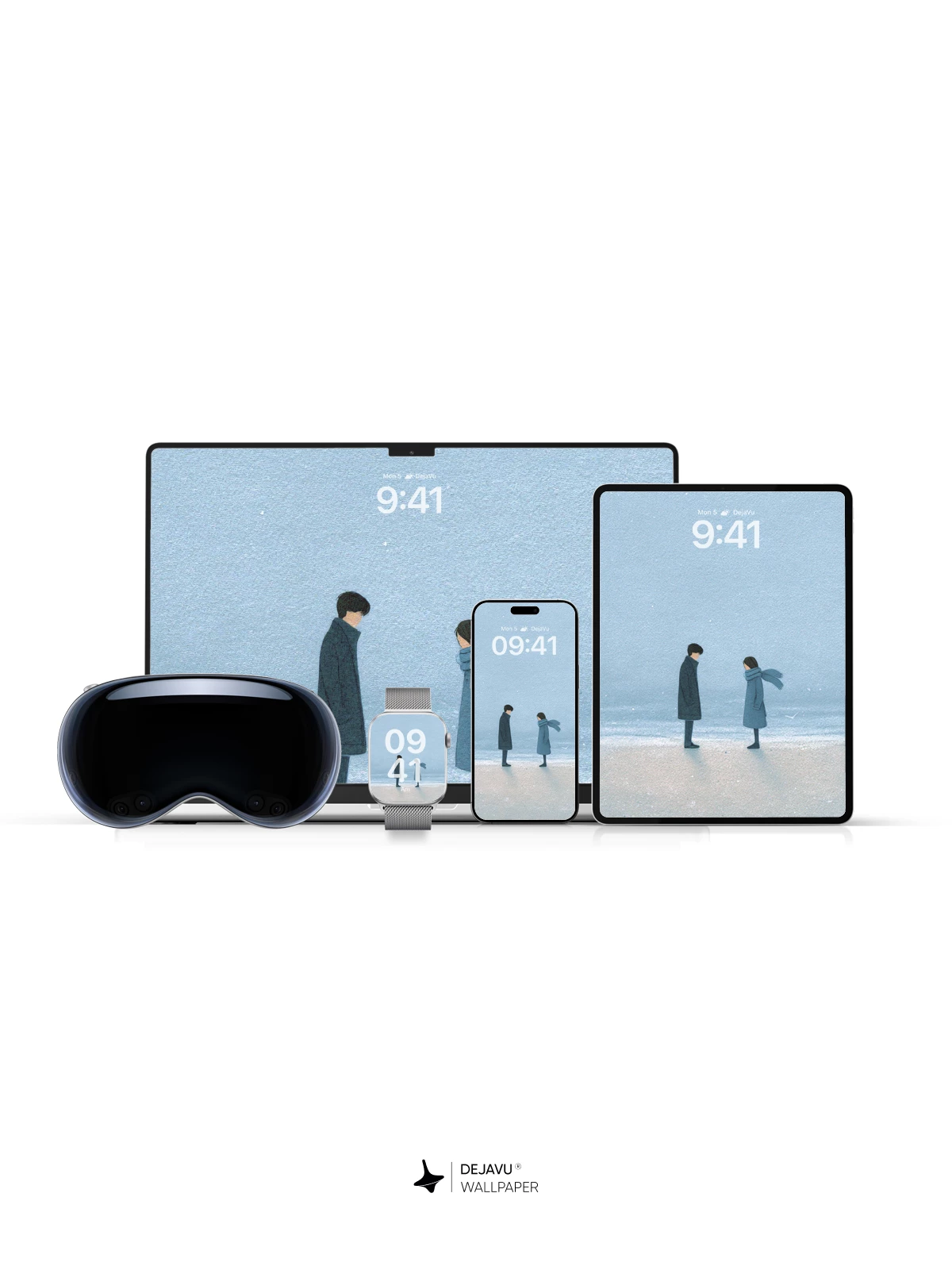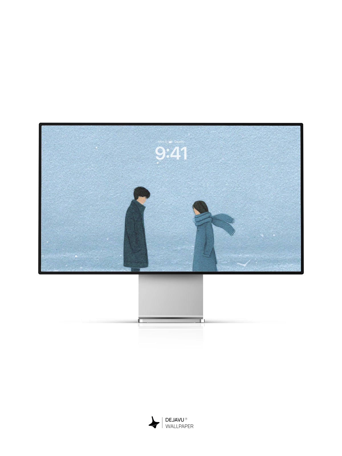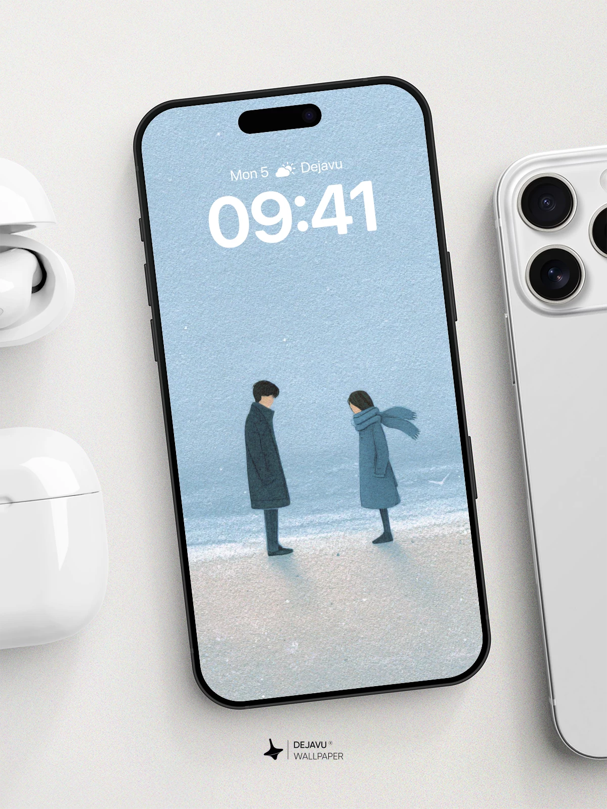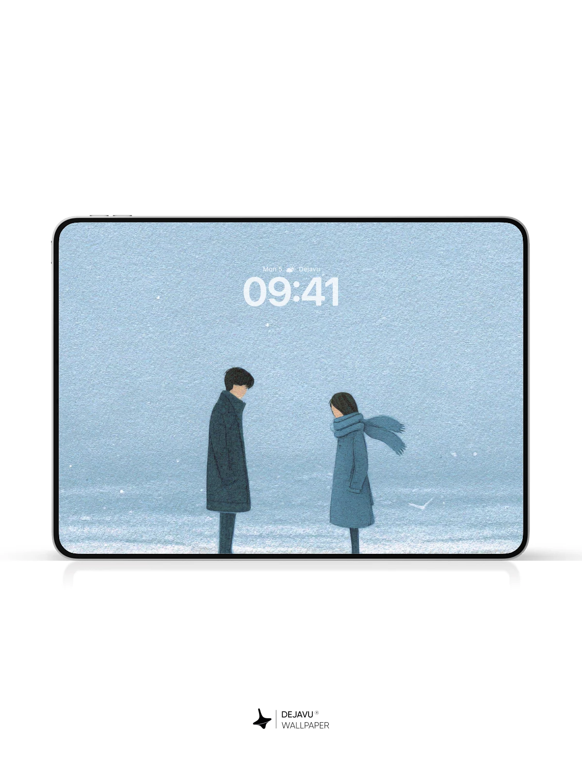 This beautifully illustrated winter scene captures a quiet moment between two people on a snow-dusted beach, their silhouettes small against a vast, tranquil sky. Rendered in a delicate, painterly style reminiscent of contemporary Japanese illustration, the image evokes feelings of solitude, connection, and peaceful introspection. The muted blues and gentle textures create a calming atmosphere ideal for mobile backgrounds. Perfectly suited for iPhone, Android, and tablet screens, this 8K wallpaper brings a touch of poetic serenity to your device.”.