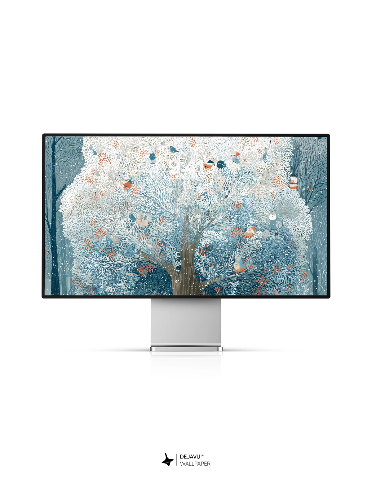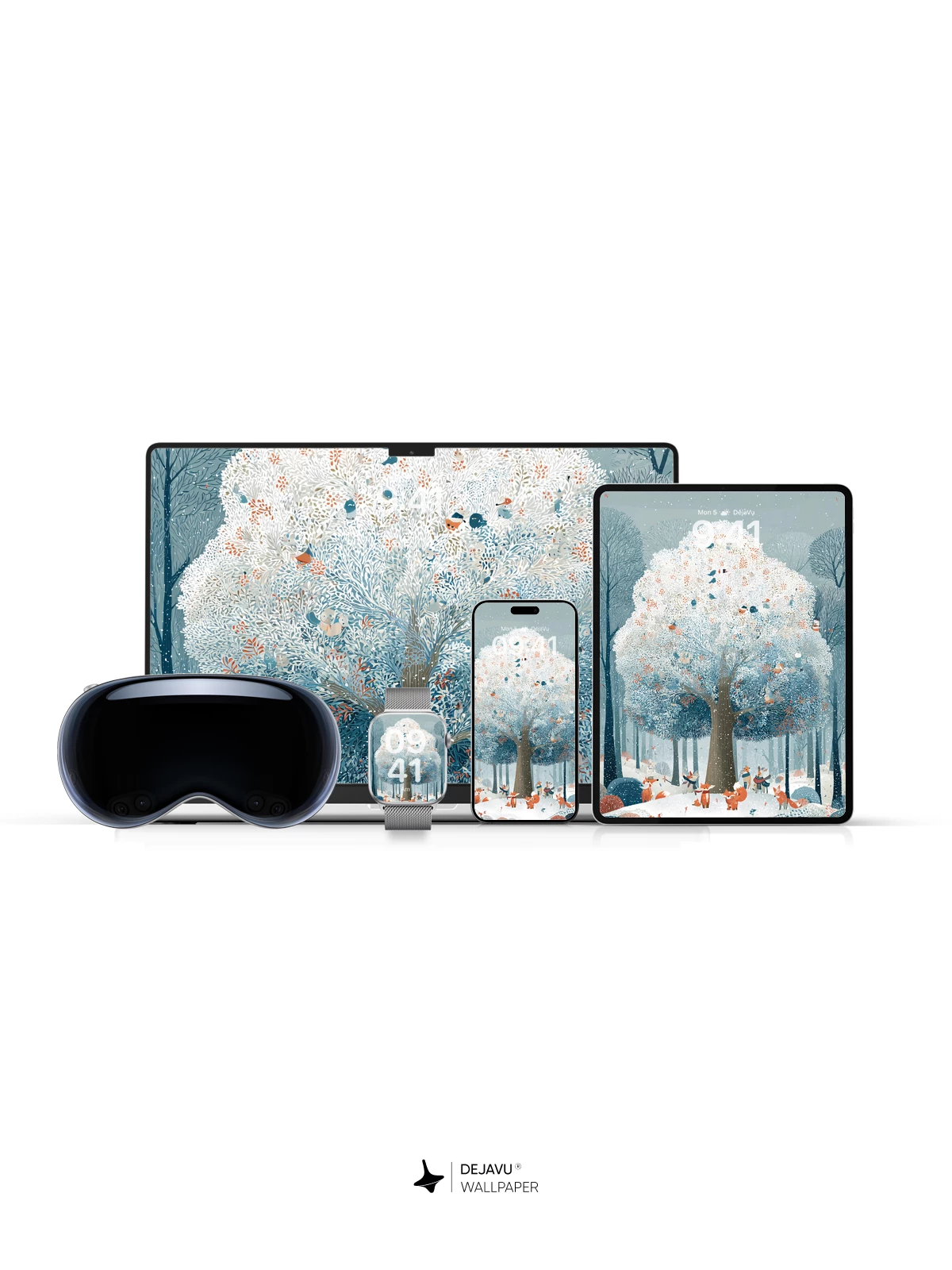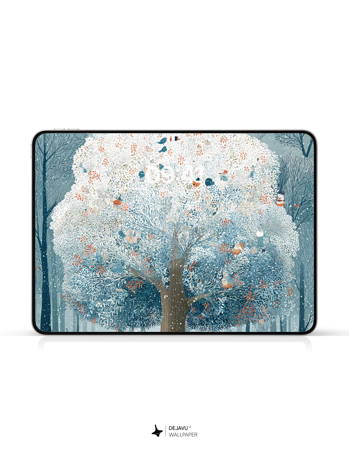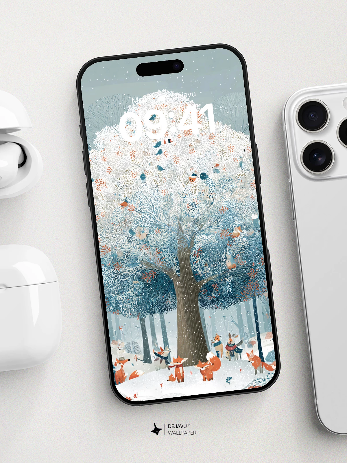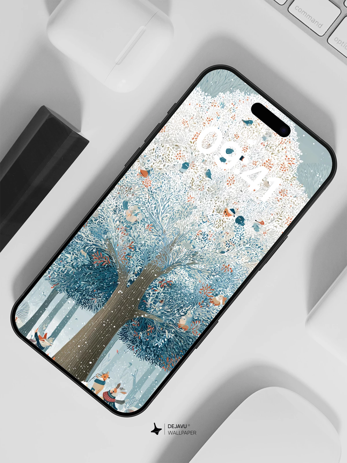 This enchanting winter forest illustration features playful foxes gathered beneath a majestic snow-laden tree, surrounded by quiet woods under falling snow. The whimsical, storybook-style art evokes a sense of peaceful wonder, ideal for bringing seasonal magic to your phone or tablet screen. With its soft palette and intricate details, this 8K wallpaper is beautifully optimized for both iPhone and Android devices, offering a dreamy escape into nature’s quiet beauty.