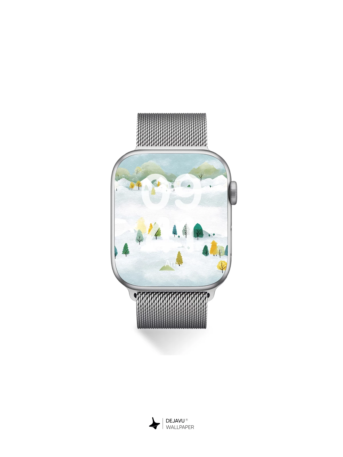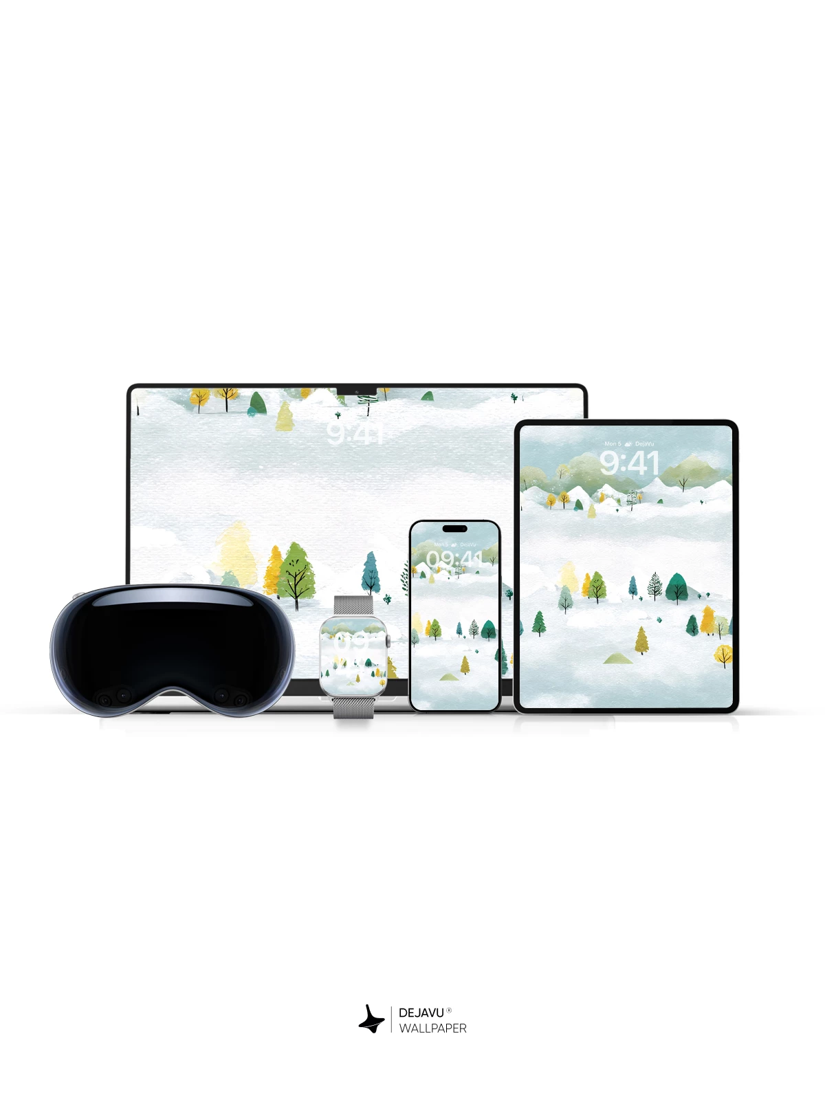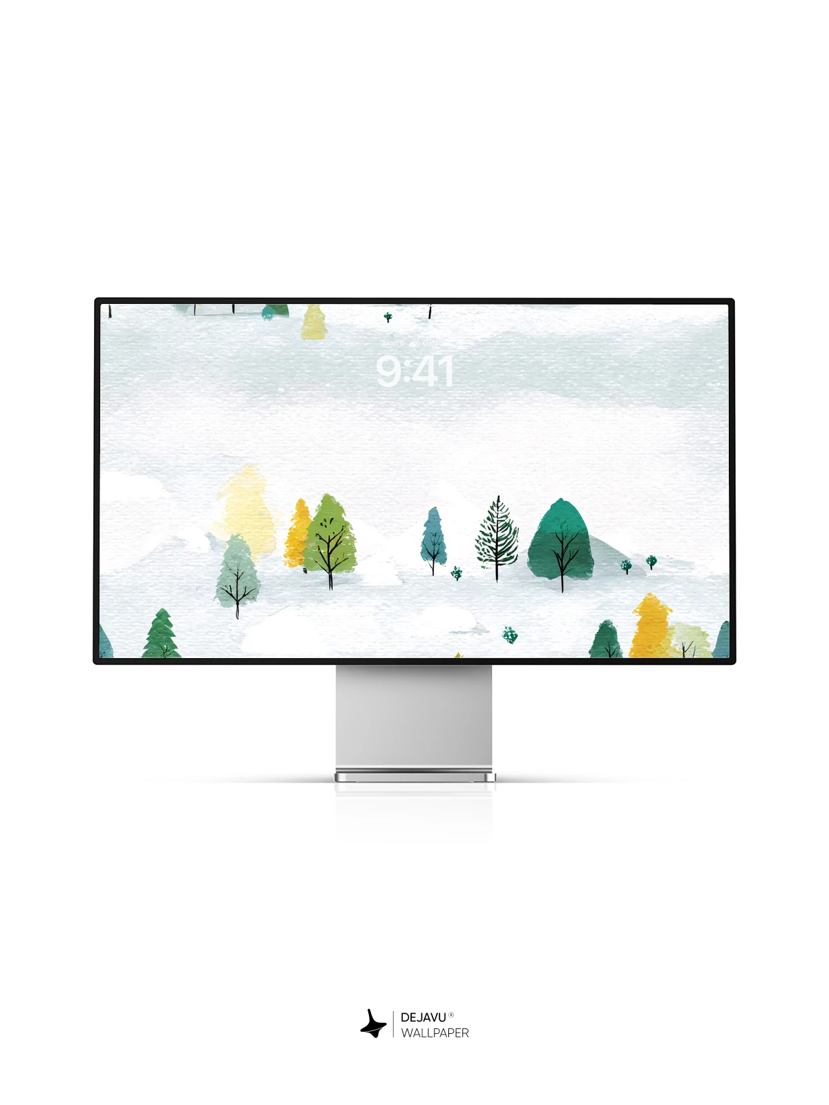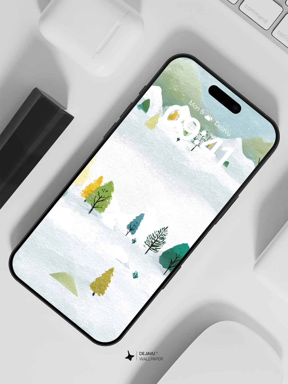 This tranquil winter landscape, inspired by modern watercolor illustration techniques, captures the quiet beauty of a snowy forest dotted with evergreens in hues of green, yellow, and blue. Soft gradients and gentle brushwork evoke a sense of peaceful solitude, making it ideal as an 8K wallpaper for iPhone, Android, or tablet devices. The minimalist yet vivid design blends nature and artistry, perfect for those who appreciate subtle elegance in their digital backgrounds.