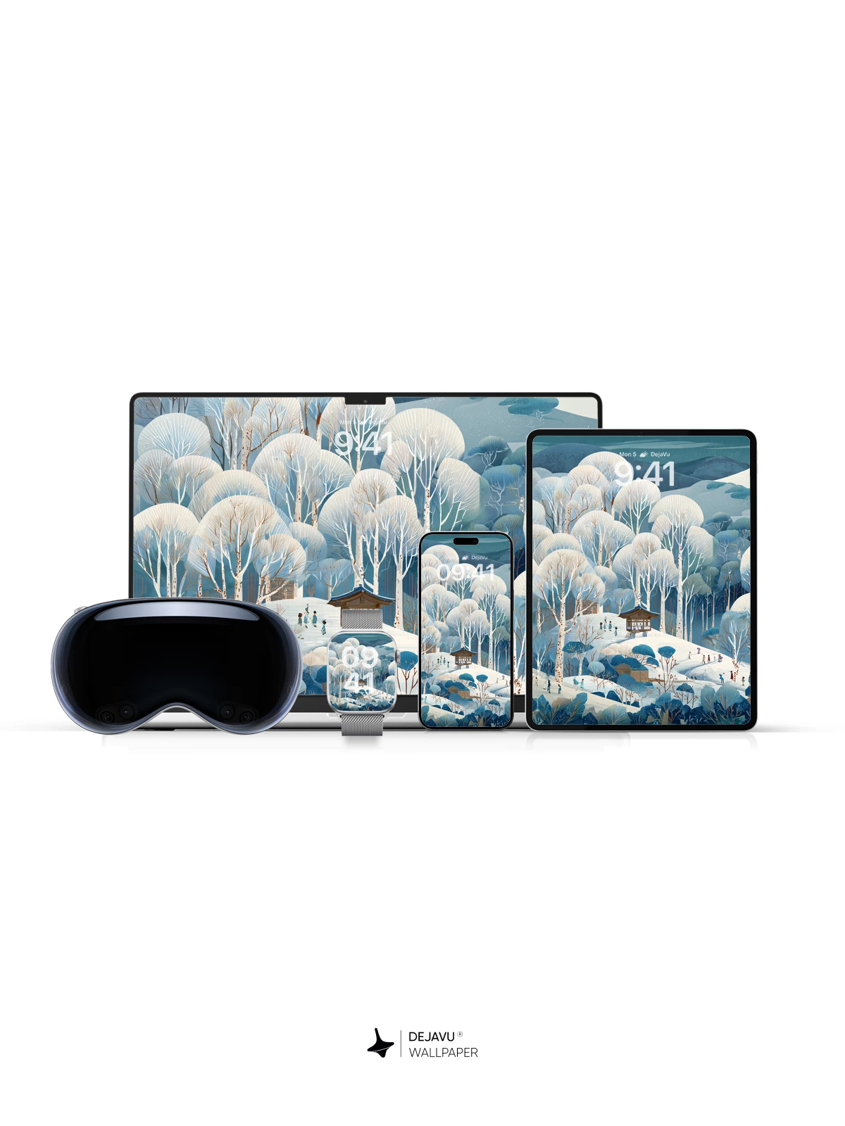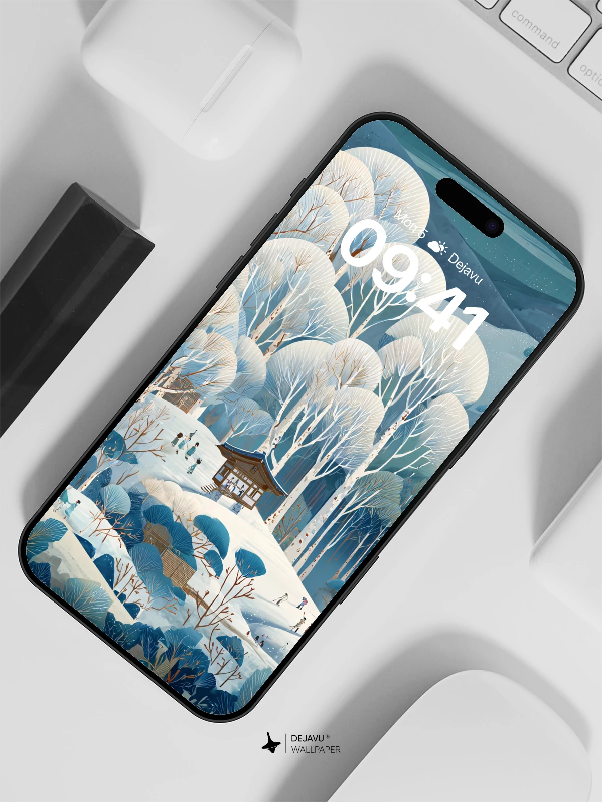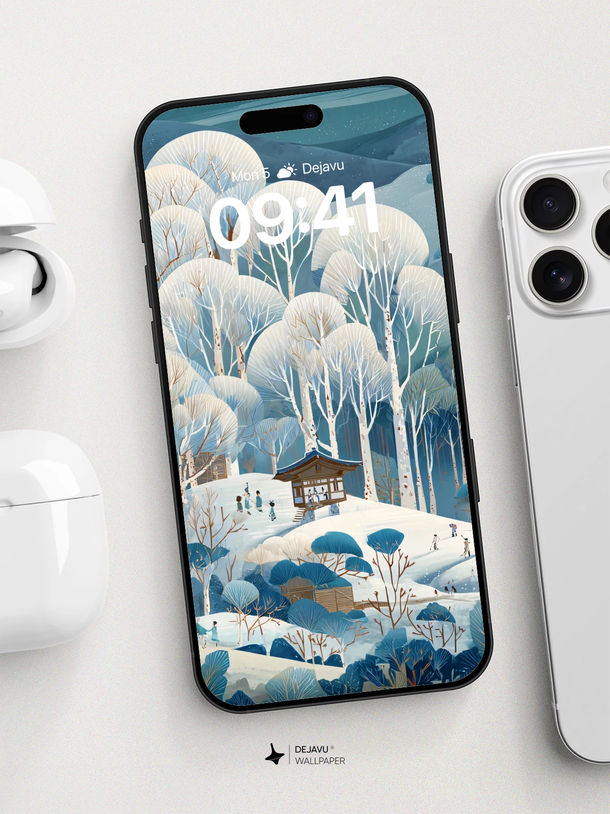 Inspired by the delicate harmony of Japanese woodblock art, this 8K wallpaper captures a tranquil winter forest where snow-laden trees form soft, cloud-like canopies around a solitary pavilion. Tiny travelers wind through the icy hills, evoking a sense of quiet adventure and timeless peace. The cool blue palette and meticulous detail make it ideal for iPhone, Android, and tablet screens, bringing a touch of poetic serenity to your mobile device.