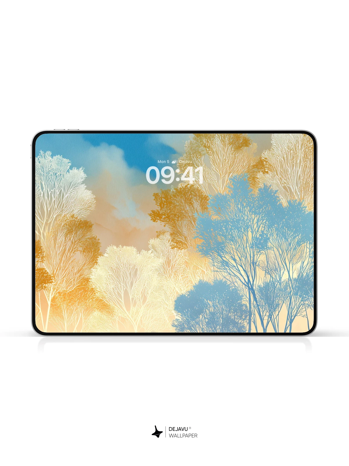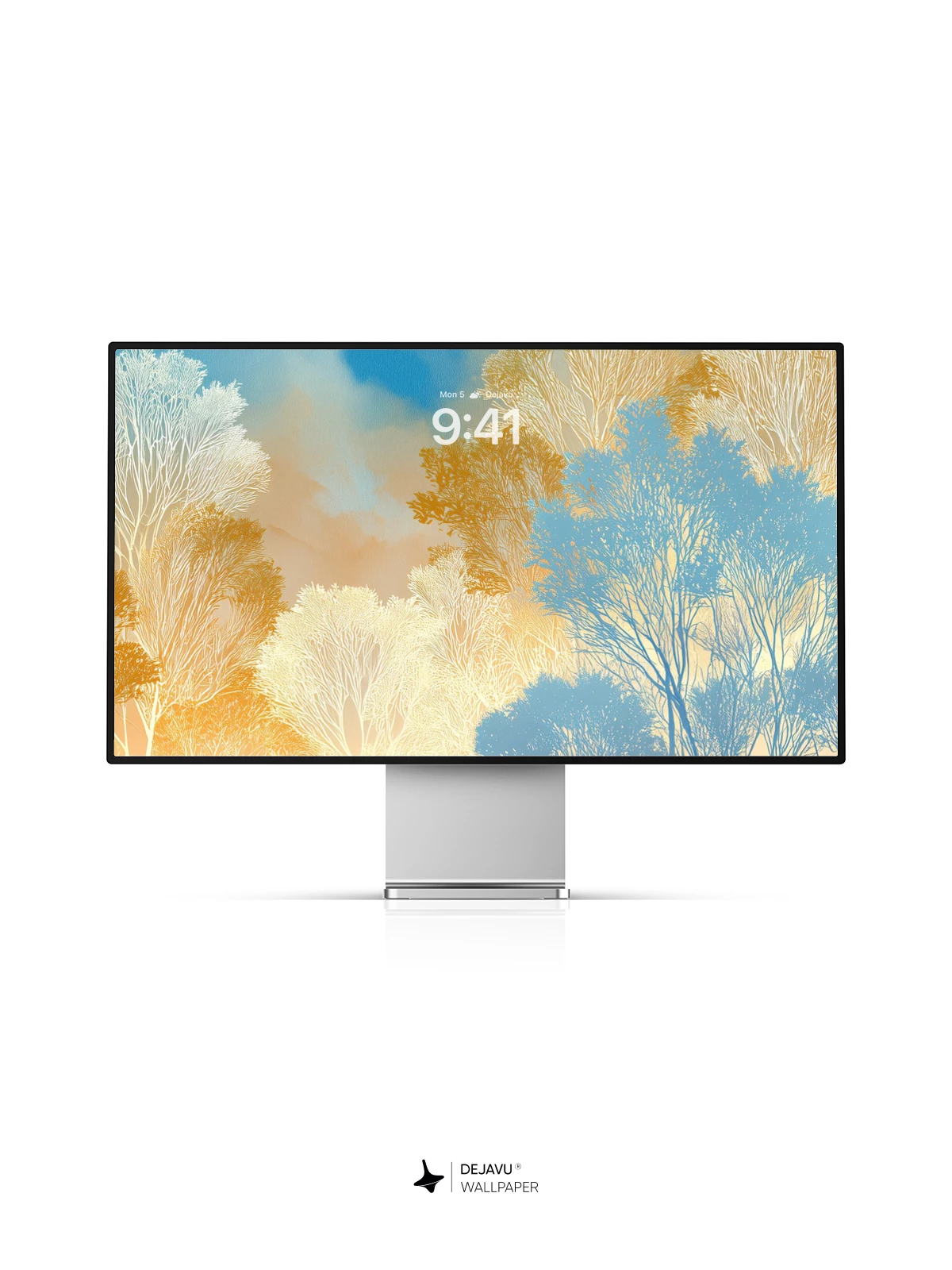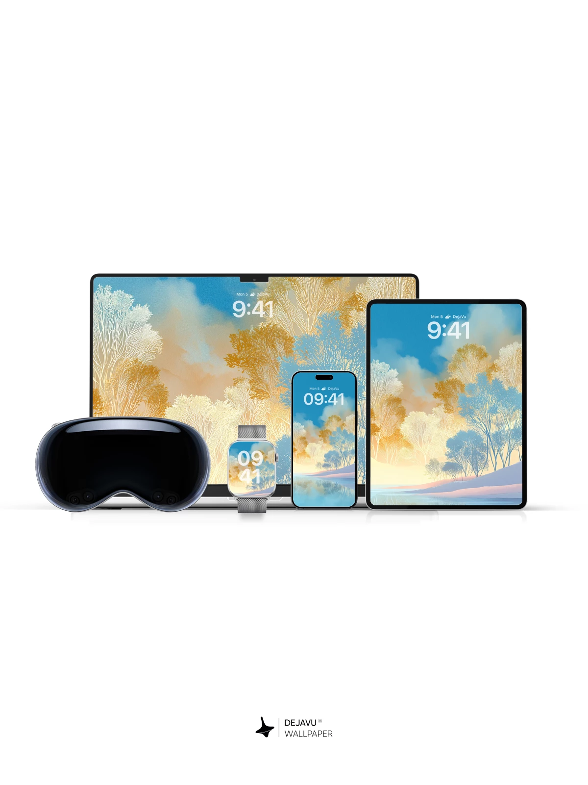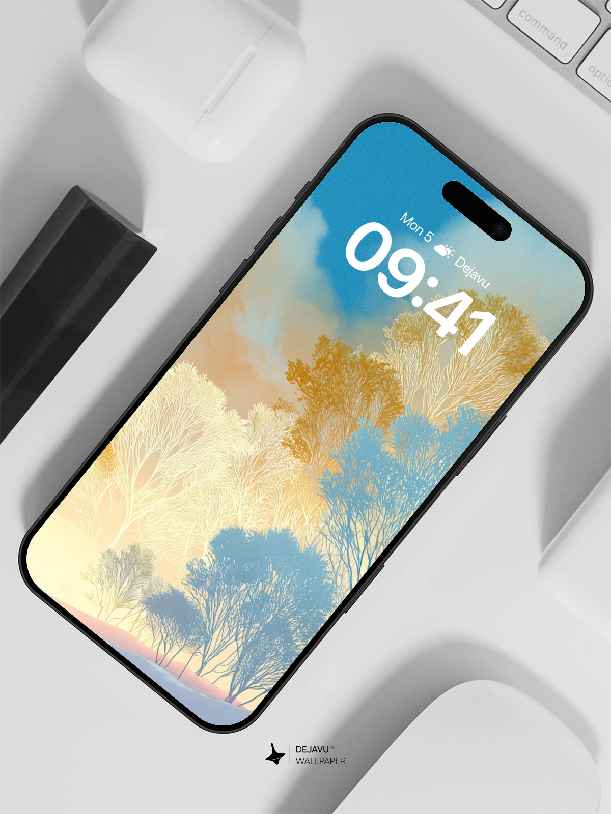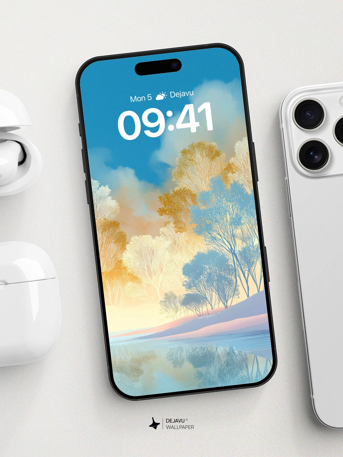 This tranquil winter scene captures the quiet beauty of frost-covered trees glowing in warm light, their reflections mirrored perfectly in a still lake beneath a vast, cloud-dappled sky. Inspired by the poetic minimalism of contemporary nature art, it evokes a sense of peace and timeless stillness. Ideal as an 8K wallpaper for iPhone, Android, or tablets, this image blends natural elegance with soothing color gradients, making it a perfect backdrop for daily inspiration.
