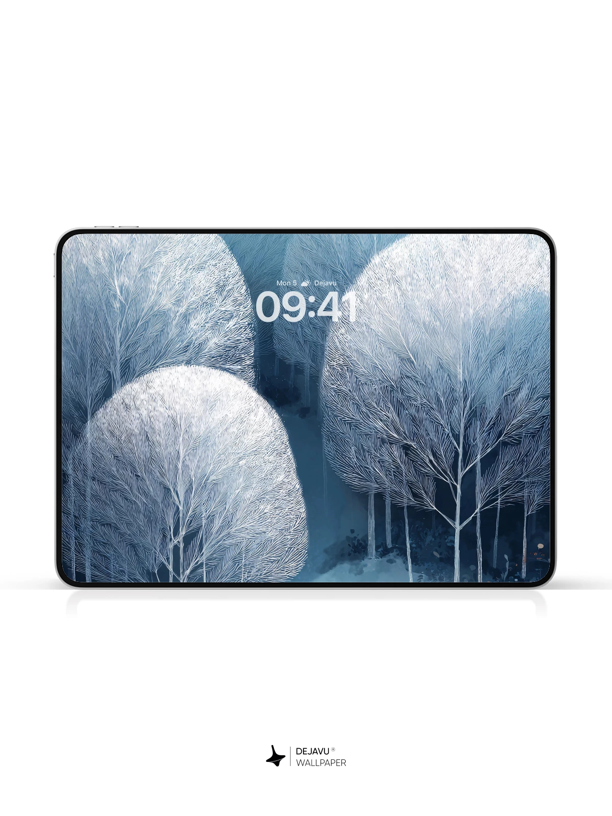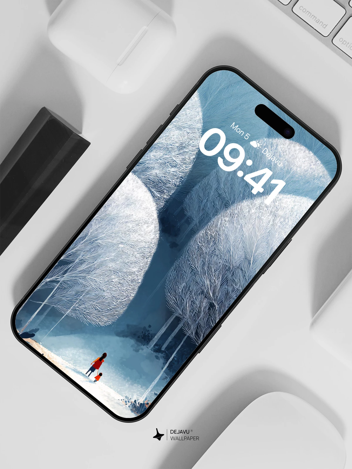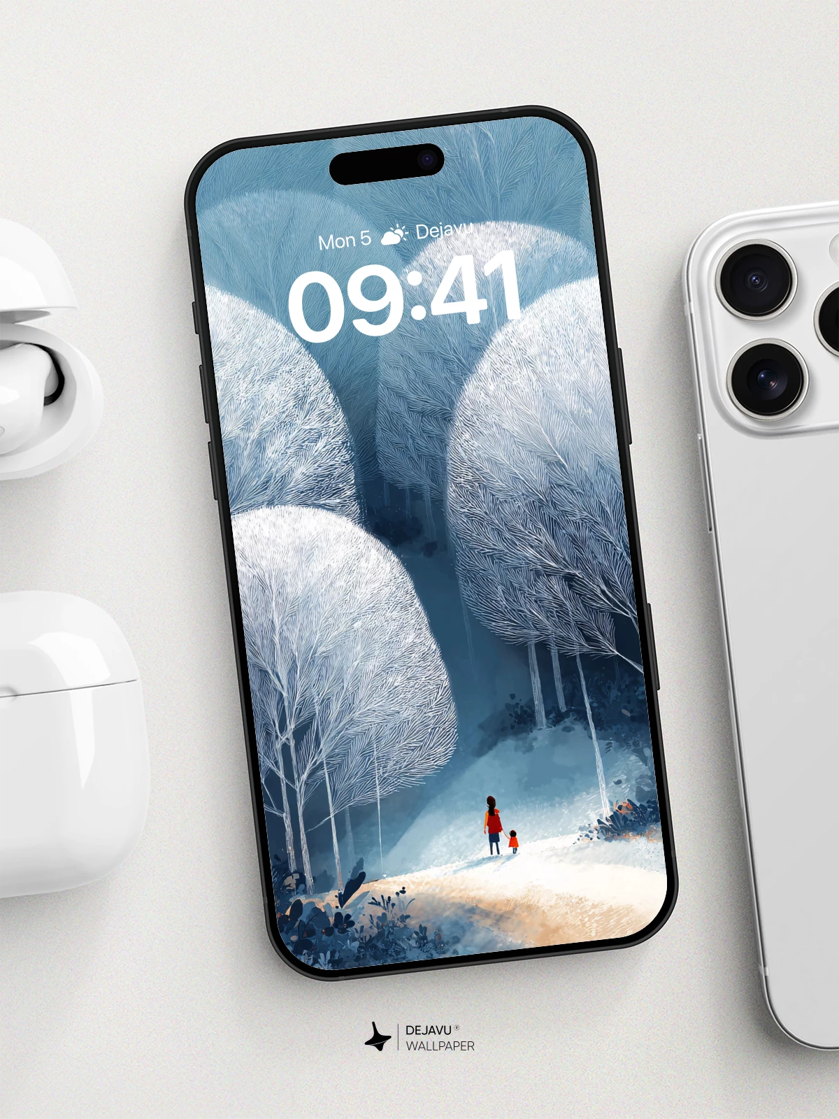 This evocative 8K wallpaper captures a quiet moment of connection between a parent and child walking through an ethereal winter forest. The trees, shaped like glowing orbs of frost, rise in perfect symmetry, creating a surreal, almost otherworldly landscape bathed in cool blue light. Inspired by the poetic minimalism of contemporary nature art, the image conveys solitude, warmth, and timeless beauty—ideal for iPhone, Android, or tablet screens seeking a calming yet visually rich backdrop.