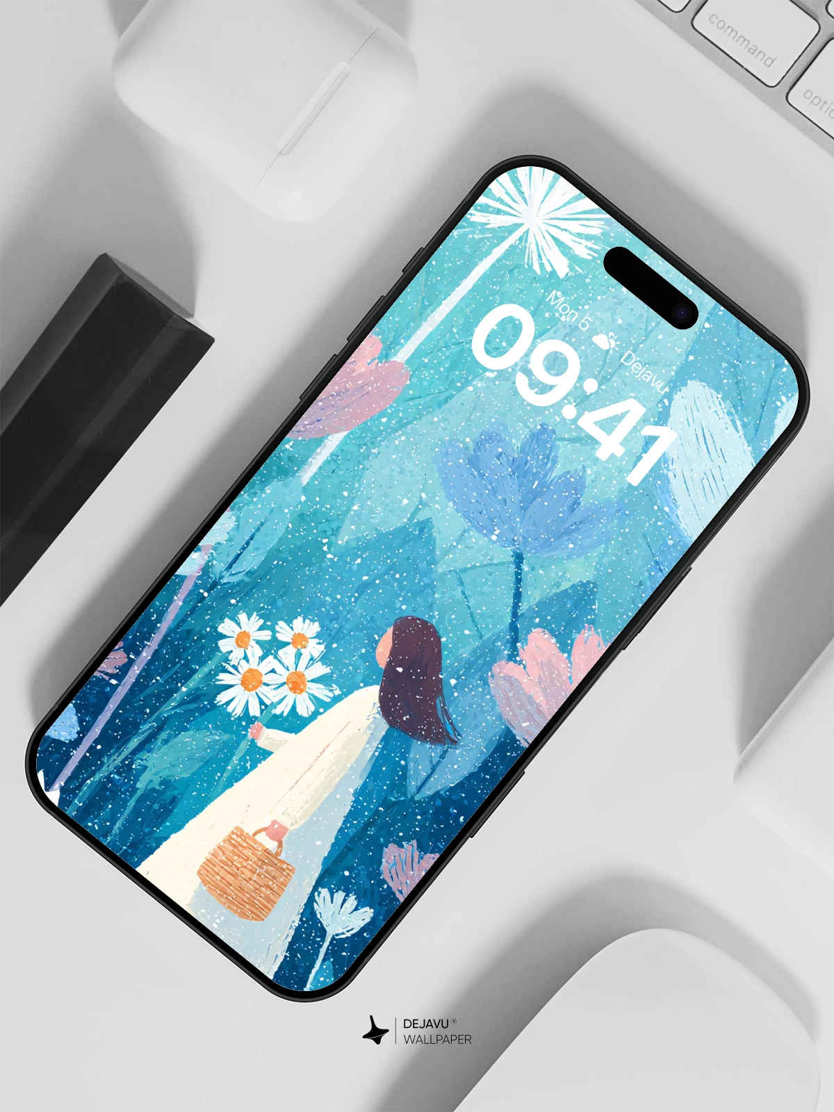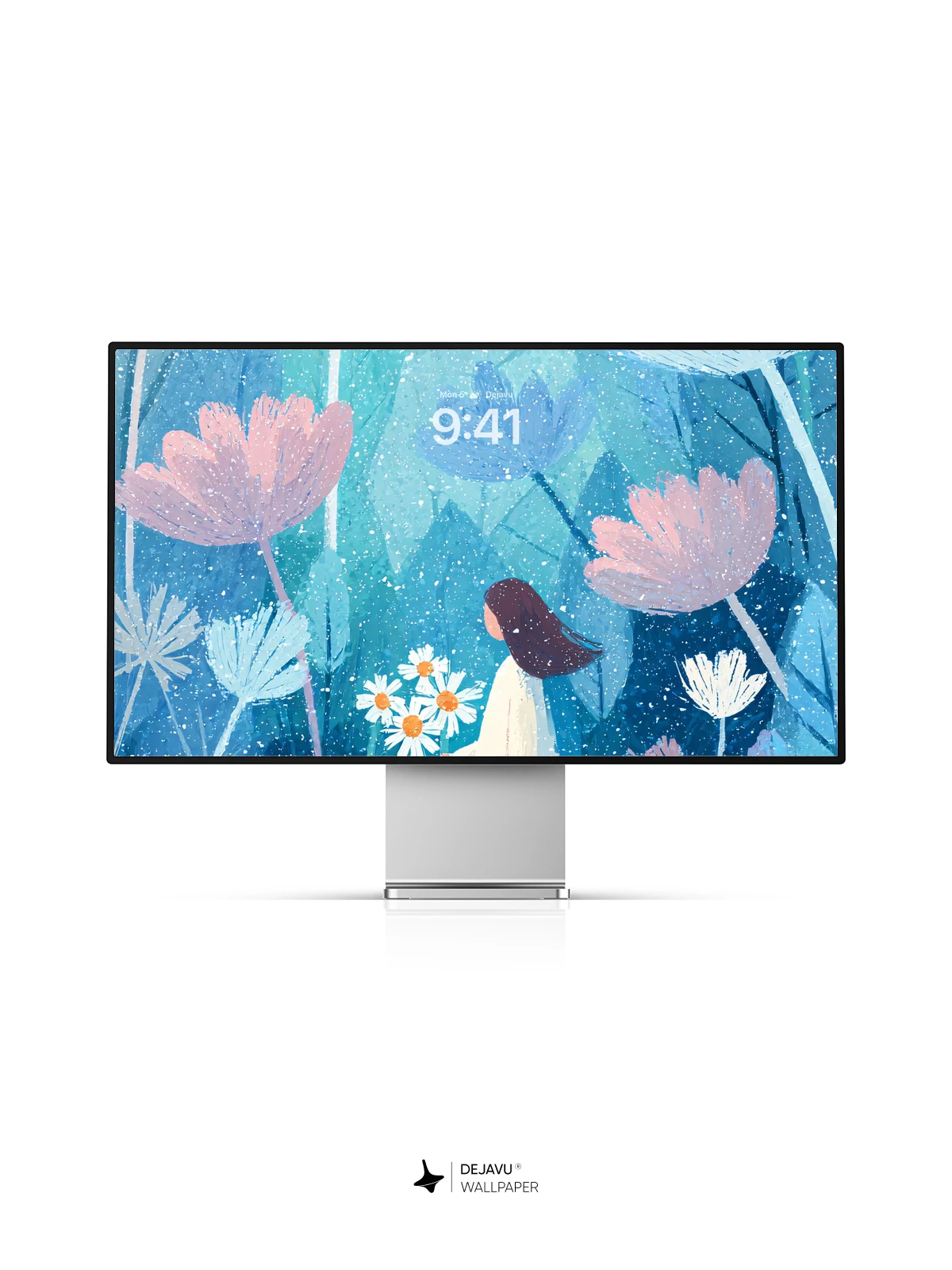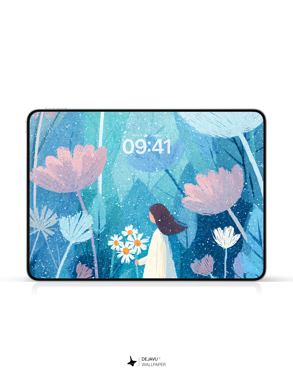 Inspired by the delicate beauty of nature and whimsical storytelling, this 8K wallpaper captures a serene winter wonderland where oversized flowers bloom in frosty hues and a quiet girl strolls through the snow with a basket and blooms. The ethereal atmosphere evokes a sense of peaceful solitude and timeless magic, perfect for iPhone, Android, or tablet screens. With its soft color palette and gentle snowfall, this artwork transforms any device into a portal to a tranquil, dreamlike garden.