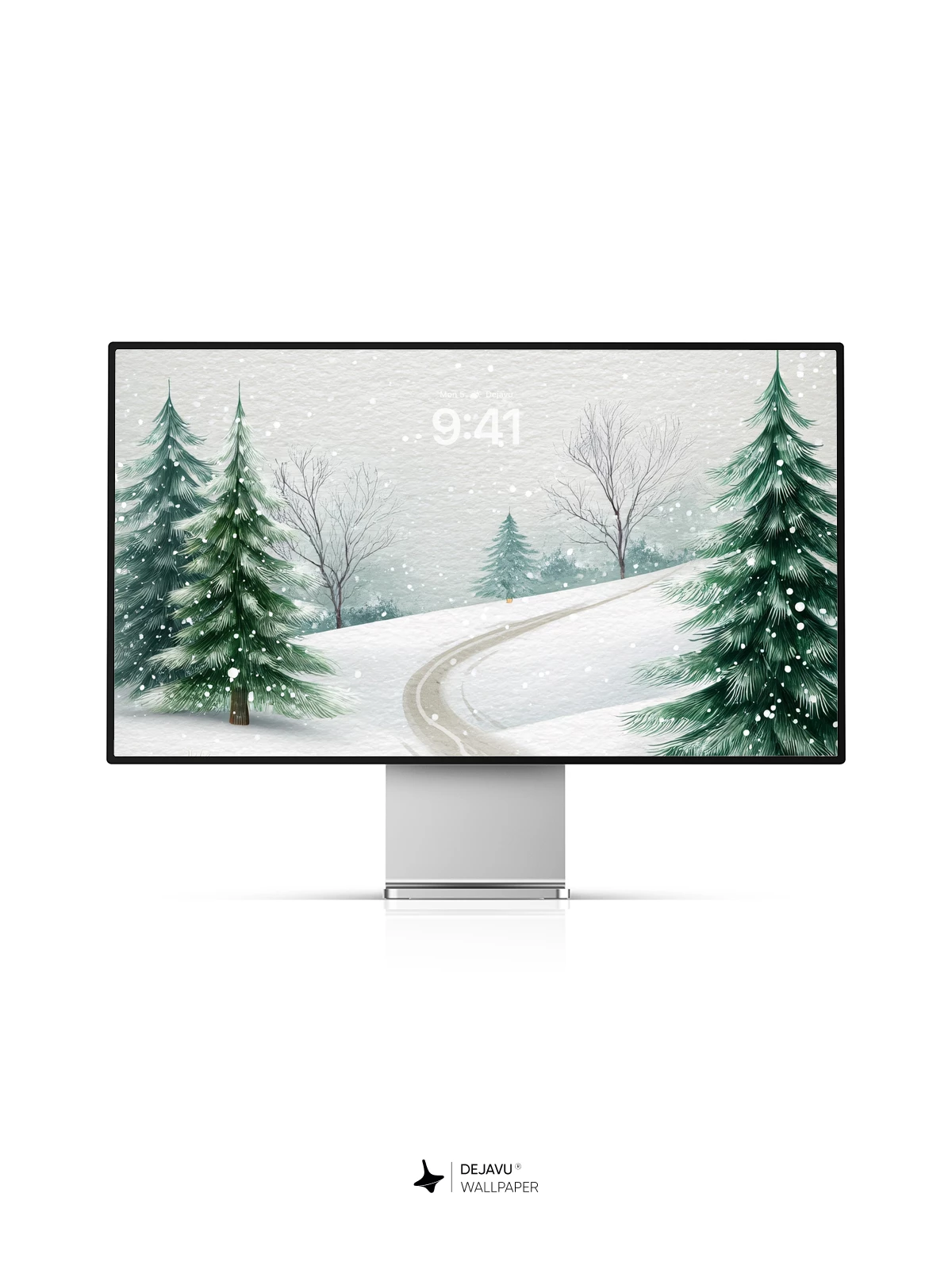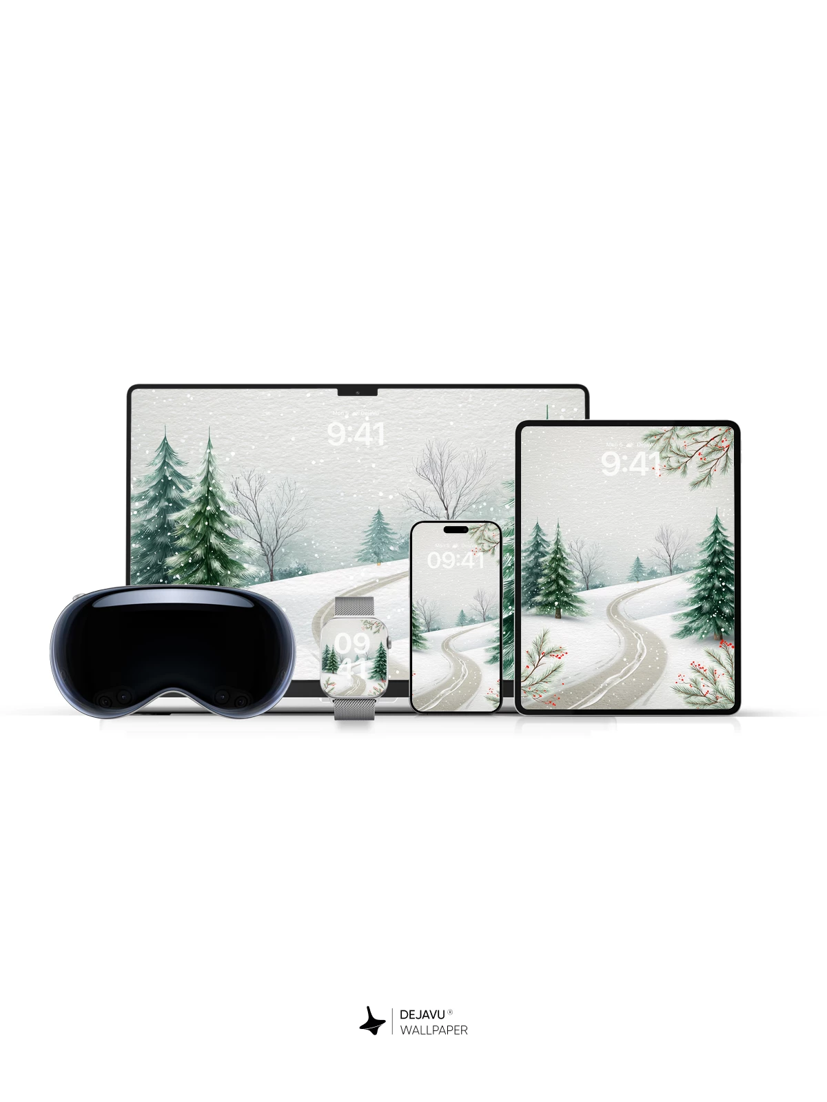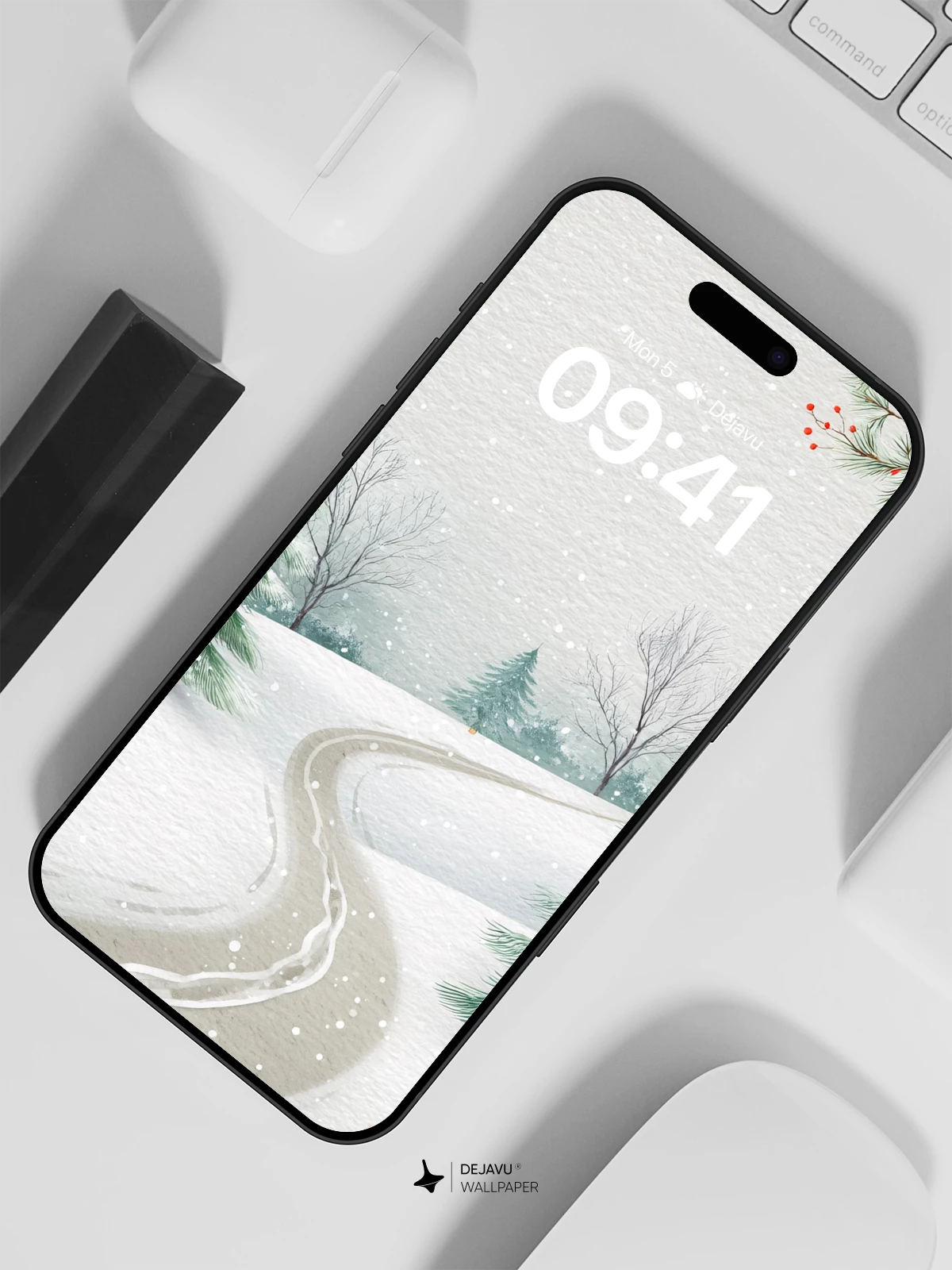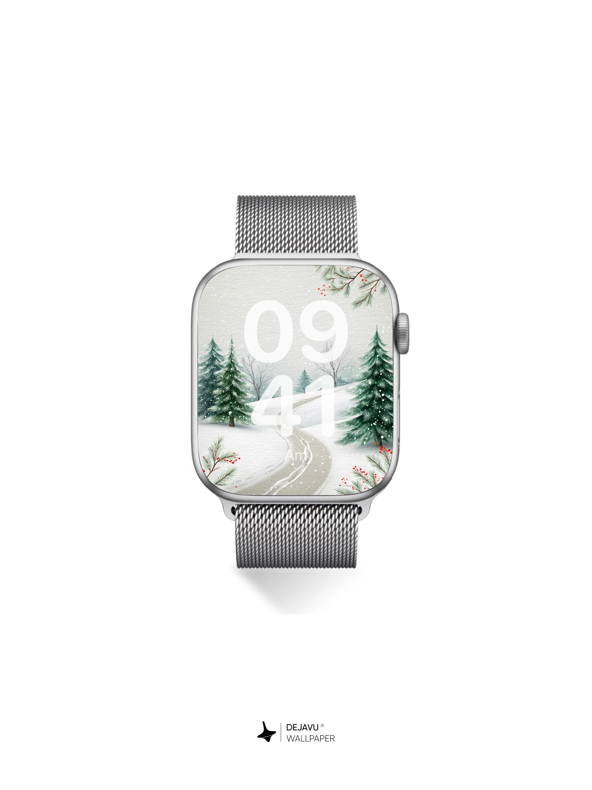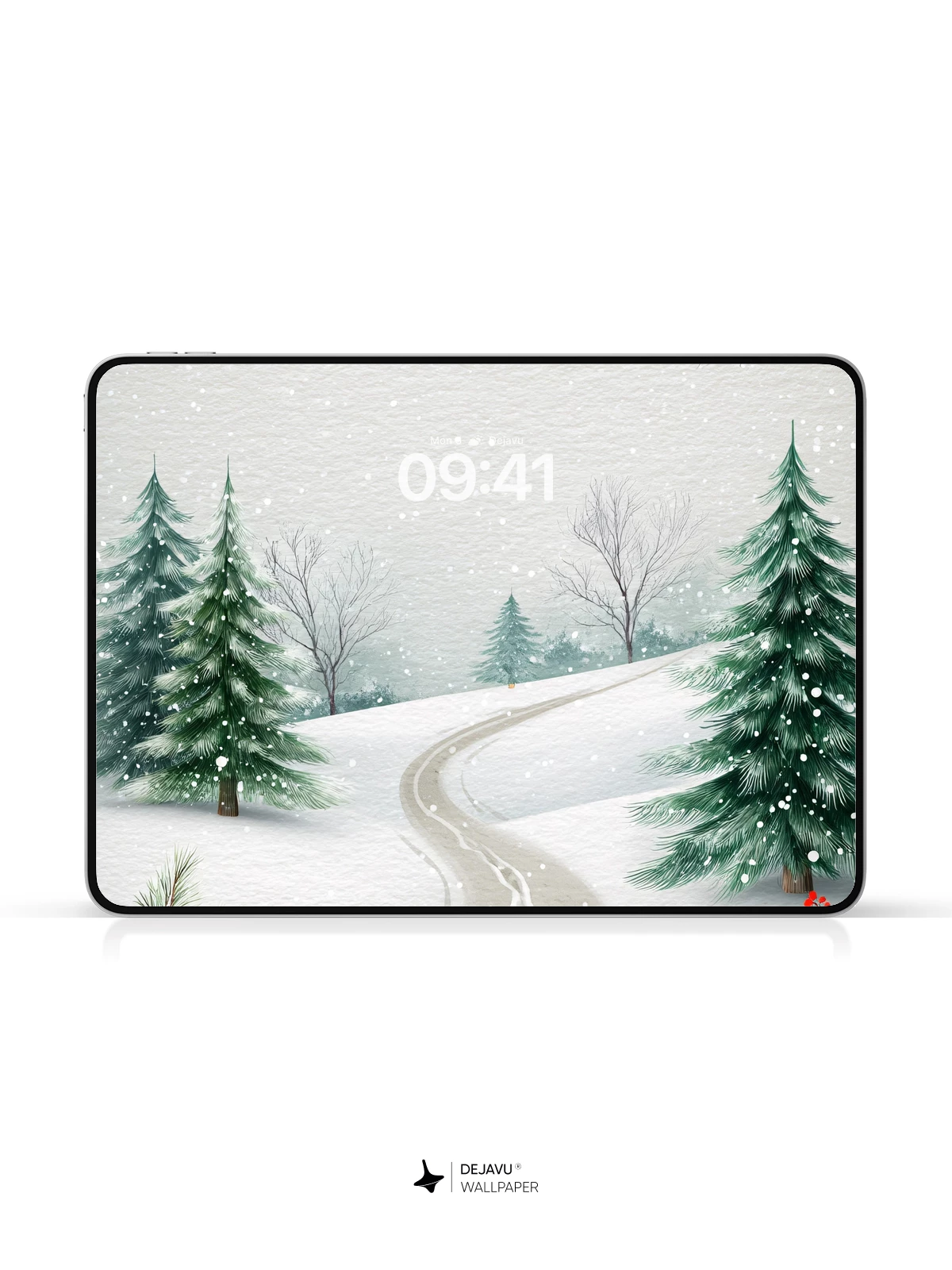 This enchanting winter scene captures the quiet beauty of a snow-laden forest, where a winding trail invites peaceful exploration. Evergreen trees stand tall under a gentle snowfall, framed by delicate branches adorned with red berries. The soft, painterly style evokes a sense of calm and timeless nature, making it an ideal 8K wallpaper for iPhone, Android, or tablets. Immerse your device in the stillness of a frosty morning.