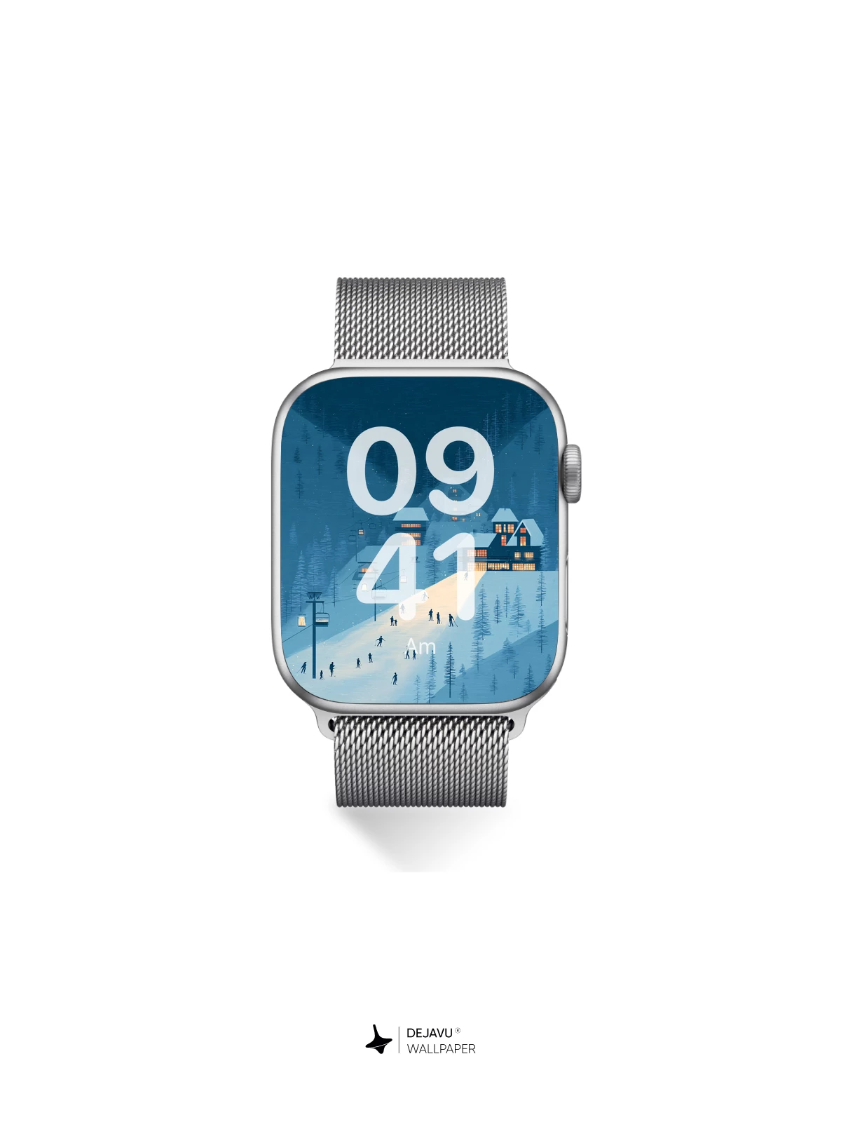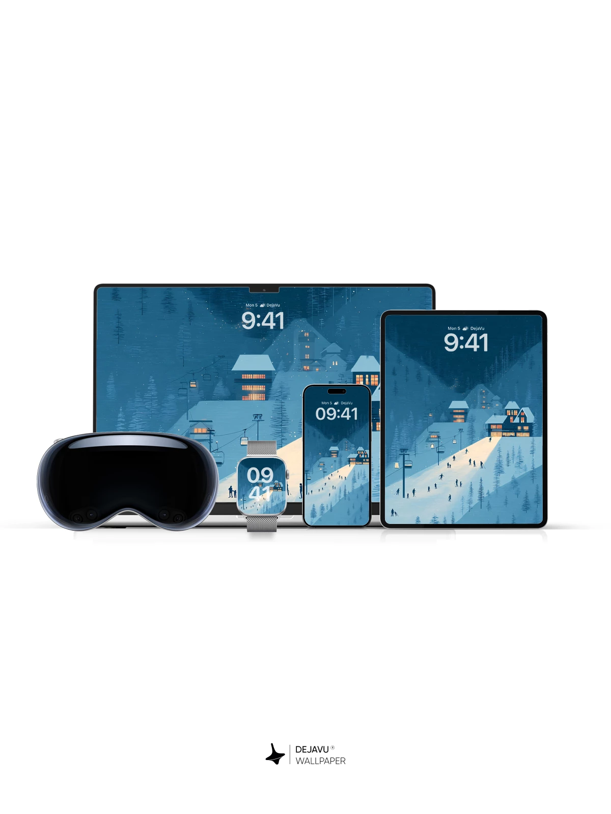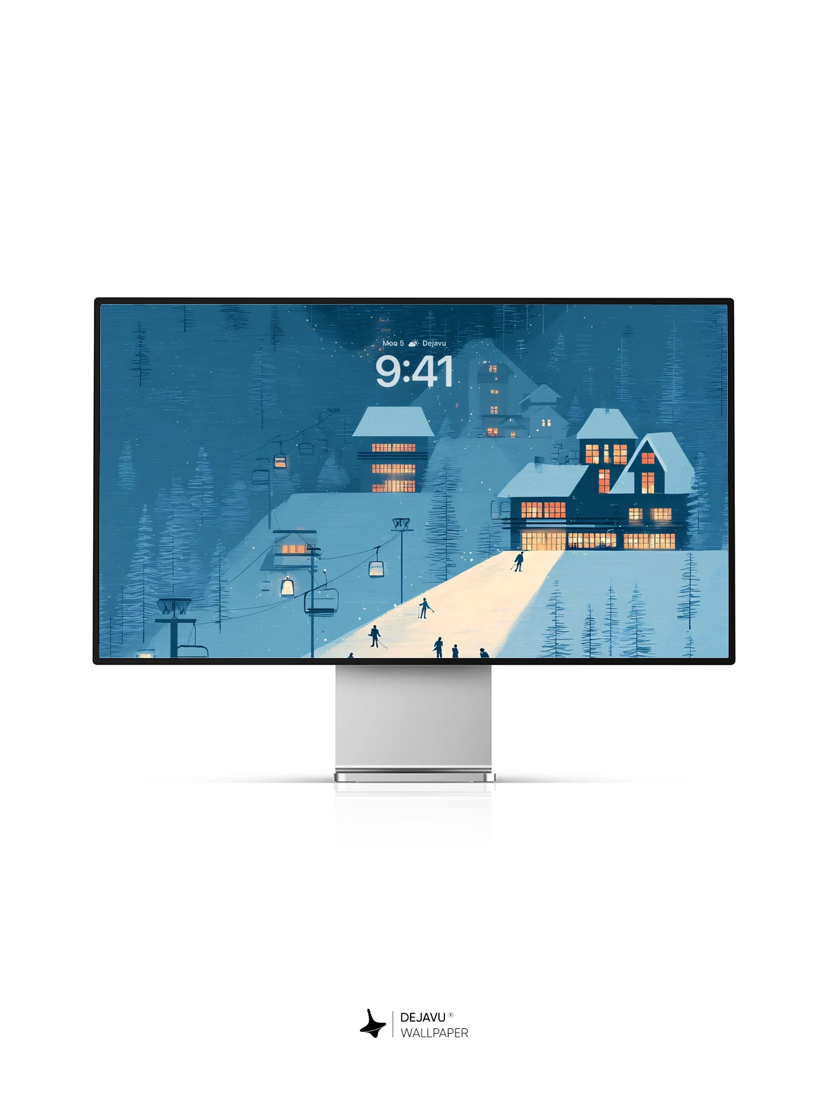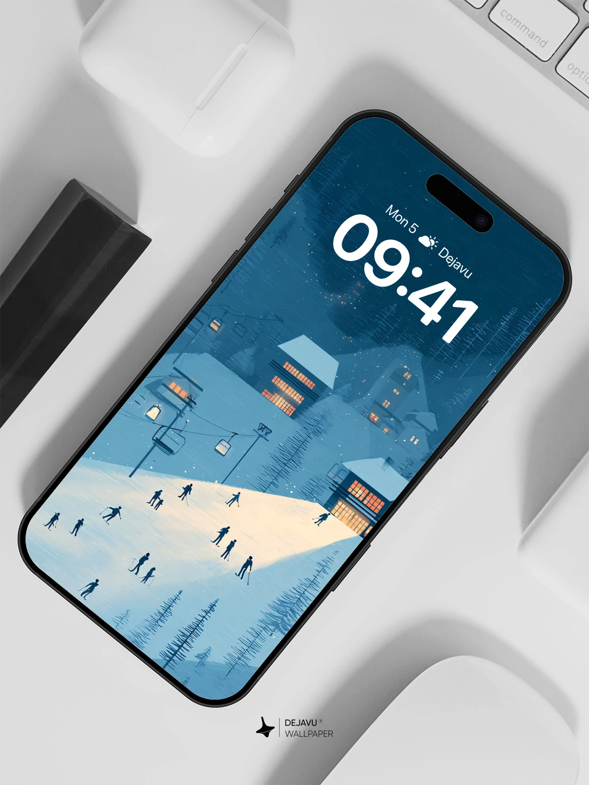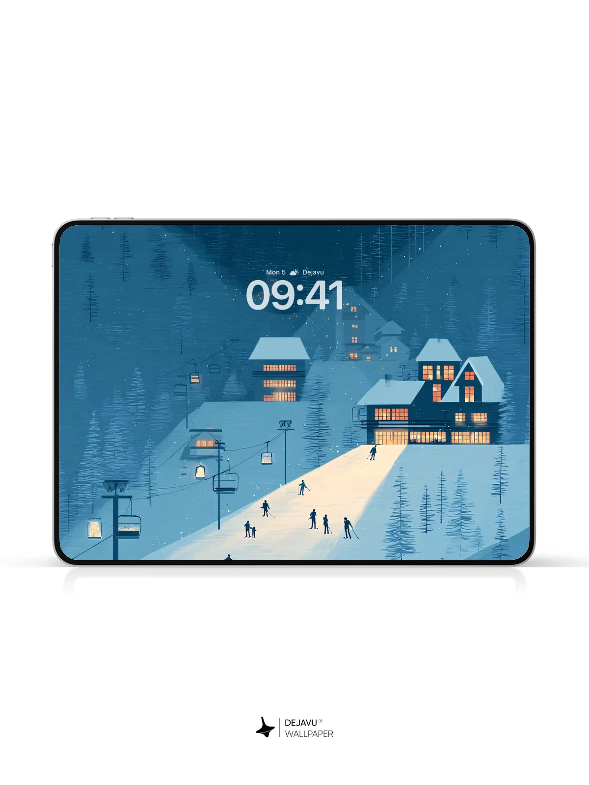This tranquil winter scene captures a cozy alpine village nestled in snow-covered mountains, where skiers descend lit slopes beneath a deep blue night sky. Warm light spills from chalet windows, contrasting the cool blues of the landscape, evoking a sense of peaceful solitude and timeless beauty. Ideal as an 8K wallpaper for iPhone, Android, or tablets, this artwork blends minimalist design with atmospheric depth, offering a calming digital escape into nature’s quiet magic.