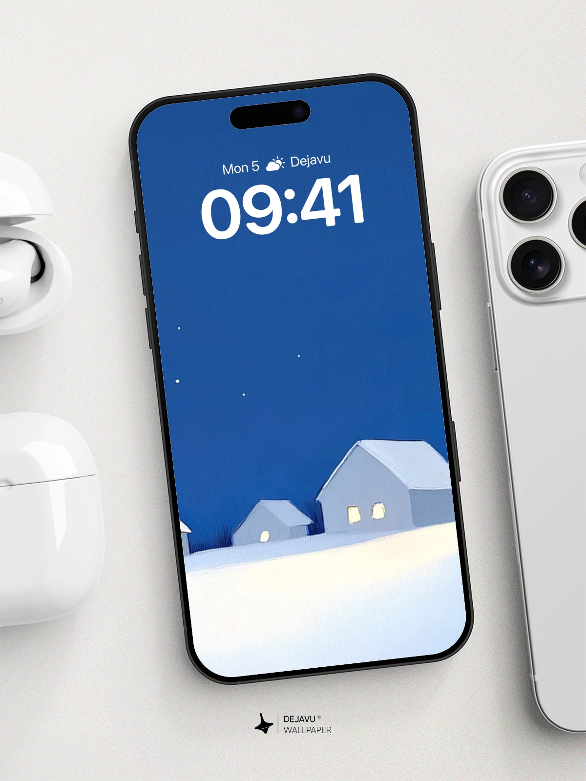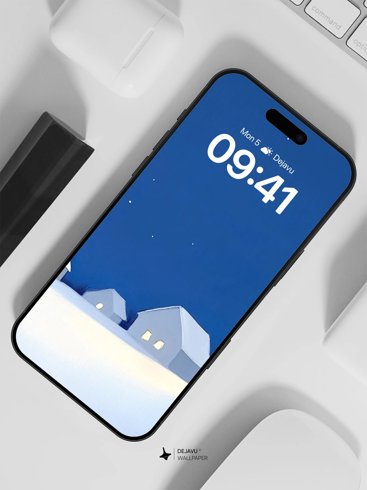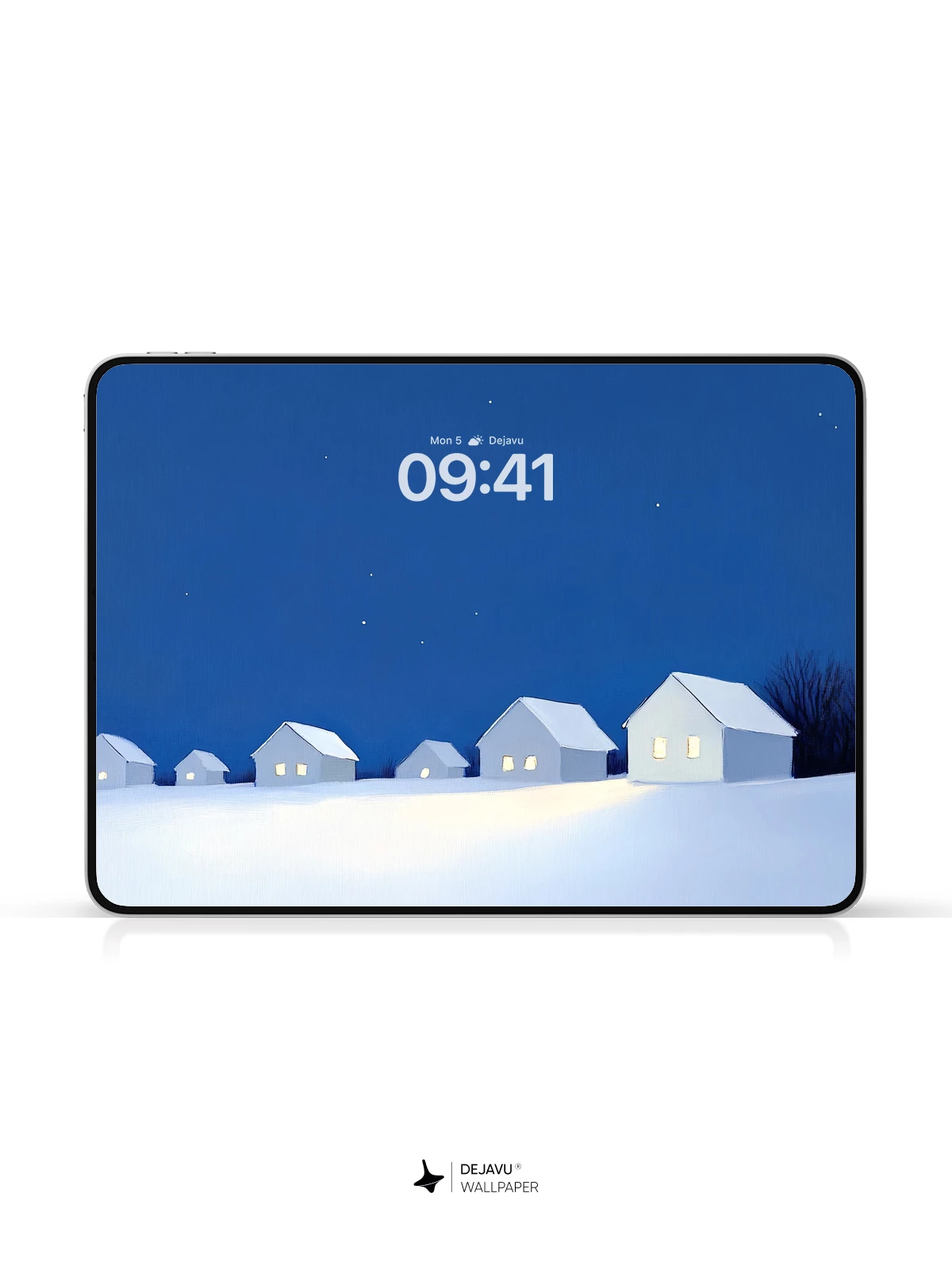This enchanting winter landscape captures a quiet village nestled in deep snow under a clear night sky, where soft golden lights from windows pierce the cool blue dusk. The minimalist design evokes a sense of calm and solitude, making it an ideal 8K wallpaper for iPhone, Android, and tablets. With its gentle glow and dreamlike stillness, it transforms any device into a portal to peaceful winter nights.