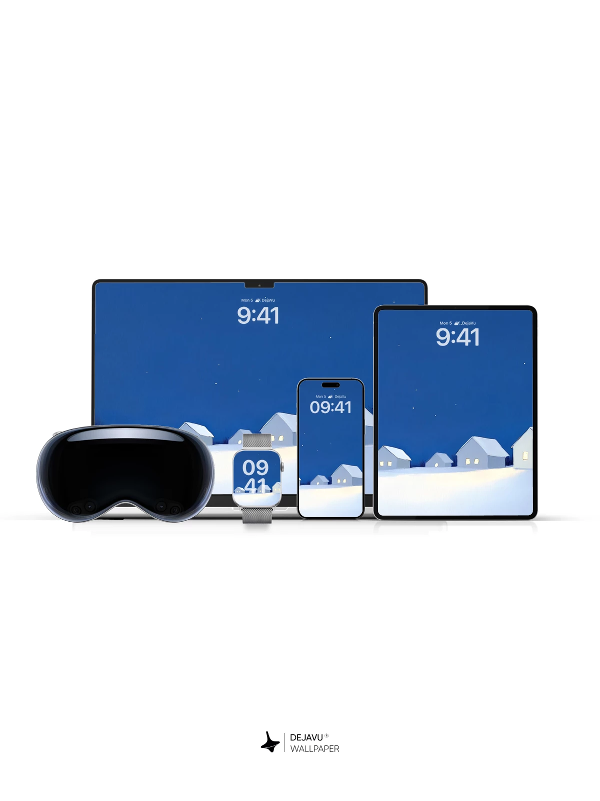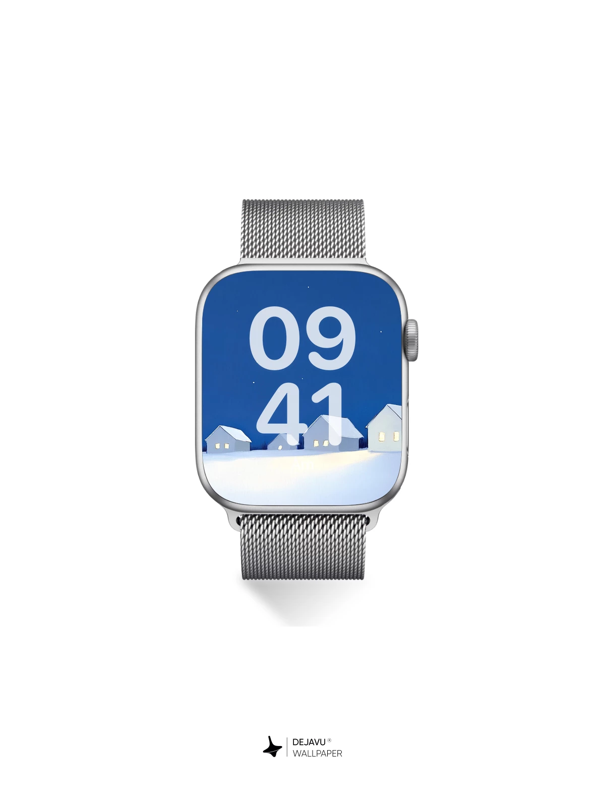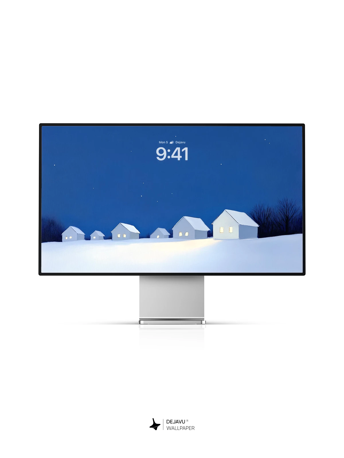 This enchanting winter landscape captures a quiet village nestled in deep snow under a clear night sky, where soft golden lights from windows pierce the cool blue dusk. The minimalist design evokes a sense of calm and solitude, making it an ideal 8K wallpaper for iPhone, Android, and tablets. With its gentle glow and dreamlike stillness, it transforms any device into a portal to peaceful winter nights.