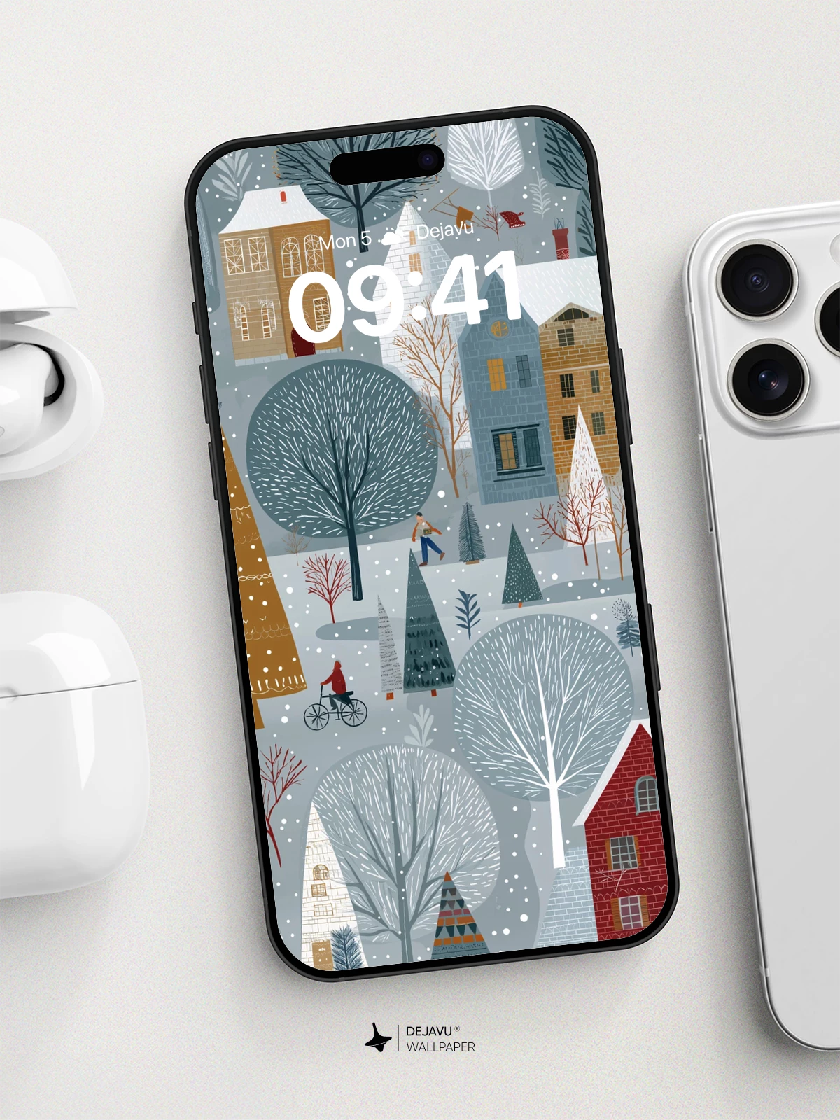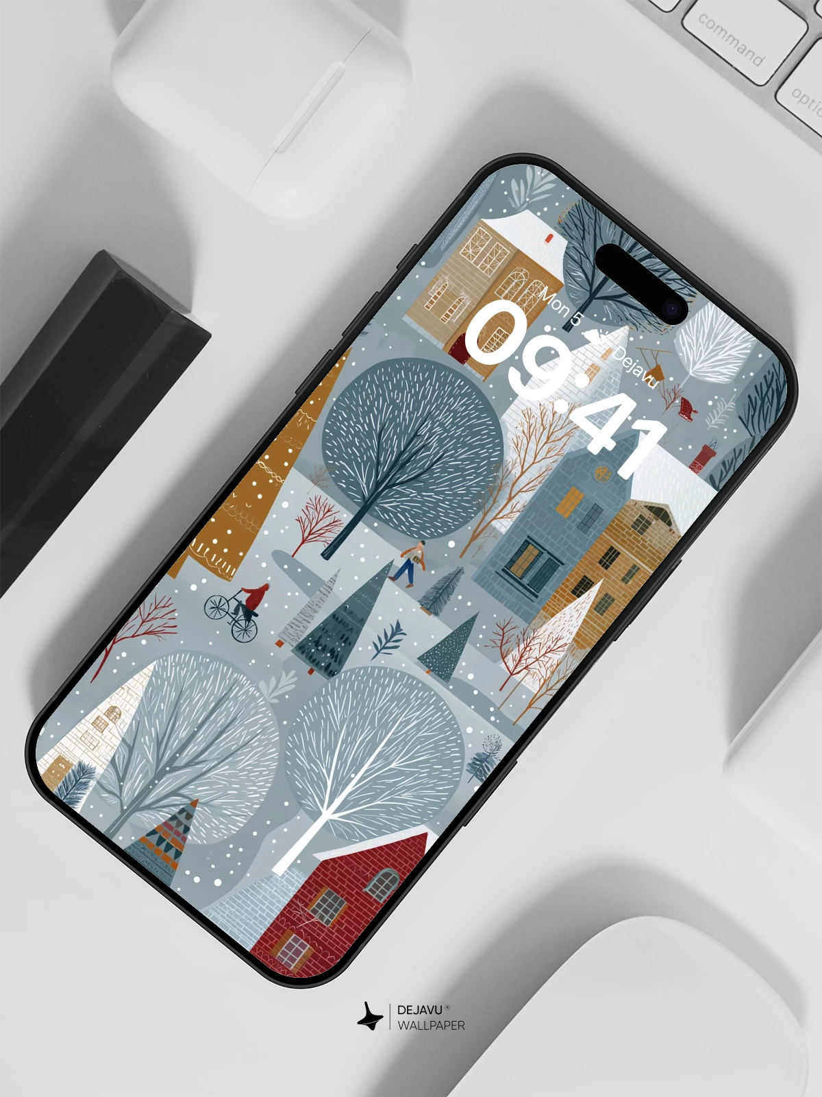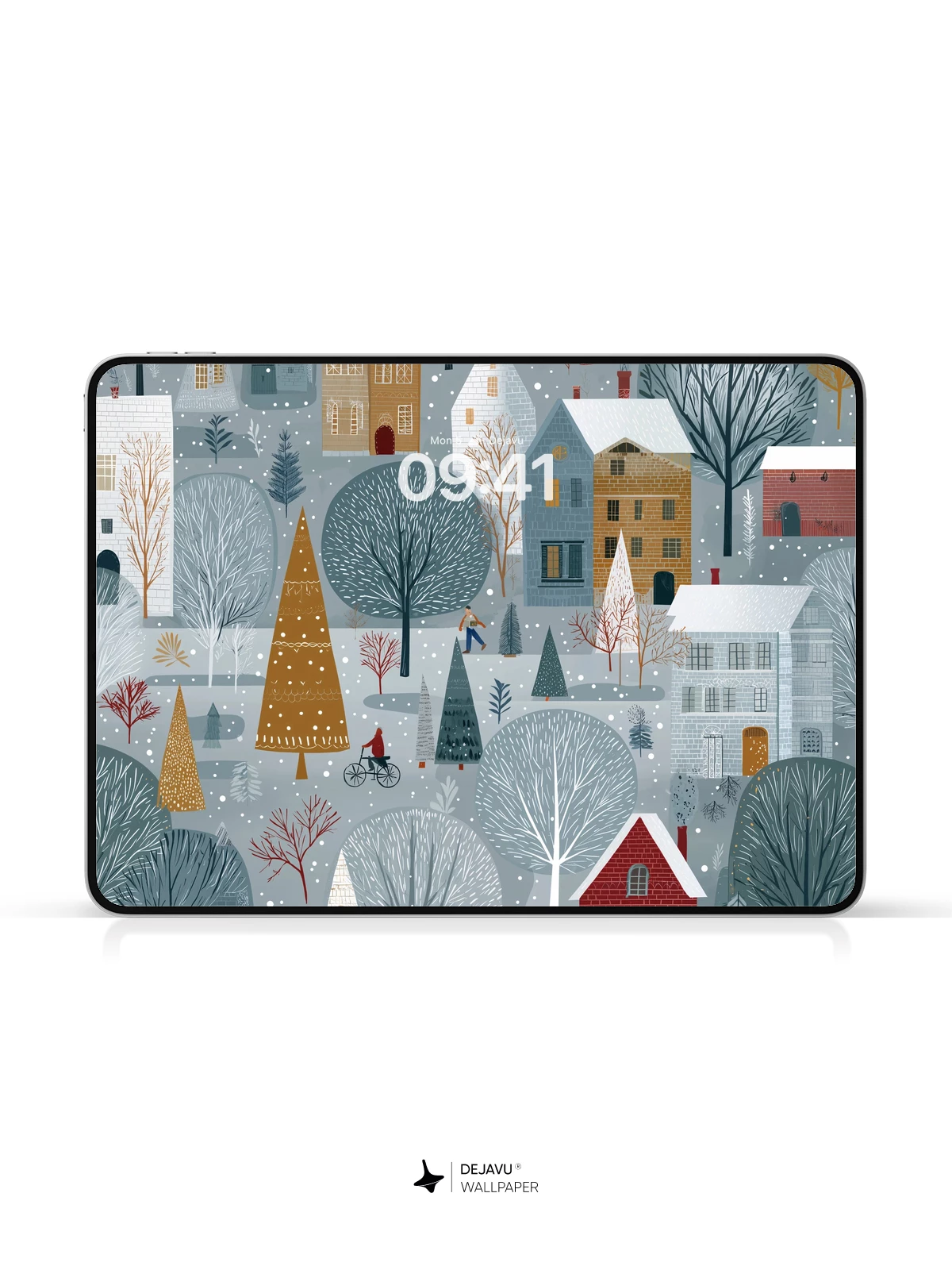 This enchanting 8K wallpaper captures a serene winter village, where snow gently falls over colorful houses, bare trees, and festive evergreens. Inspired by folk art illustration styles, the scene evokes warmth and nostalgia, ideal for iPhone, Android, or tablet screens. A cyclist glides through the quiet streets, adding life to the peaceful landscape. With its rich textures and balanced composition, this wallpaper brings seasonal charm to any device.