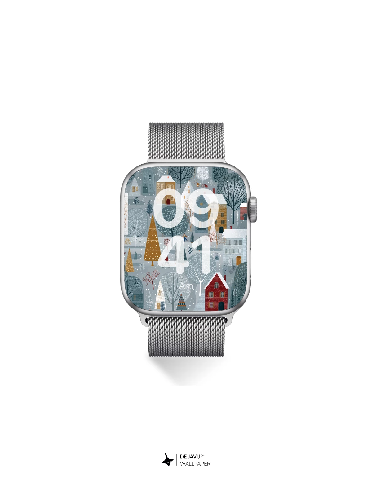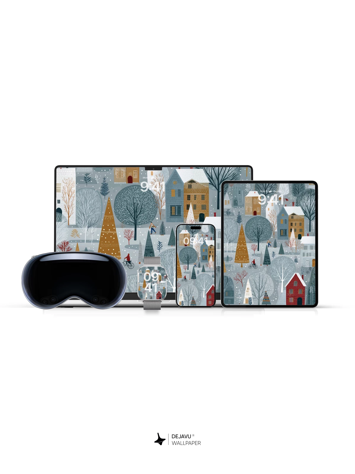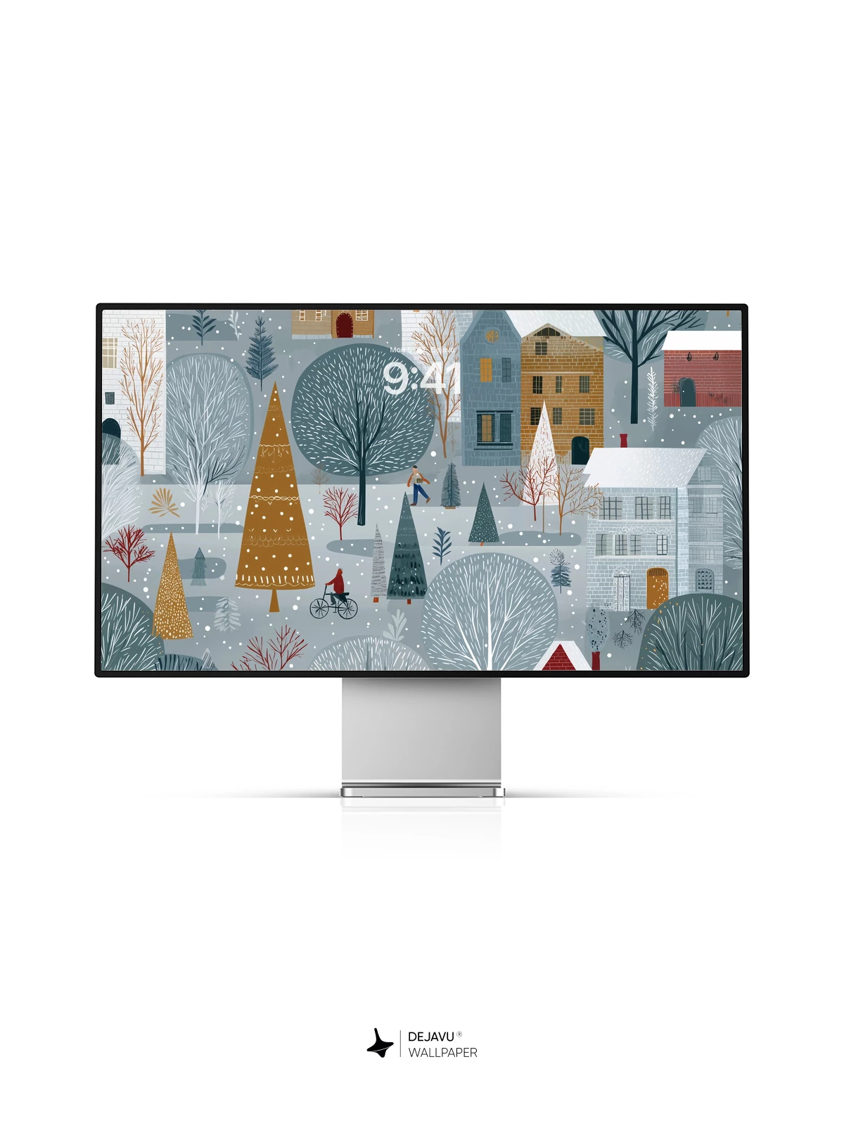 This enchanting 8K wallpaper captures a serene winter village, where snow gently falls over colorful houses, bare trees, and festive evergreens. Inspired by folk art illustration styles, the scene evokes warmth and nostalgia, ideal for iPhone, Android, or tablet screens. A cyclist glides through the quiet streets, adding life to the peaceful landscape. With its rich textures and balanced composition, this wallpaper brings seasonal charm to any device.