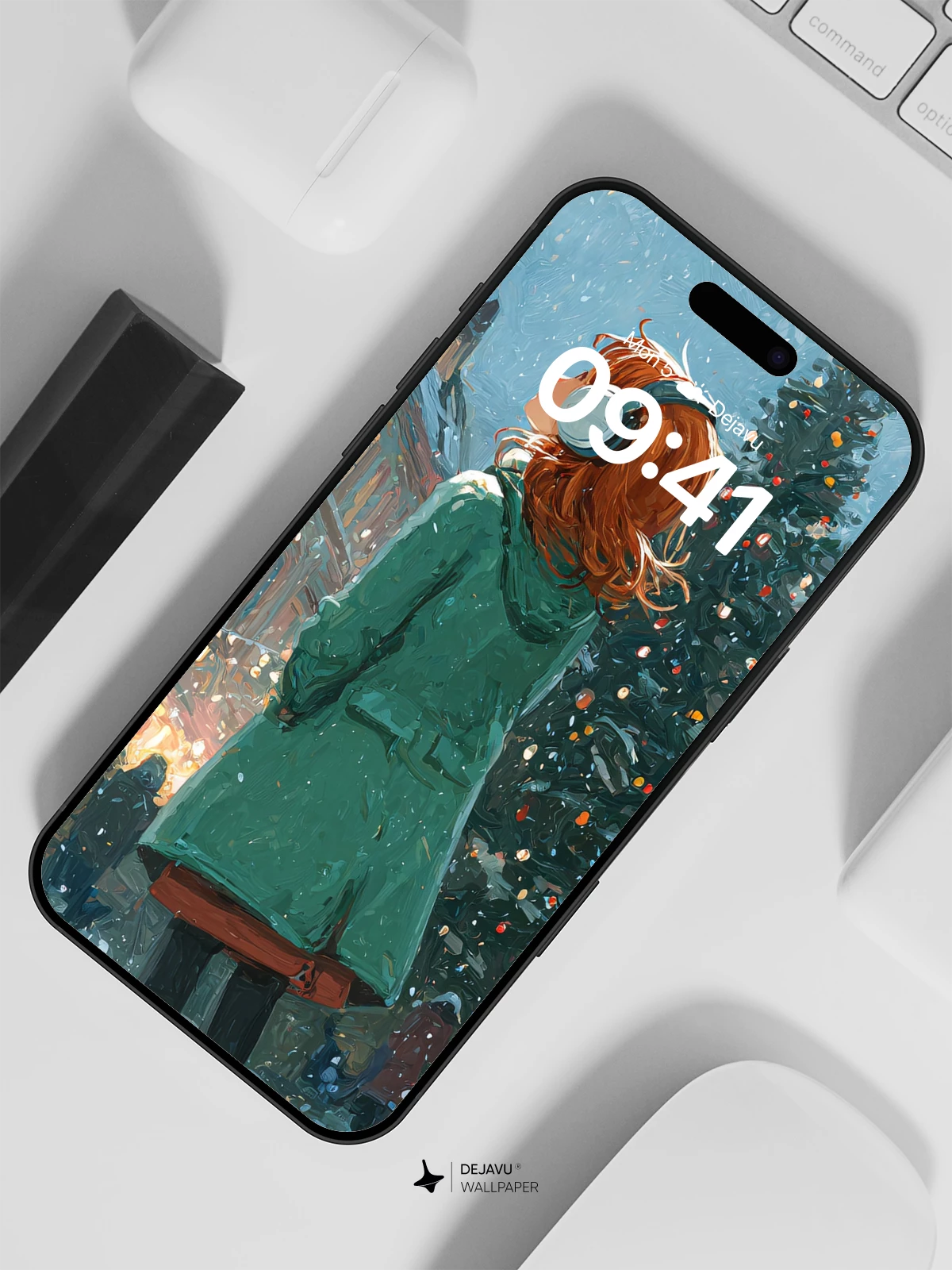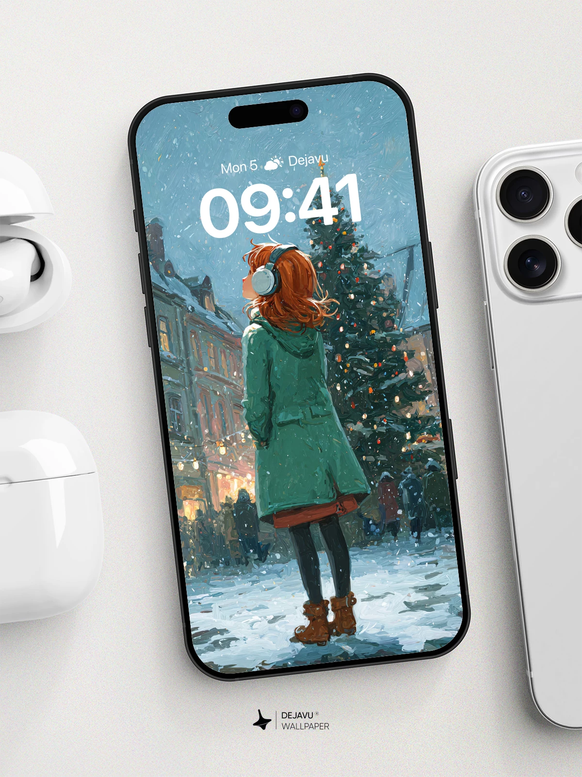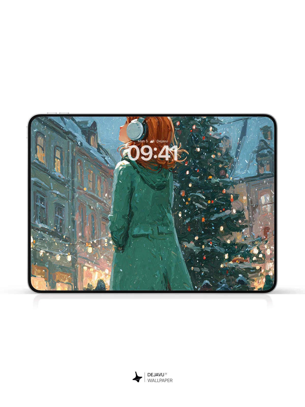 This enchanting 8K wallpaper features a young woman standing in a snowy town square, wrapped in a cozy green coat and headphones, gazing at a radiant Christmas tree. The scene evokes a sense of quiet wonder and holiday magic, with soft snowflakes drifting down and warm lights flickering from nearby buildings. Inspired by painterly realism, the artwork blends emotional depth with rich textures, making it ideal for iPhone, Android, or tablet backgrounds. Immerse yourself in this serene winter moment every time you unlock your device.
