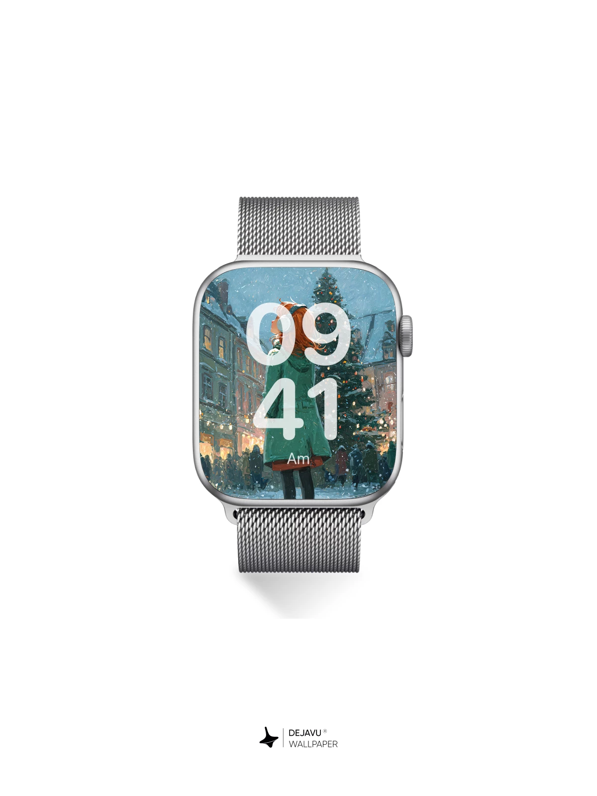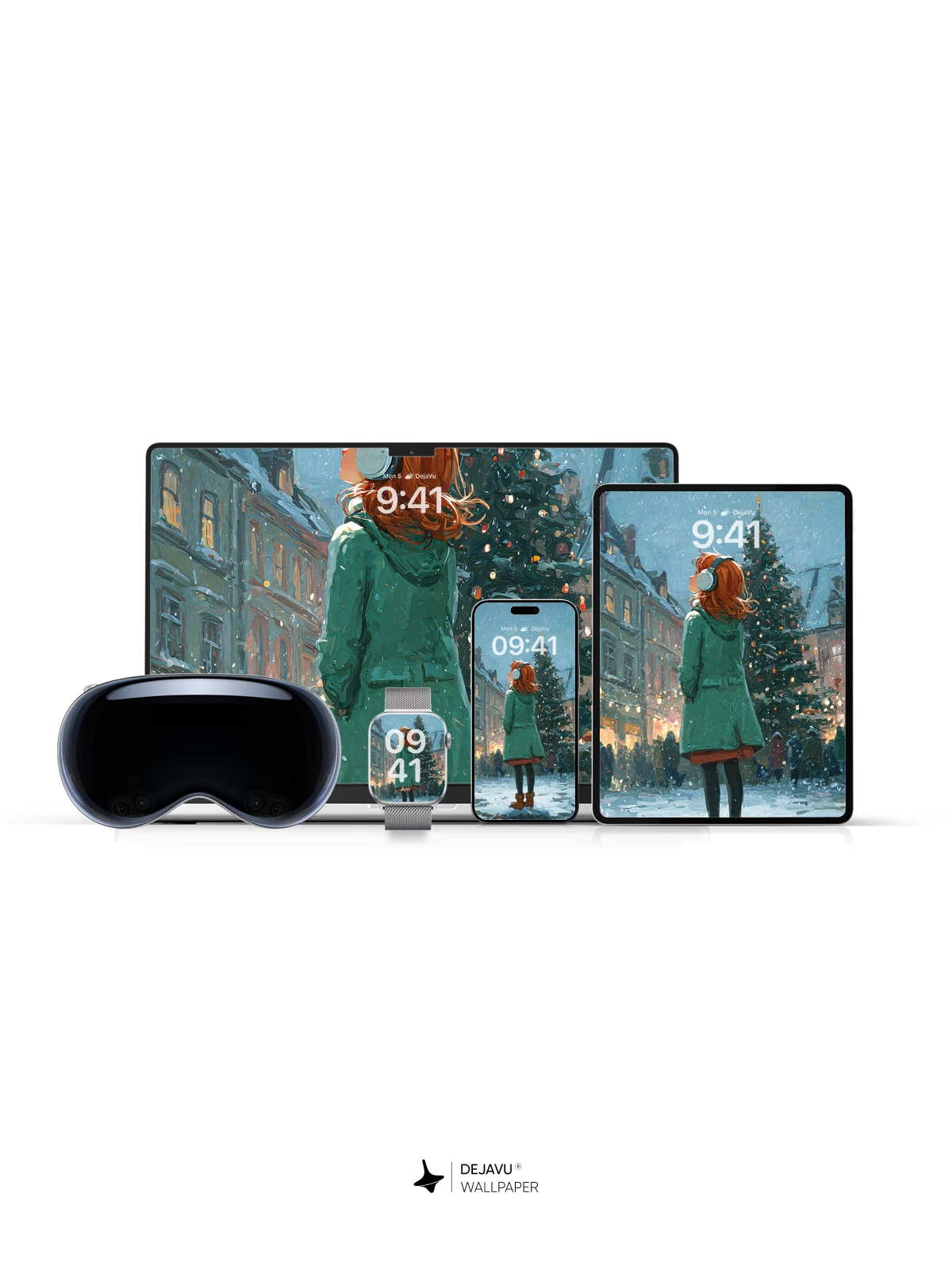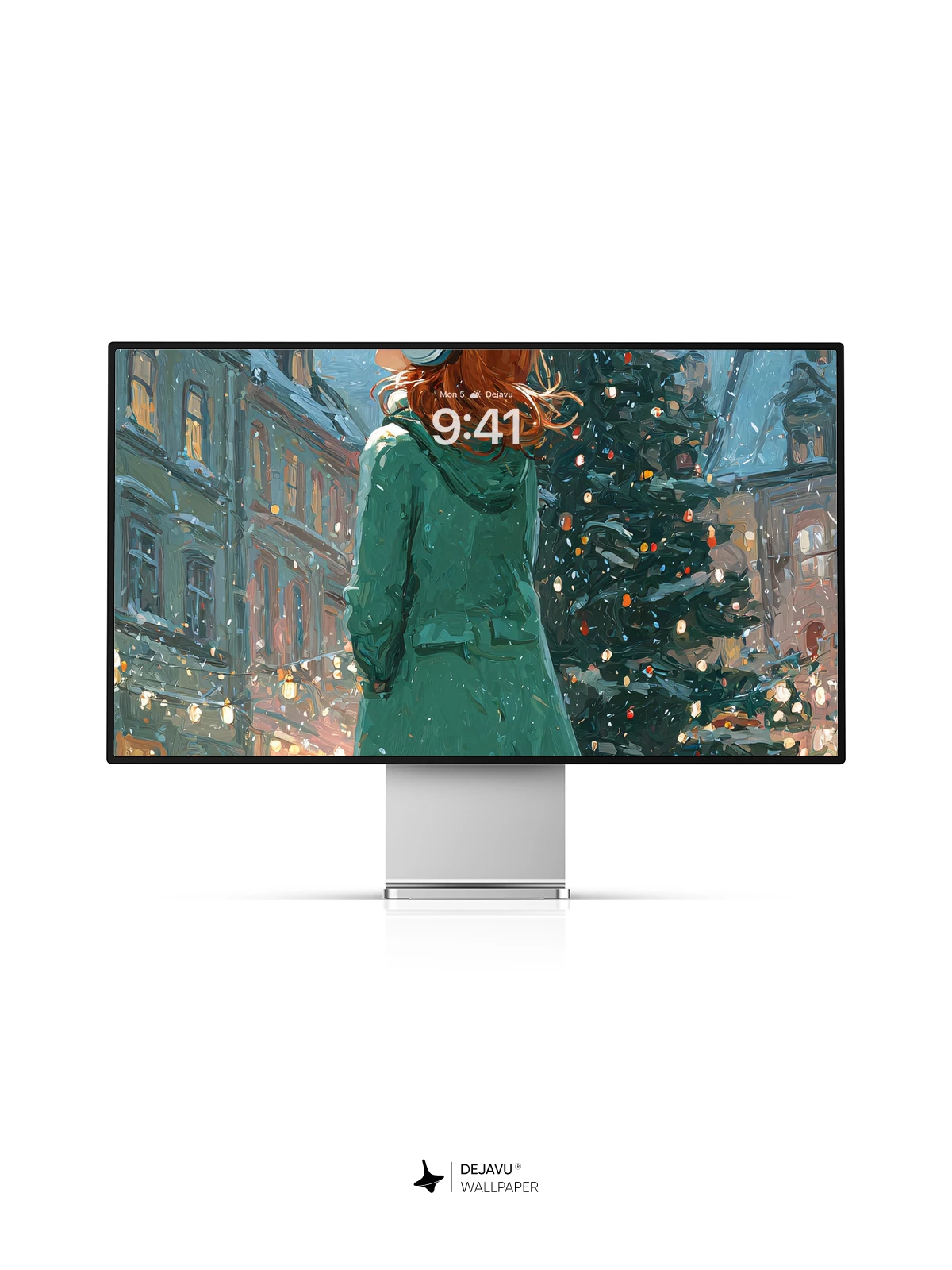 This enchanting 8K wallpaper features a young woman standing in a snowy town square, wrapped in a cozy green coat and headphones, gazing at a radiant Christmas tree. The scene evokes a sense of quiet wonder and holiday magic, with soft snowflakes drifting down and warm lights flickering from nearby buildings. Inspired by painterly realism, the artwork blends emotional depth with rich textures, making it ideal for iPhone, Android, or tablet backgrounds. Immerse yourself in this serene winter moment every time you unlock your device.