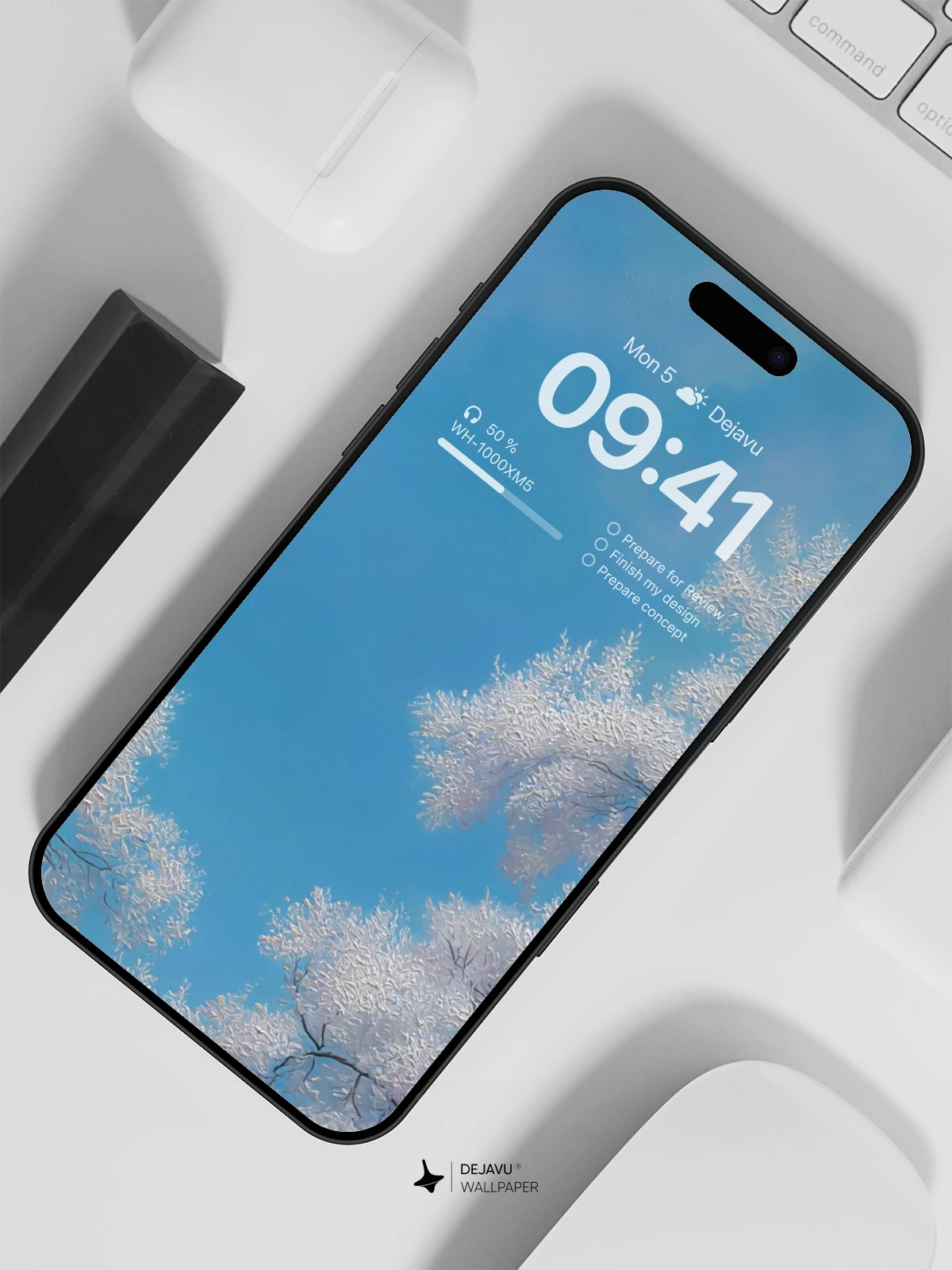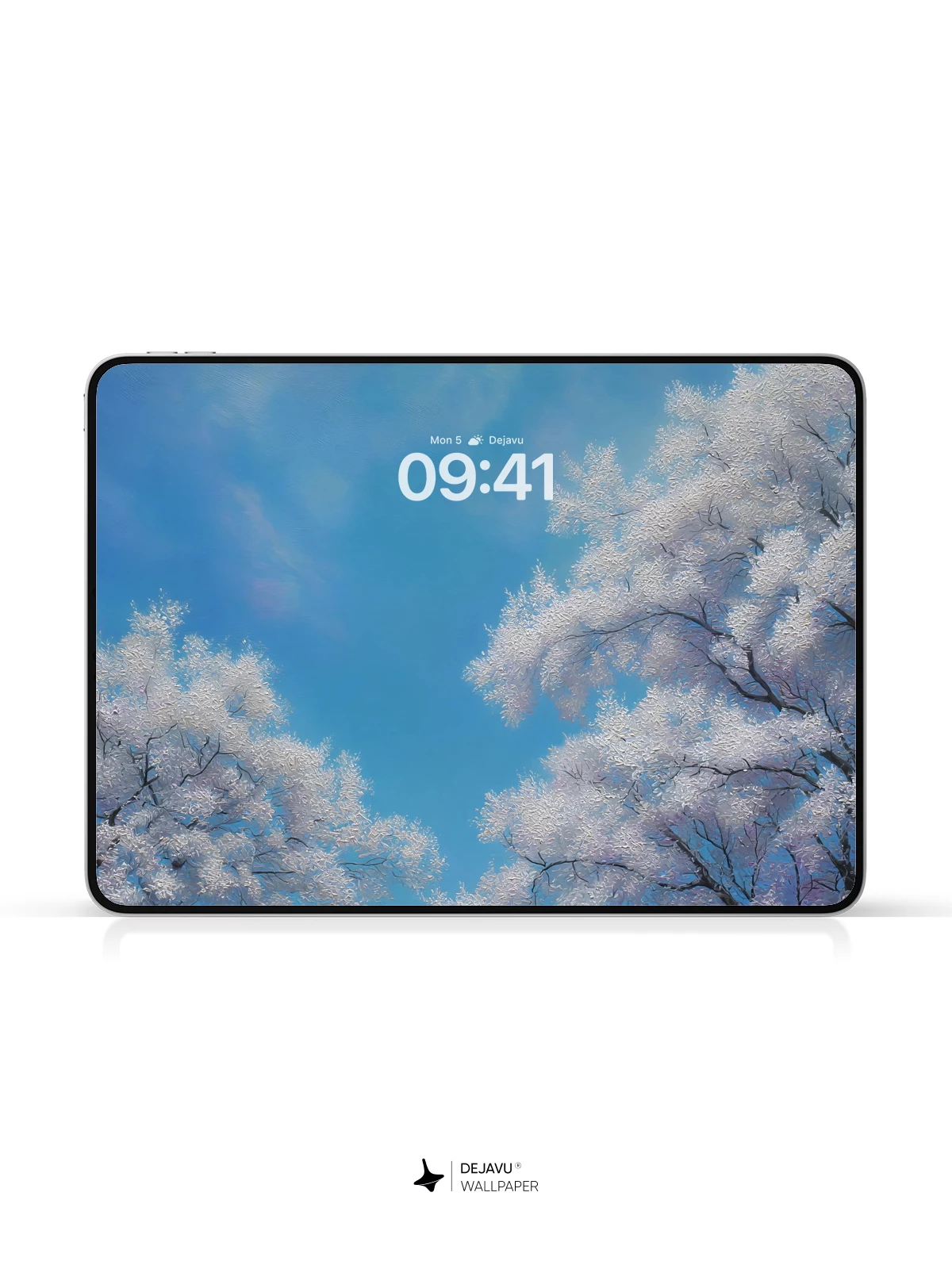 Immerse yourself in the tranquil beauty of winter with this 8K wallpaper. The frost-covered trees and clear blue sky evoke a sense of peaceful solitude, perfect for your iPhone or Android device. This high-resolution image captures the timeless elegance of nature, making it an ideal backdrop for your phone or tablet.