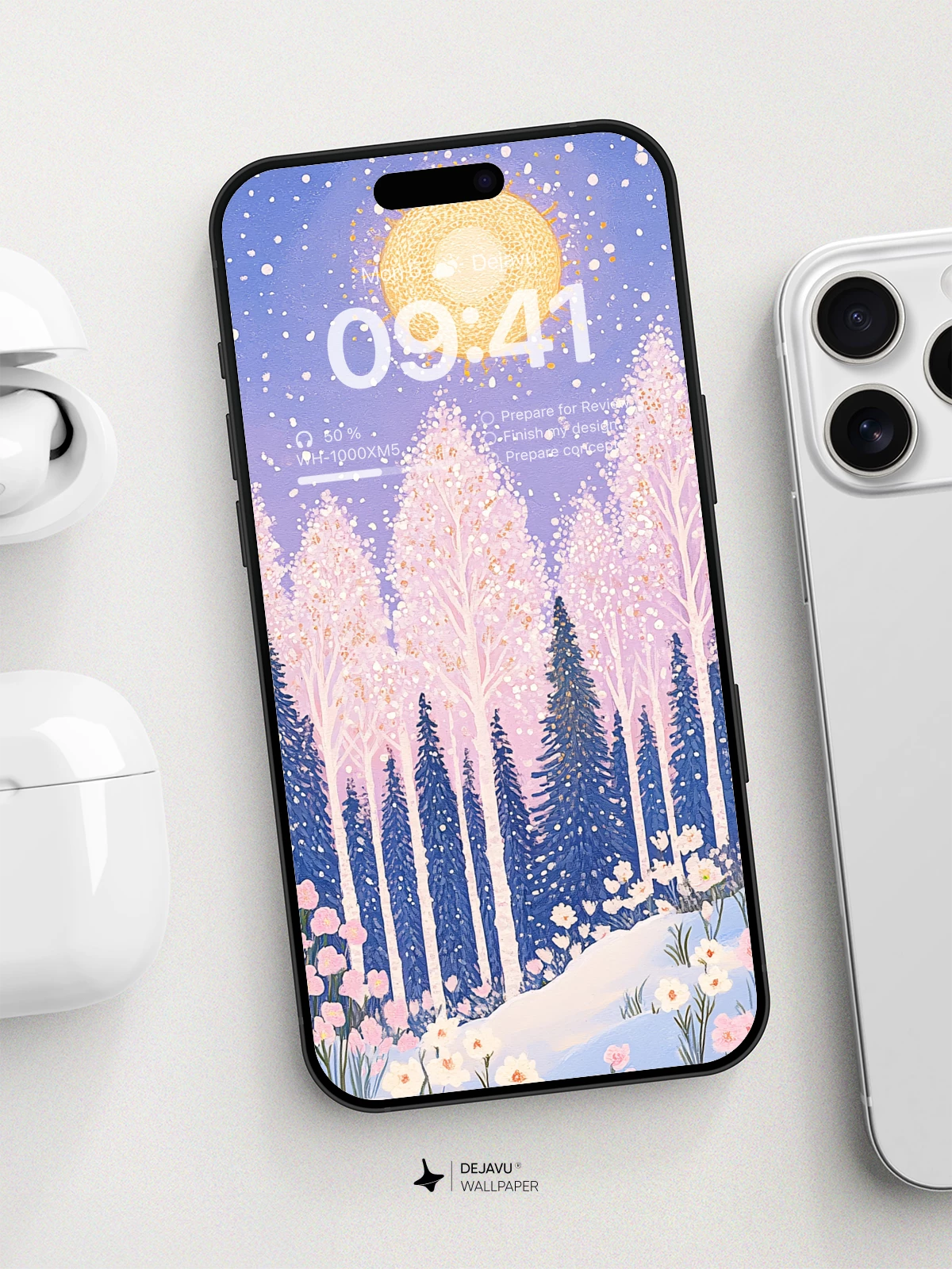 Experience the enchanting beauty of a winter wonderland with this stunning 8K wallpaper, perfect for your iPhone or Android. The artistic design captures a snowy forest illuminated by a radiant golden sun, creating a mesmerizing contrast against the soft pastel hues. Vibrant flowers blooming amidst the frost evoke a sense of timeless beauty and renewal. Ideal for enhancing the visual appeal of your mobile device or tablet, this wallpaper blends natural elegance with creative artistry, transforming your screen into a tranquil, picturesque scene that inspires calm and wonder.
