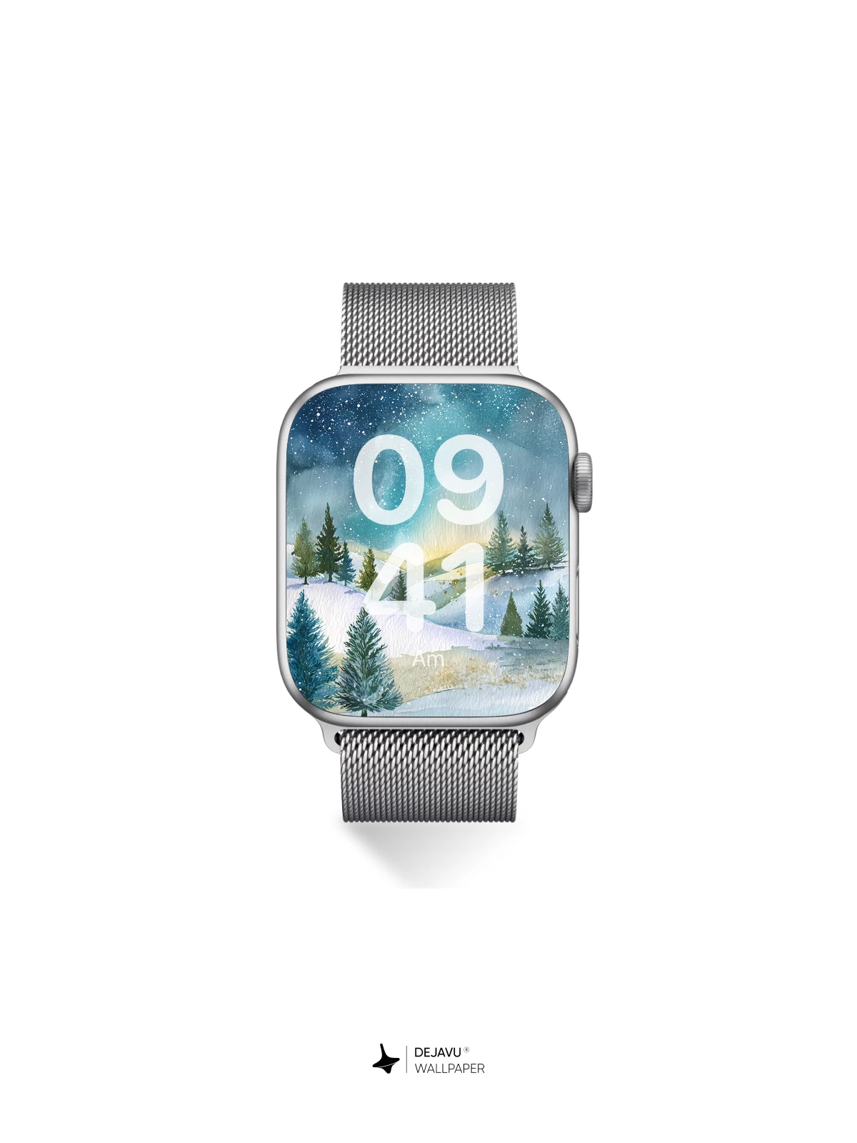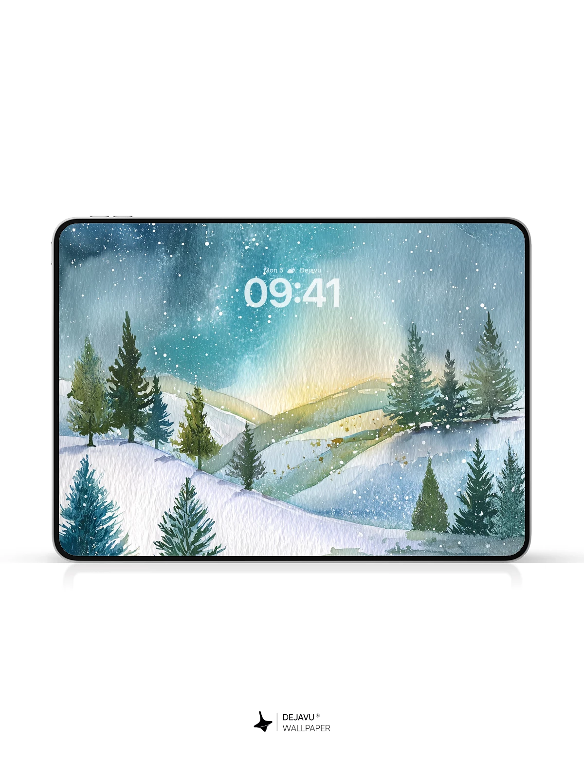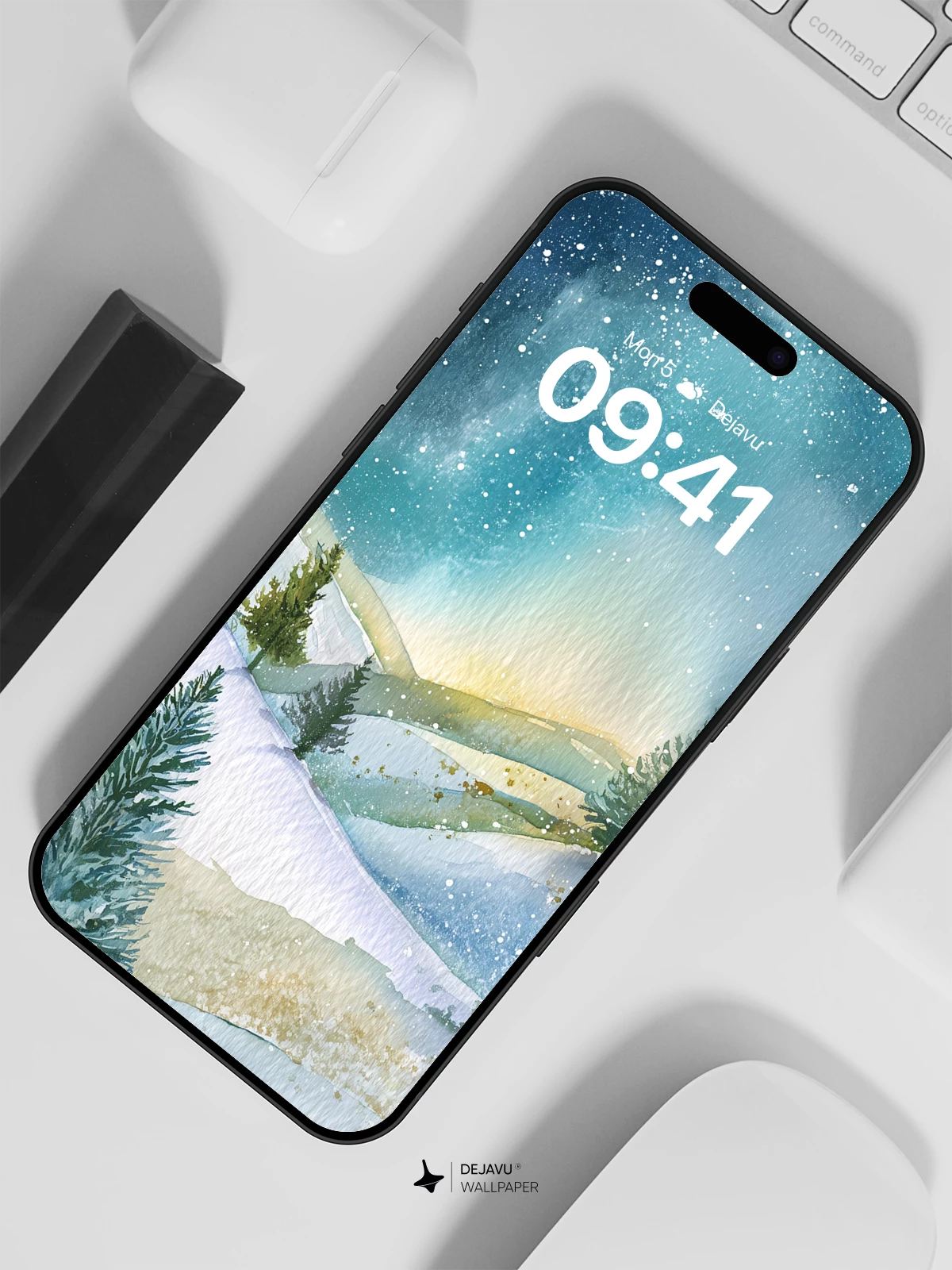 This enchanting winter scene, rendered in soft watercolor hues, captures a tranquil snowy valley dotted with evergreen trees beneath a glowing twilight sky. Snowflakes gently fall, blending with the ethereal glow of distant hills and celestial light. Inspired by the delicate textures and emotional depth of traditional watercolor art, this 8K wallpaper brings a sense of peace and wonder to any iPhone, Android, or tablet screen. Ideal for those who love nature’s quiet magic and artistic elegance.