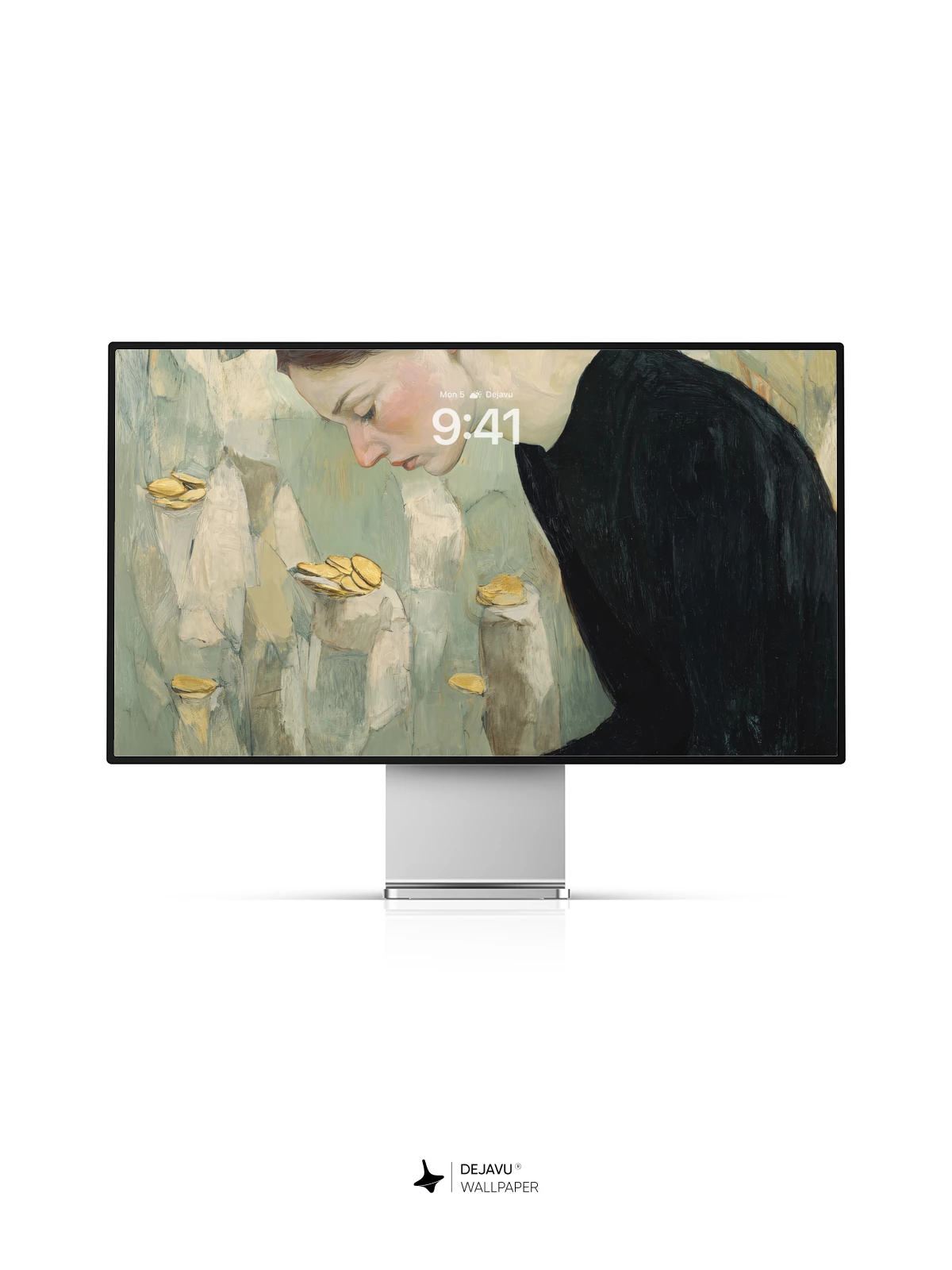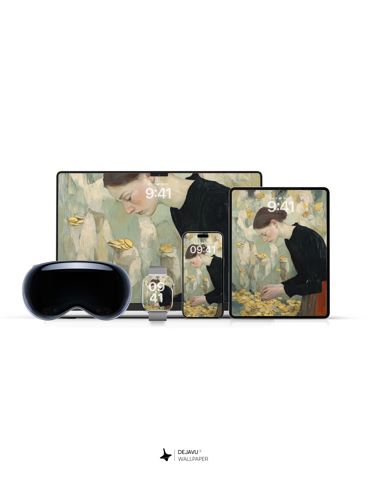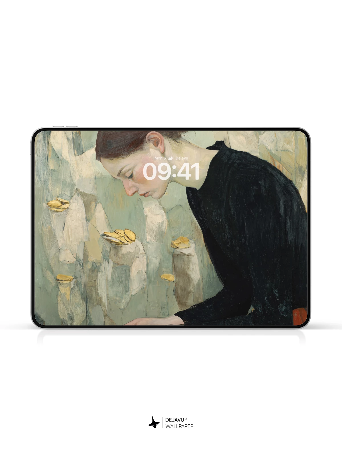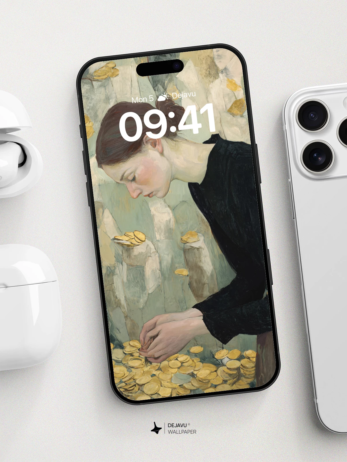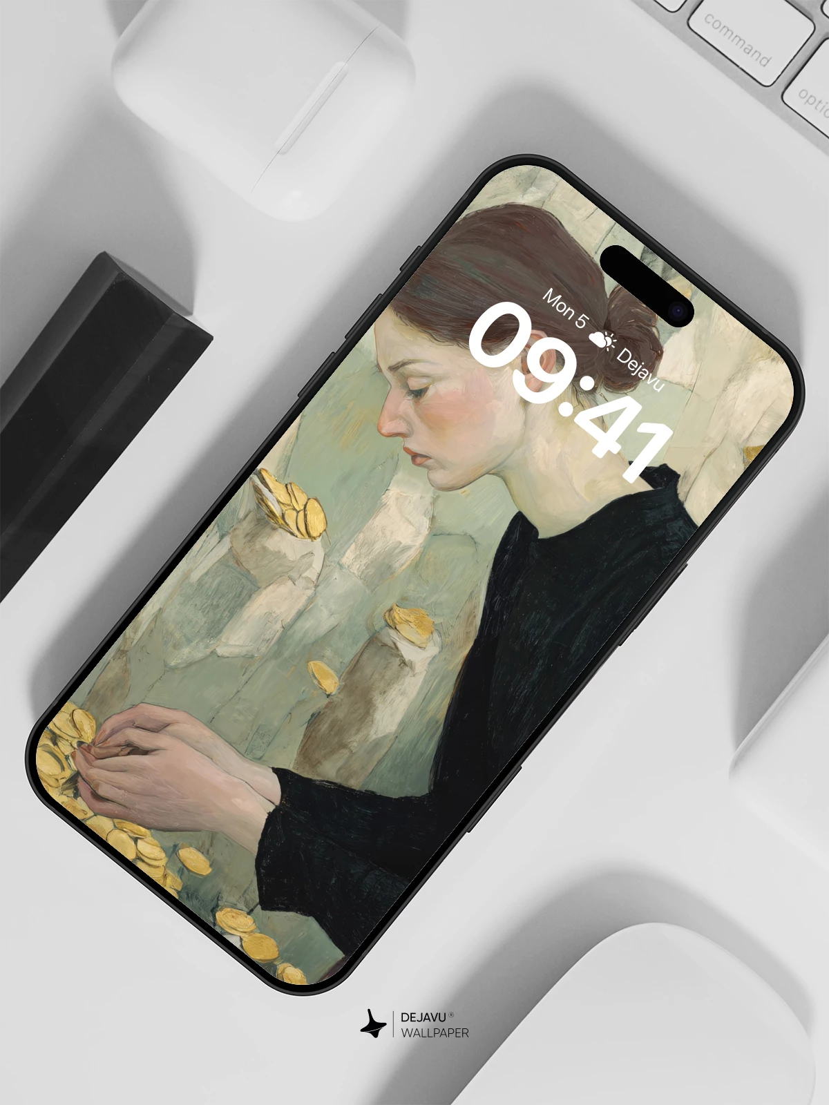 This evocative artwork, reminiscent of early 20th-century modernist portraiture, portrays a contemplative woman immersed in the quiet ritual of counting gold coins. The rich textures and muted palette evoke a sense of timelessness and introspection, while the scattered coins suggest themes of value, labor, and memory. Perfectly suited as an 8K wallpaper for iPhone, Android, or tablets, this image brings a touch of artistic depth and emotional resonance to any mobile device.