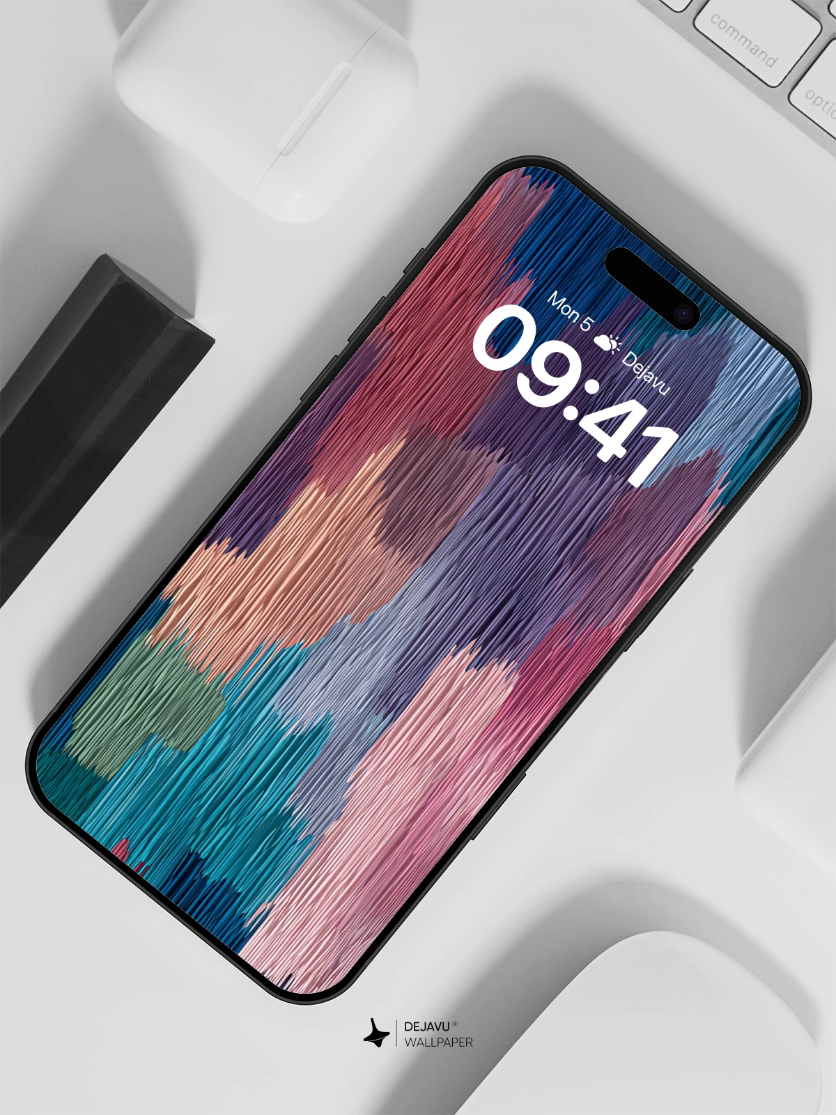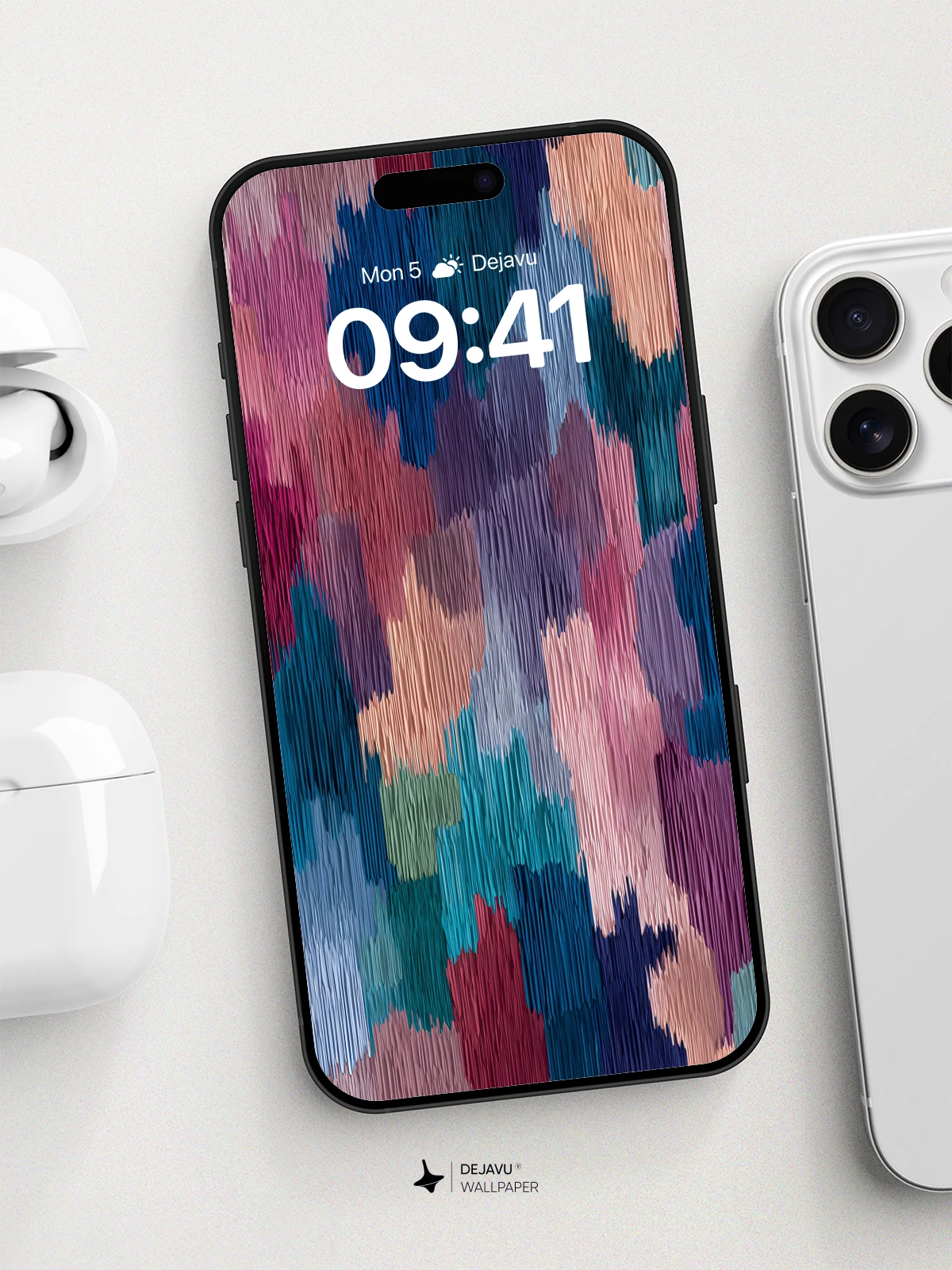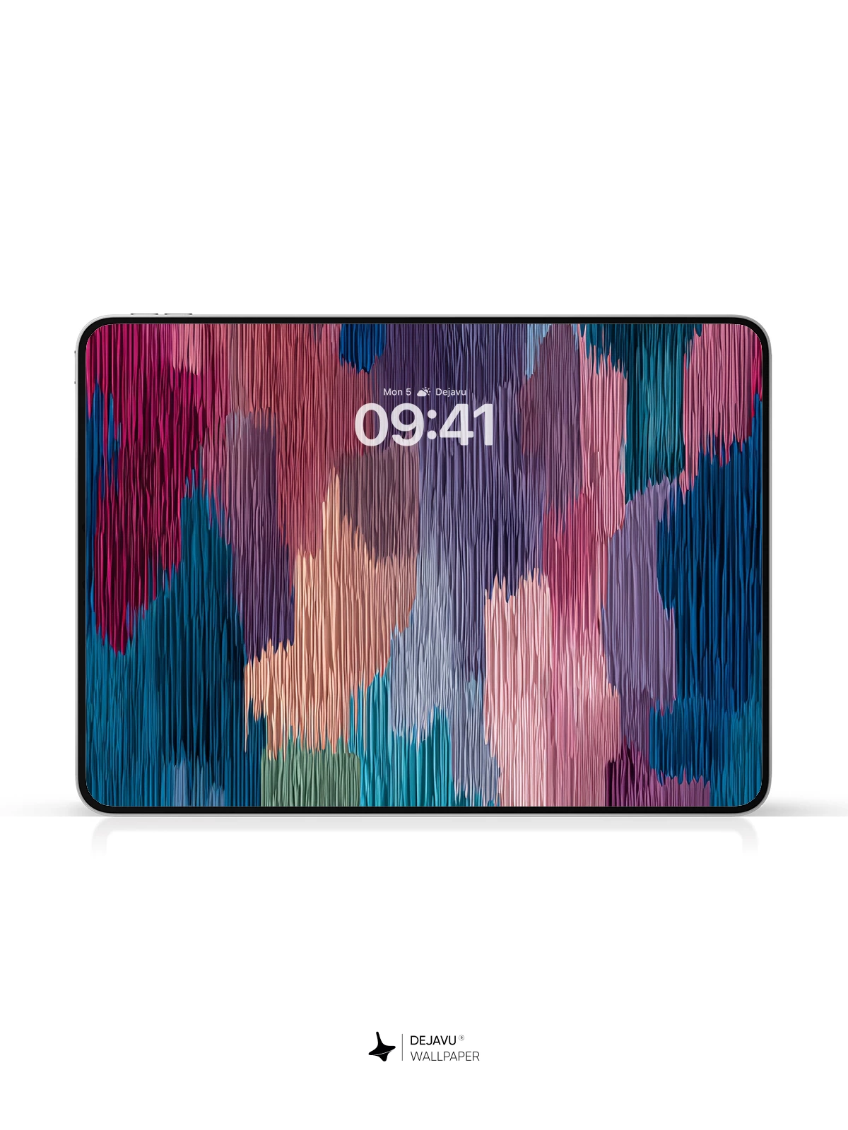 This 8K wallpaper presents a rich, textile-inspired abstract pattern. Vertical striations give the colors a woven, fabric-like quality, blending deep blues and reds with lighter pastels. The composition feels grounded and tactile, offering a sophisticated backdrop for iPhone, Android, or tablet home screens.