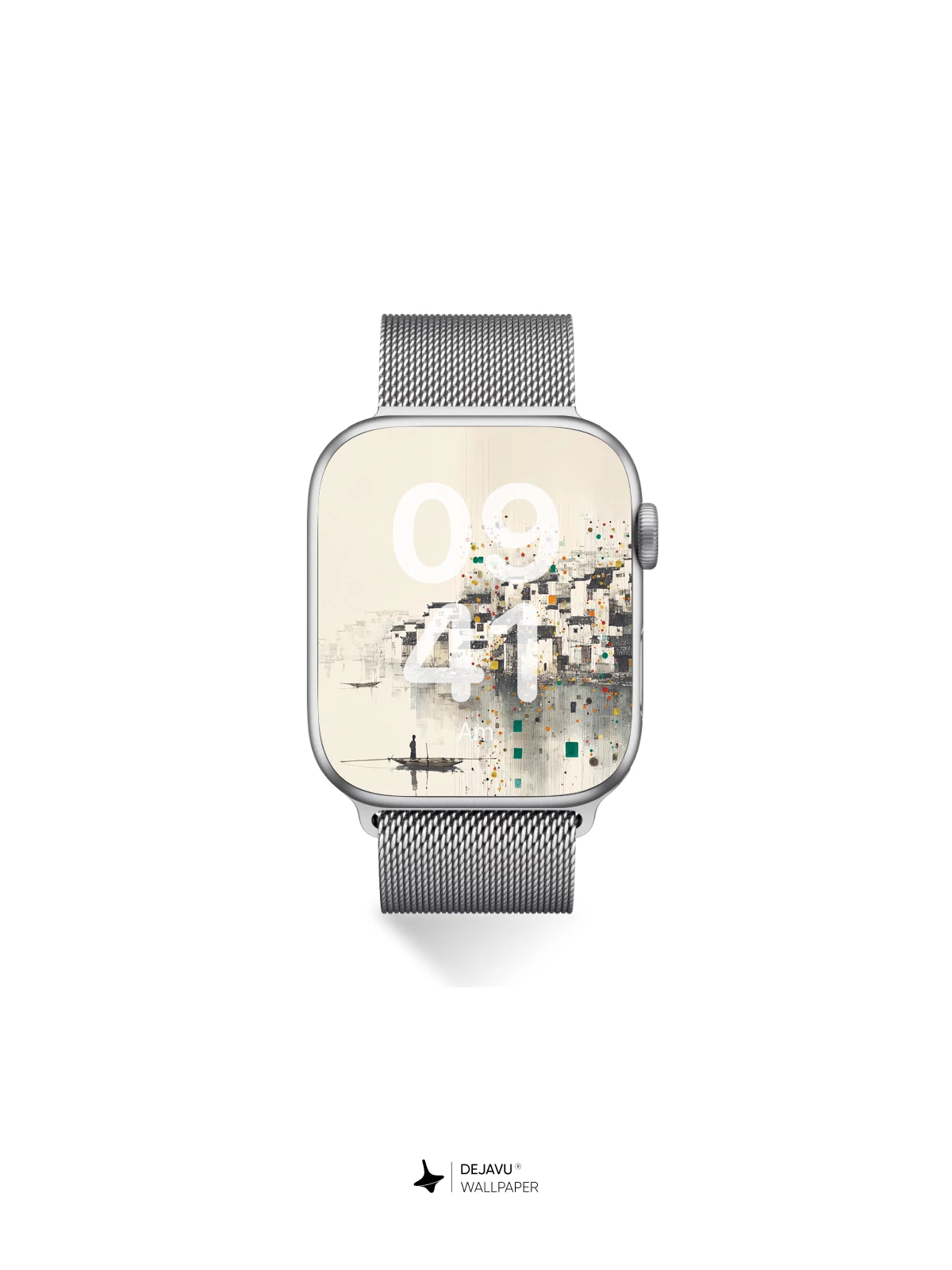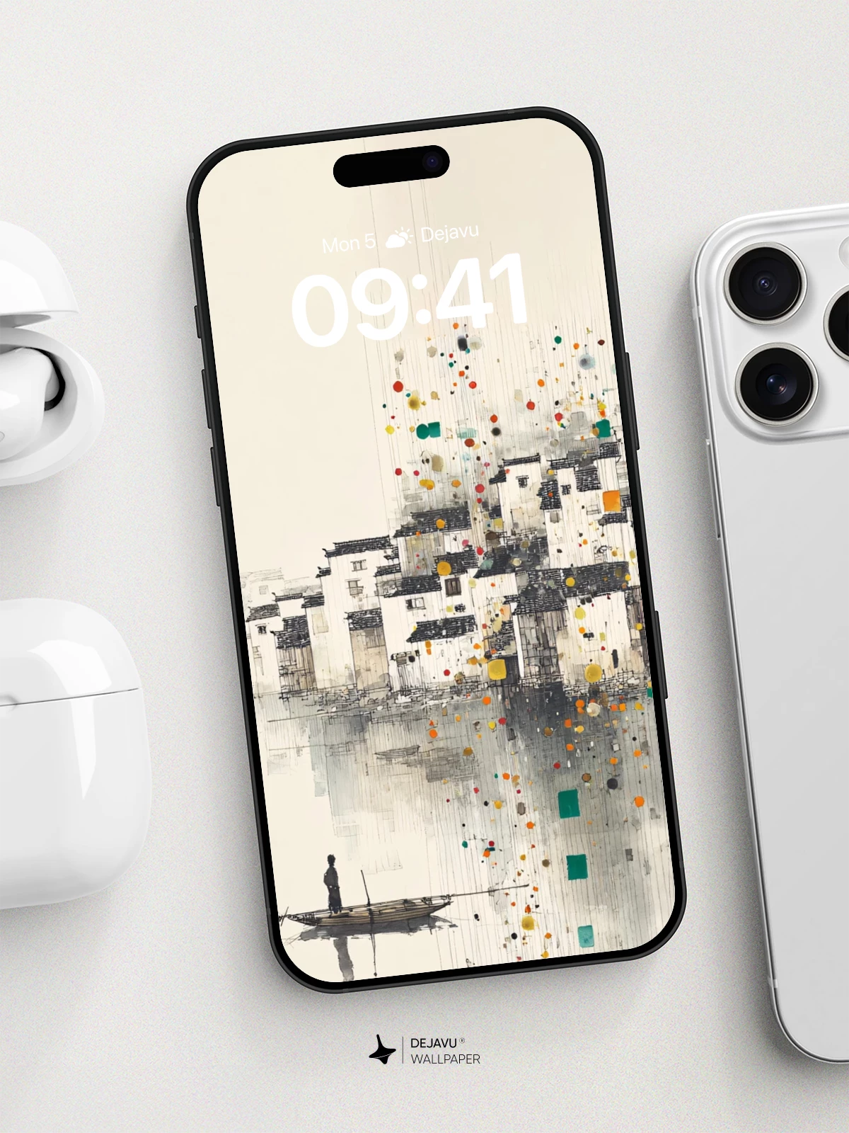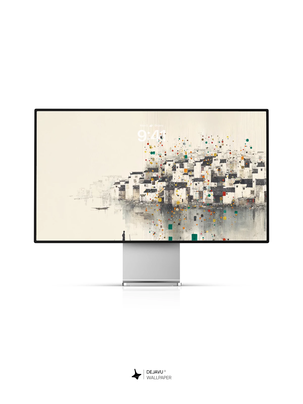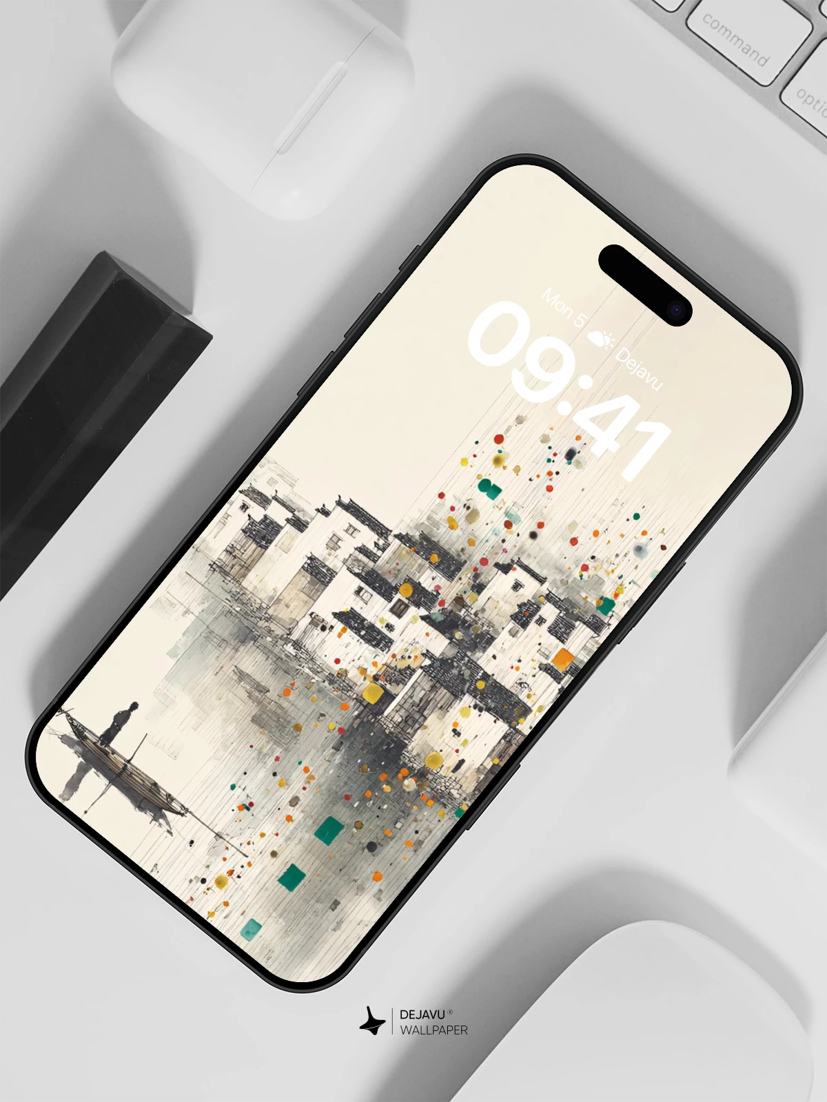 This 8K wallpaper reimagines a traditional Chinese waterside town through a contemporary lens. Inspired by the fluid lines of ink painting and punctuated by colorful, floating dots, it creates a dreamy, textured atmosphere. The high-resolution details look crisp on iPhone, Android, and tablets, turning your device into a canvas of modern Eastern art.