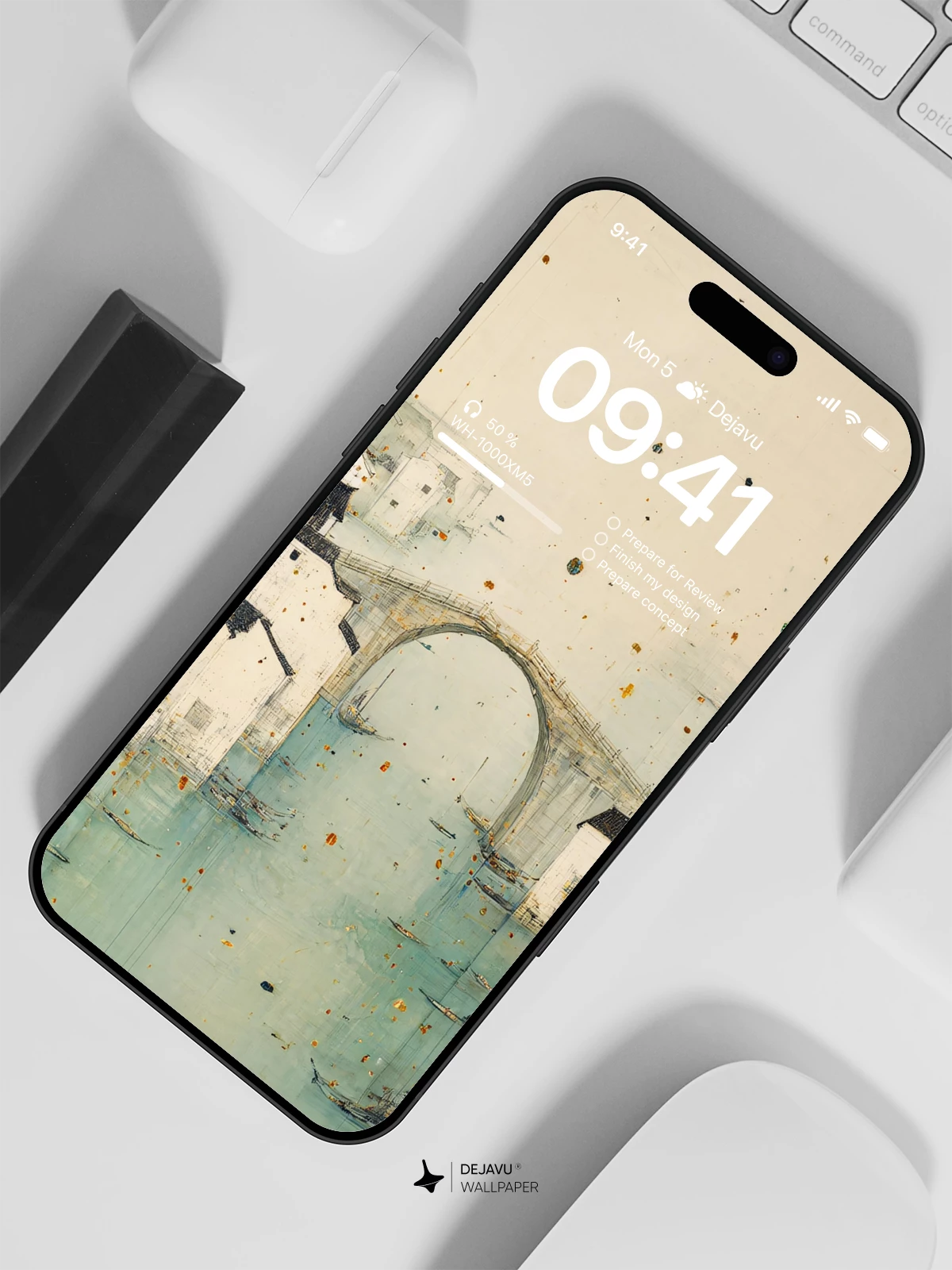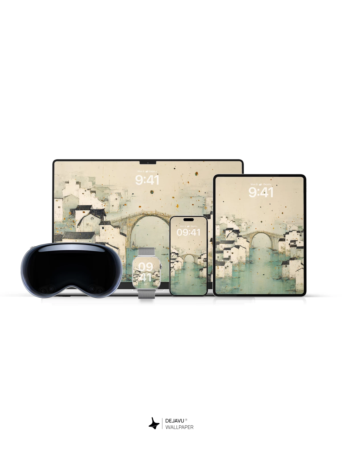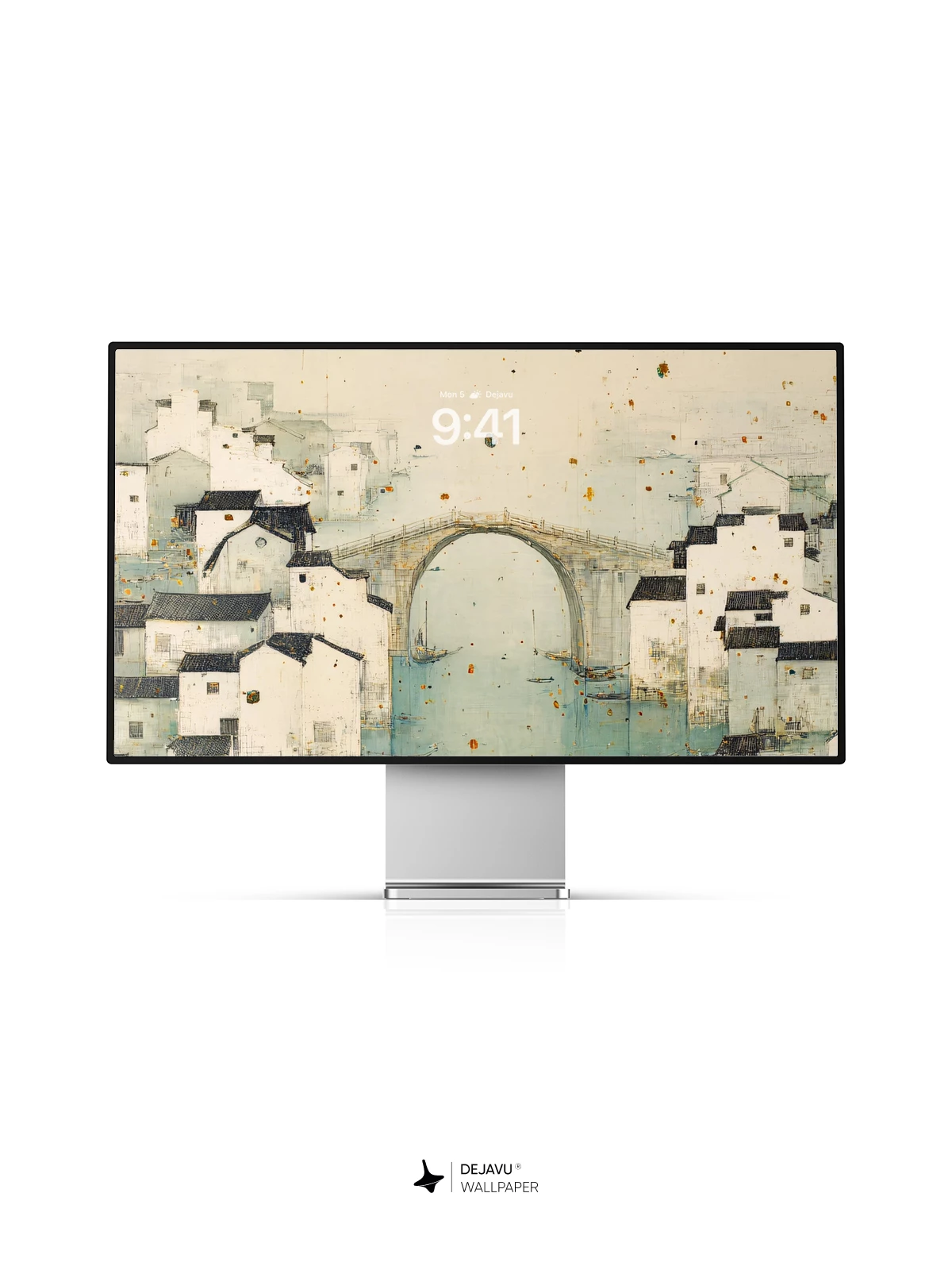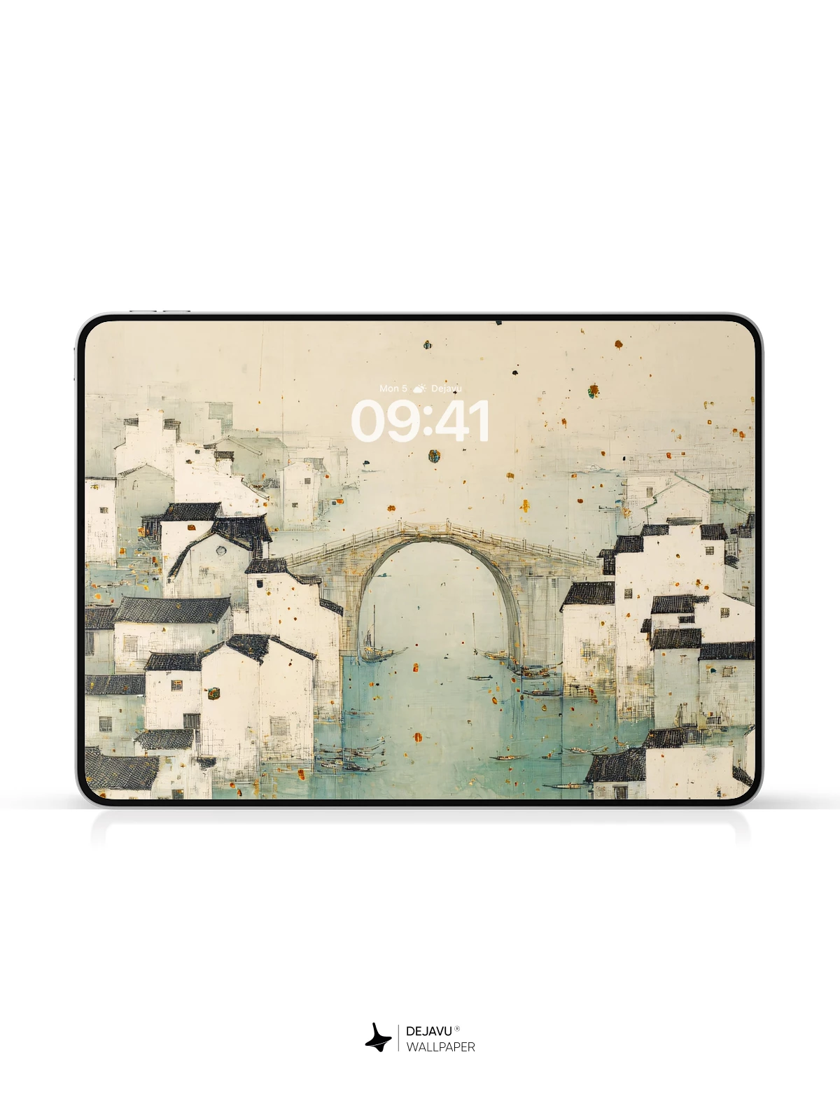 This wallpaper transforms your device with a tranquil scene of a Chinese water town. The composition, featuring white-walled buildings and a central arch bridge over teal water, is reminiscent of Wu Guanzhong’s modern ink-wash paintings. It offers a sophisticated, artistic backdrop that is perfectly scaled for high-resolution displays on iPhones, Androids, and tablets.
